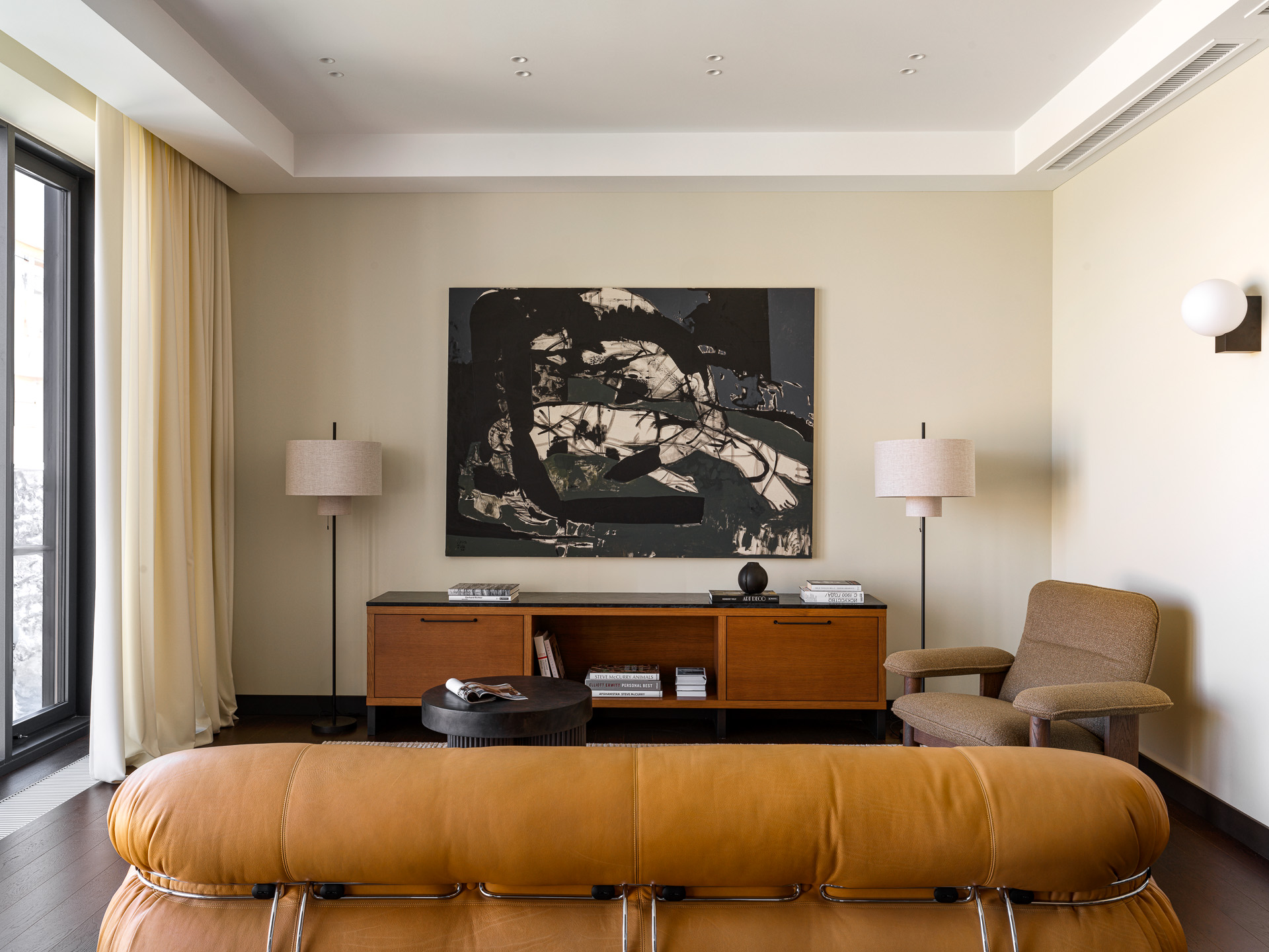 «В этом интерьере много предметов от KOS Studio. Диван в кабинет, кровать, прикроватная тумбочка – так много предметов представлено в коллекции нашего бренда. Центральным элементом гостиной является диван Soriana от Cassina, легендарная работа Афры и Тобио Скарпа 1969 года. Рядом с ним находится кресло Brasilia датского бренда Audo: смесь скандинавской эстетики середины века и бразильского модернизма. Пара торшеров Margin от New Works – прием, позаимствованный из американских интерьеров: они прекрасно поддерживают ось гостиной и равномерно освещают пространство с обеих сторон. Обеденный стол и кухня были выполнены по эскизам мастерской, а завершающими штрихами этого выдержанного и лаконичного интерьера стали картина Алены Гиль и скульптура Ольги Орсик.
