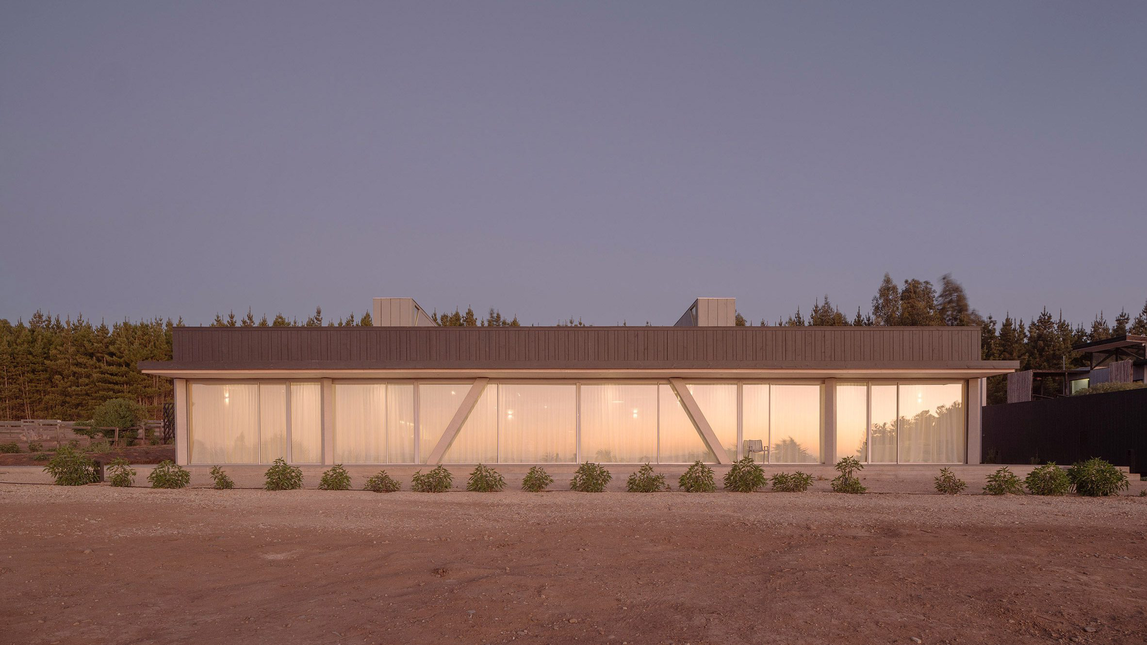 Швейцарское бюро Emergentes Architects Sàrl спроектировало пляжный домик на тихоокеанском побережье в Чили. Его особенность заключается в необычной планировке: здание представляет собой трапецию, длинная сторона которой обращена к воде.