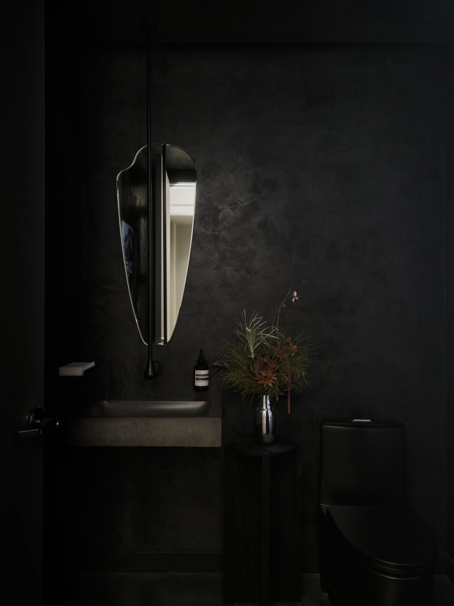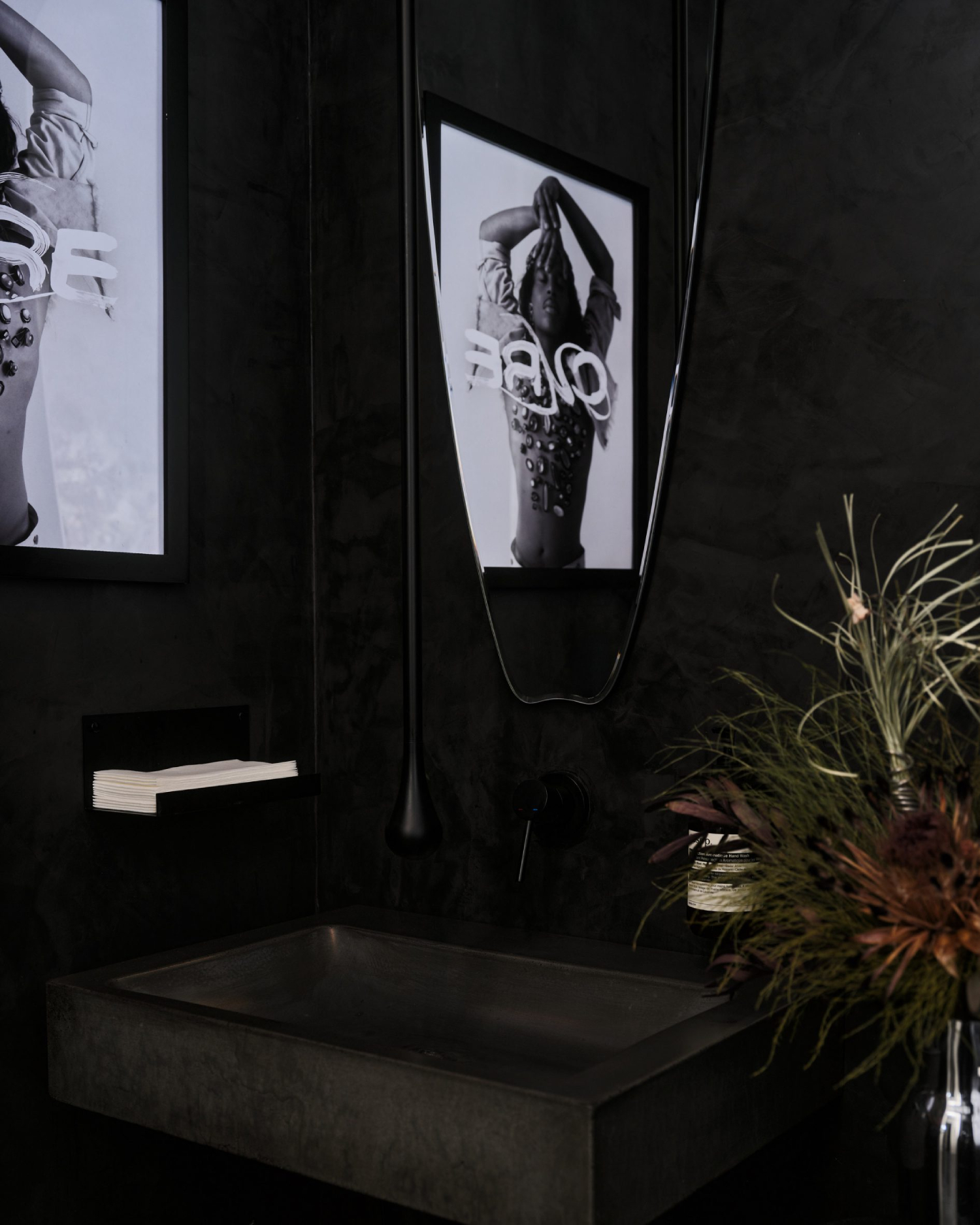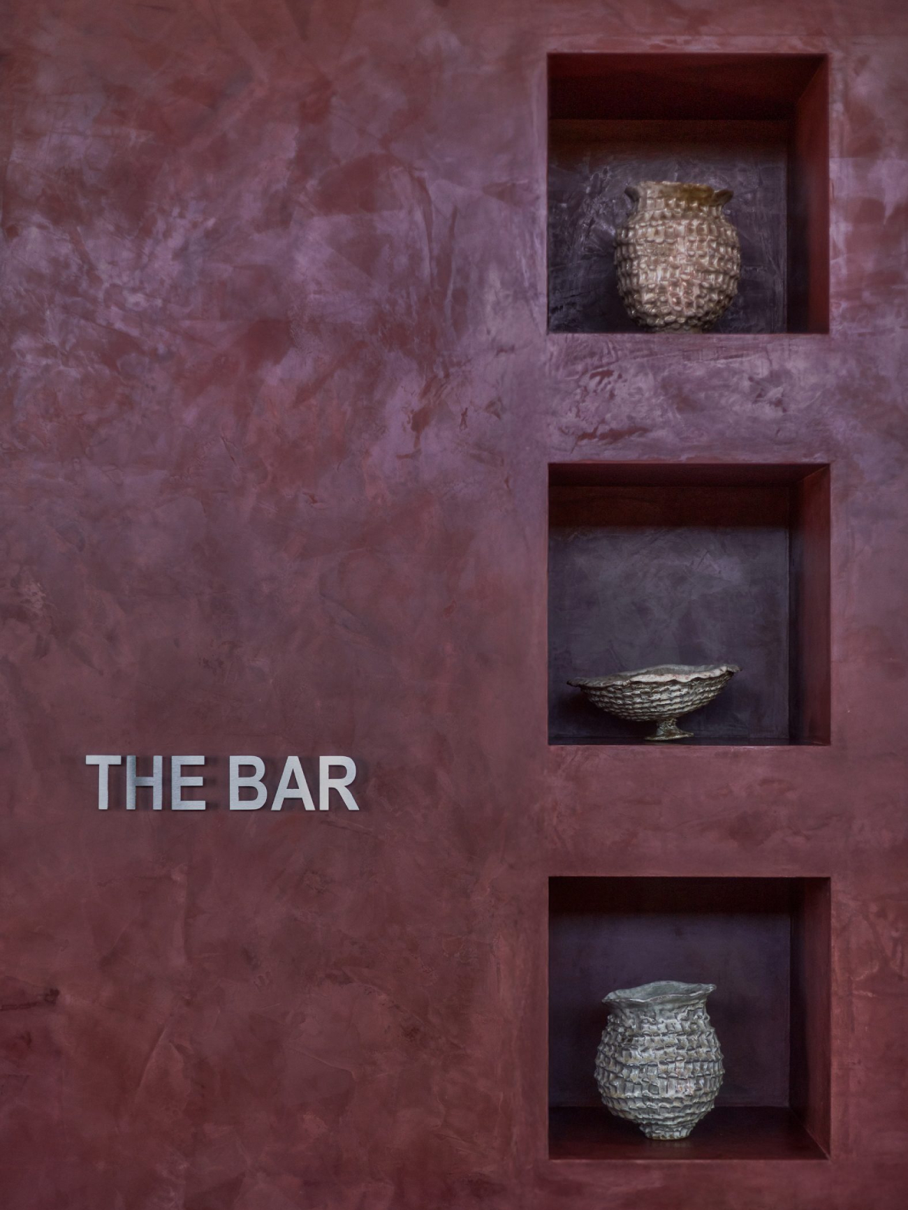 Робинсон обратился к дизайнеру Тиффани Томпсон из Duett Interiors, чтобы спроектировать пространство, которое «сочетает в себе функциональность с артистизмом». По мнению авторов проекта, концепция интерьера основана на сочетании минималистического стиля, присущего современным галереям, и богатства фактур. Двойственность подчеркивает и цветовой контраст между насыщенными бордовыми и светло-серыми тонами. Глянцевый пол и барная стойка зеркально повторяют металлические табуреты Zieta Studio с «дутым» силуэтом – это придает пространству дополнительный объем.