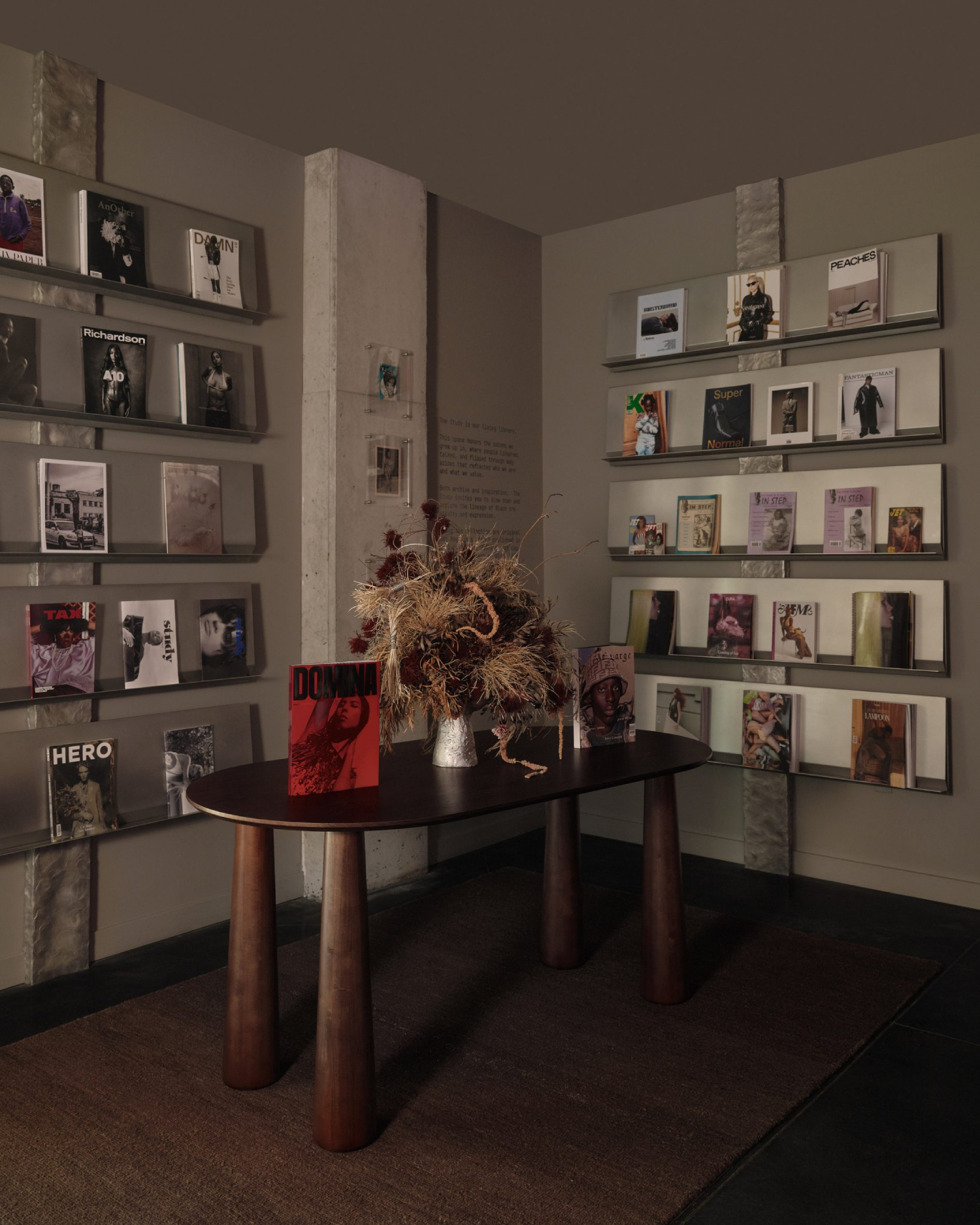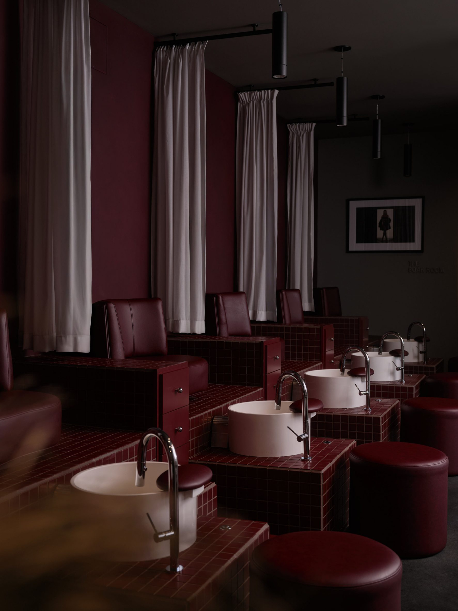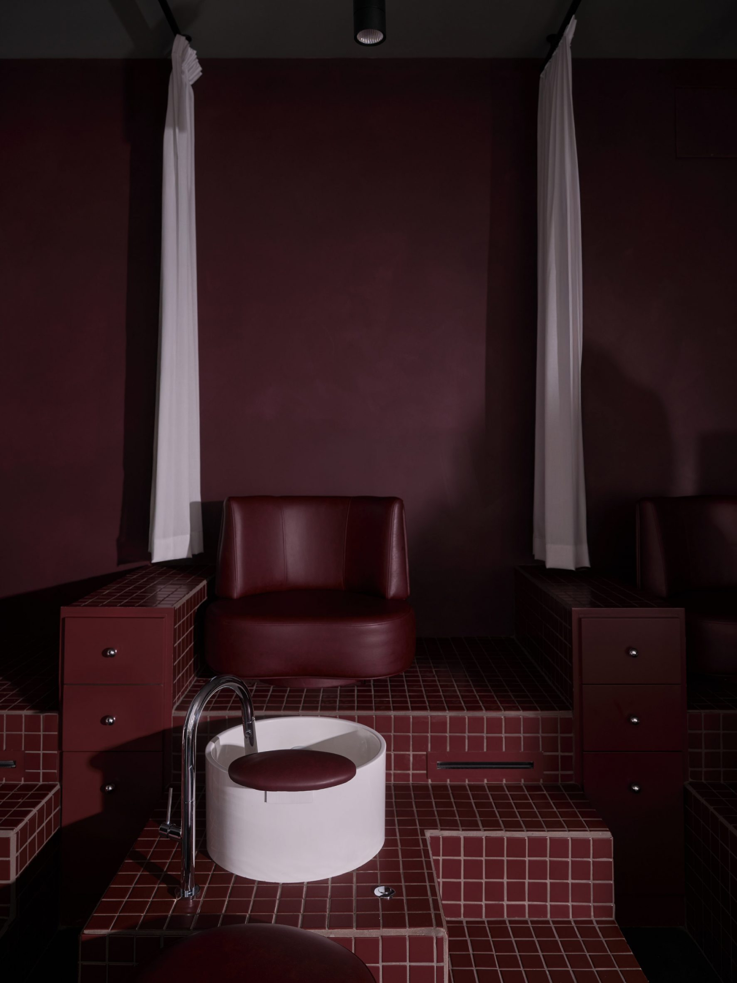 В зале ожидания разместили полки с журналами и книгами по дизайну и искусству. Арочную нишу, где расположены раковины, дополняет светильник-контрбаланс от Ladies & Gentlemen Studio – он выглядит как динамичный арт-объект внутри галерейного пространства. Cure Nailhouse также служит галереей: в салоне представлены работы начинающих и признанных художников, посвященных красоте. Здесь каждый квартал проходят арт-ярмарки, публичные мастер-классы и небольшие выставки, объединяющие представителей индустрии красоты, моды и современного искусства. Команда проекта подчеркивает, что эти инициативы призваны поддержать культурную преемственность, радикальное самовыражение и творческое экспериментирование.