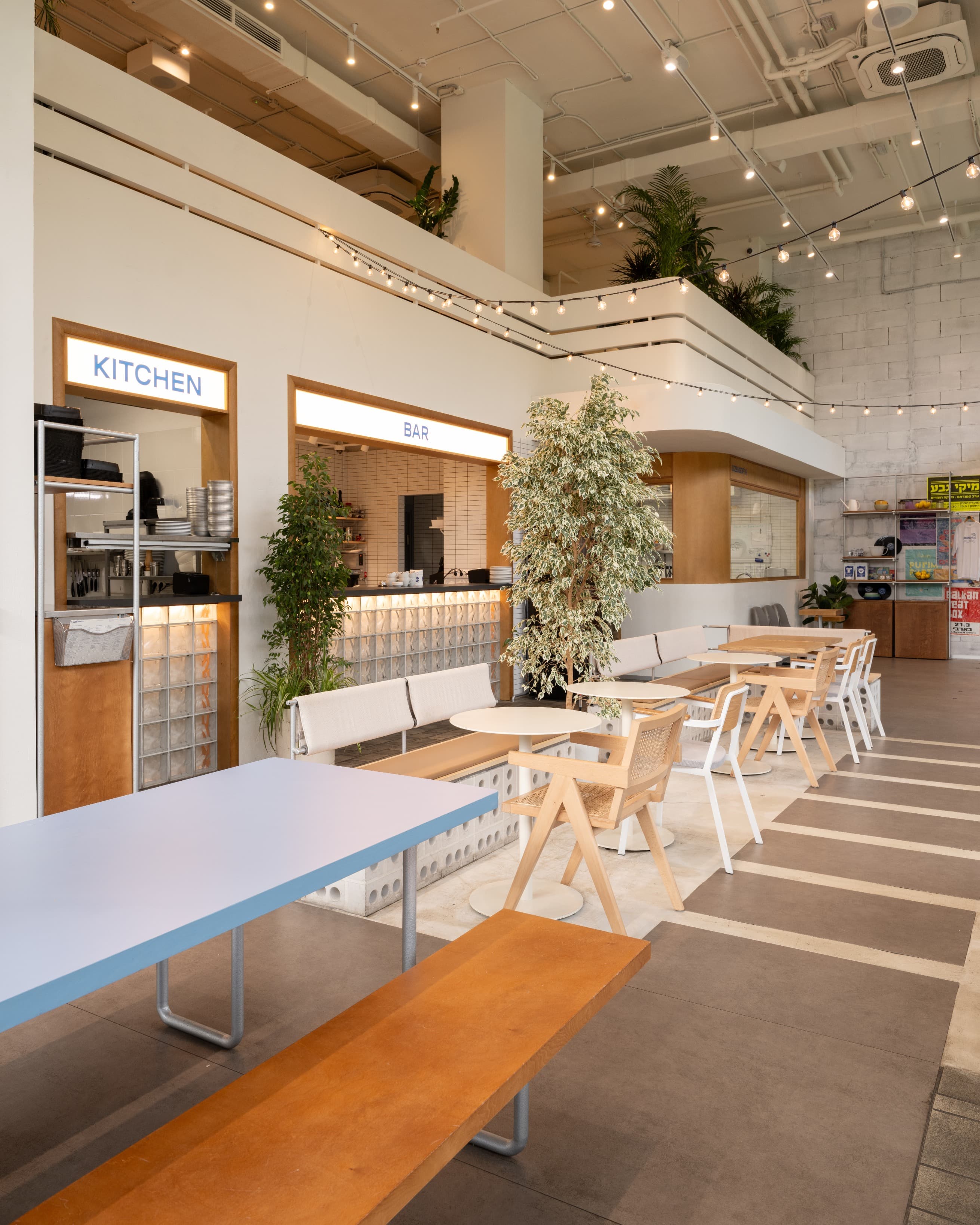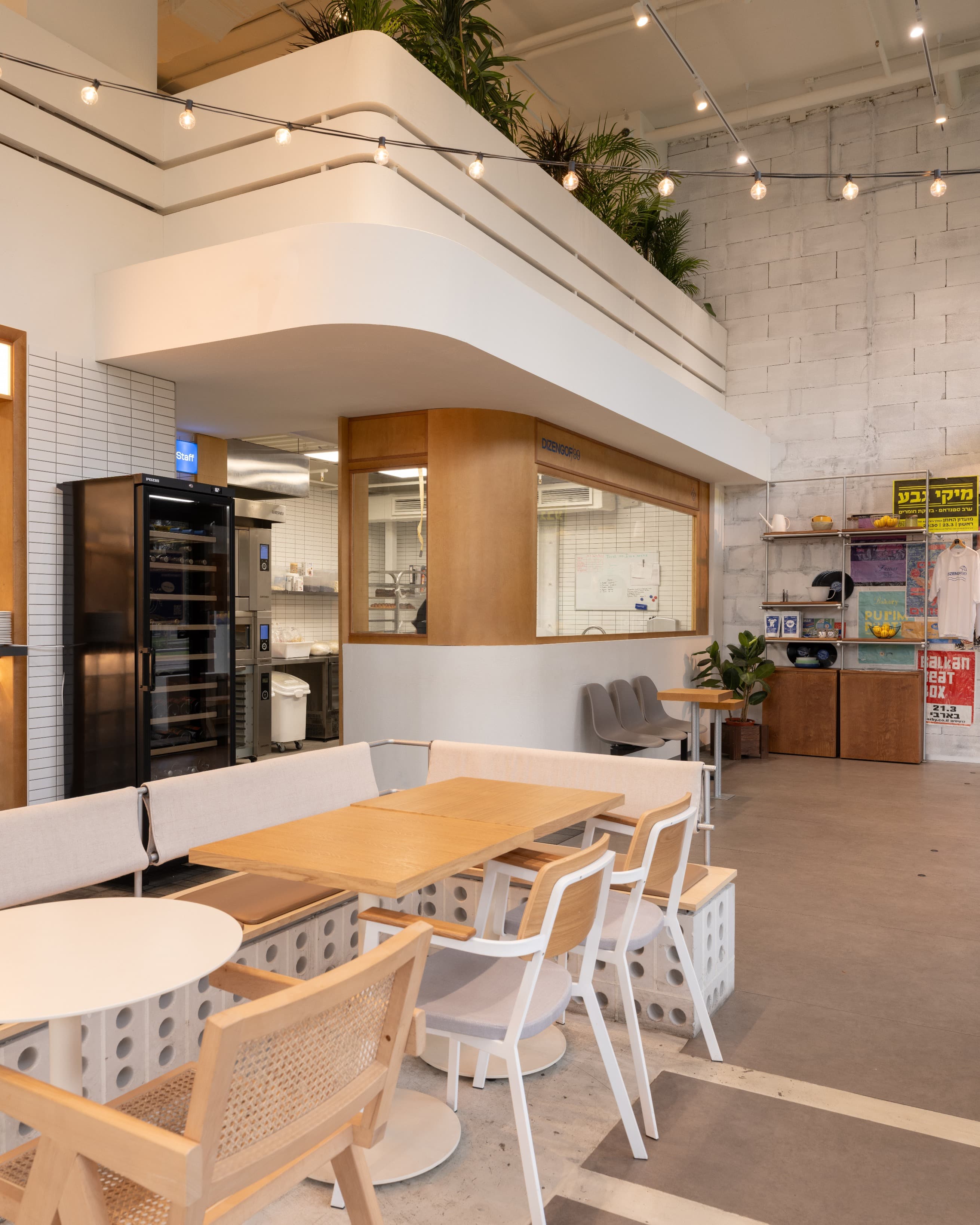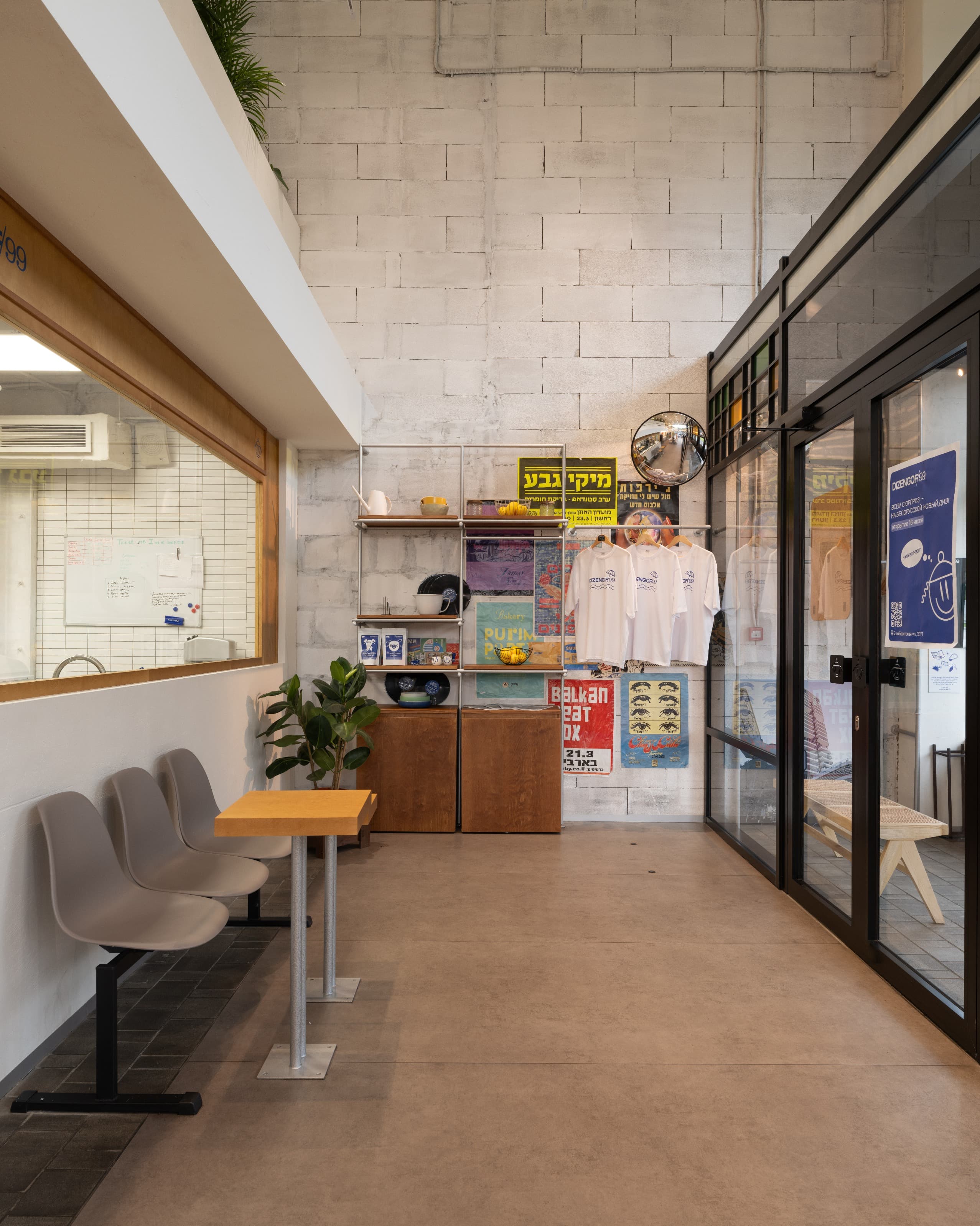 «Материалы были выбраны, чтобы подчеркнуть эстетику Тель-Авива, где в интерьерах ценят не идеальную отделку, а ощущение жизни и естественного старения. В проекте использованы шпон, фанера, плитка и фасадная штукатурка, брусчатка на полу первого этажа и виниловый паркет на втором этаже. Особого внимания заслуживает использование строительных материалов в мебели: скамейки изготовлены из пустотелого бетонного кирпича, что позволяет сохранить эстетику Тель-Авива. низкий бюджет, но при этом добавляет аутентичности.