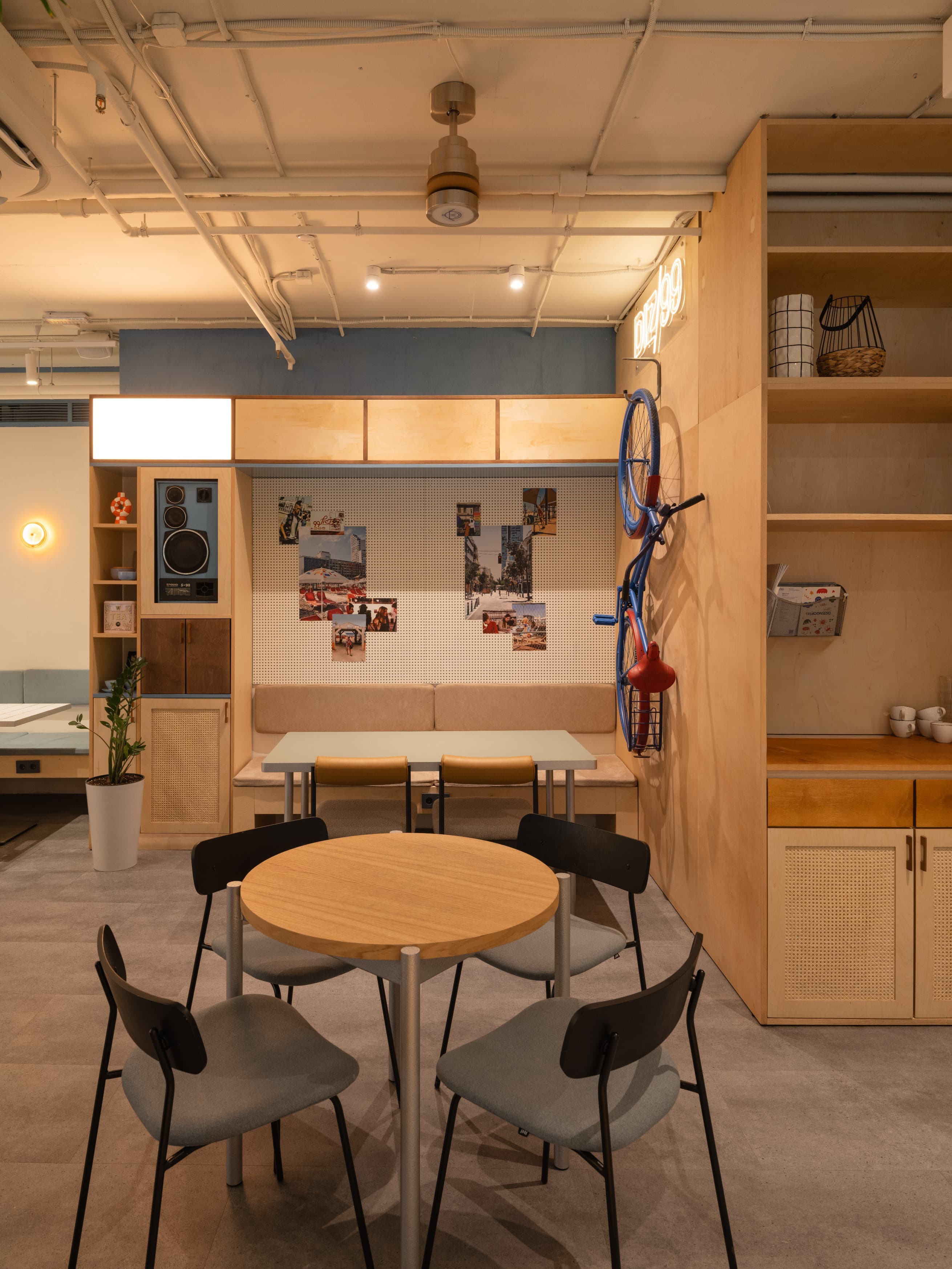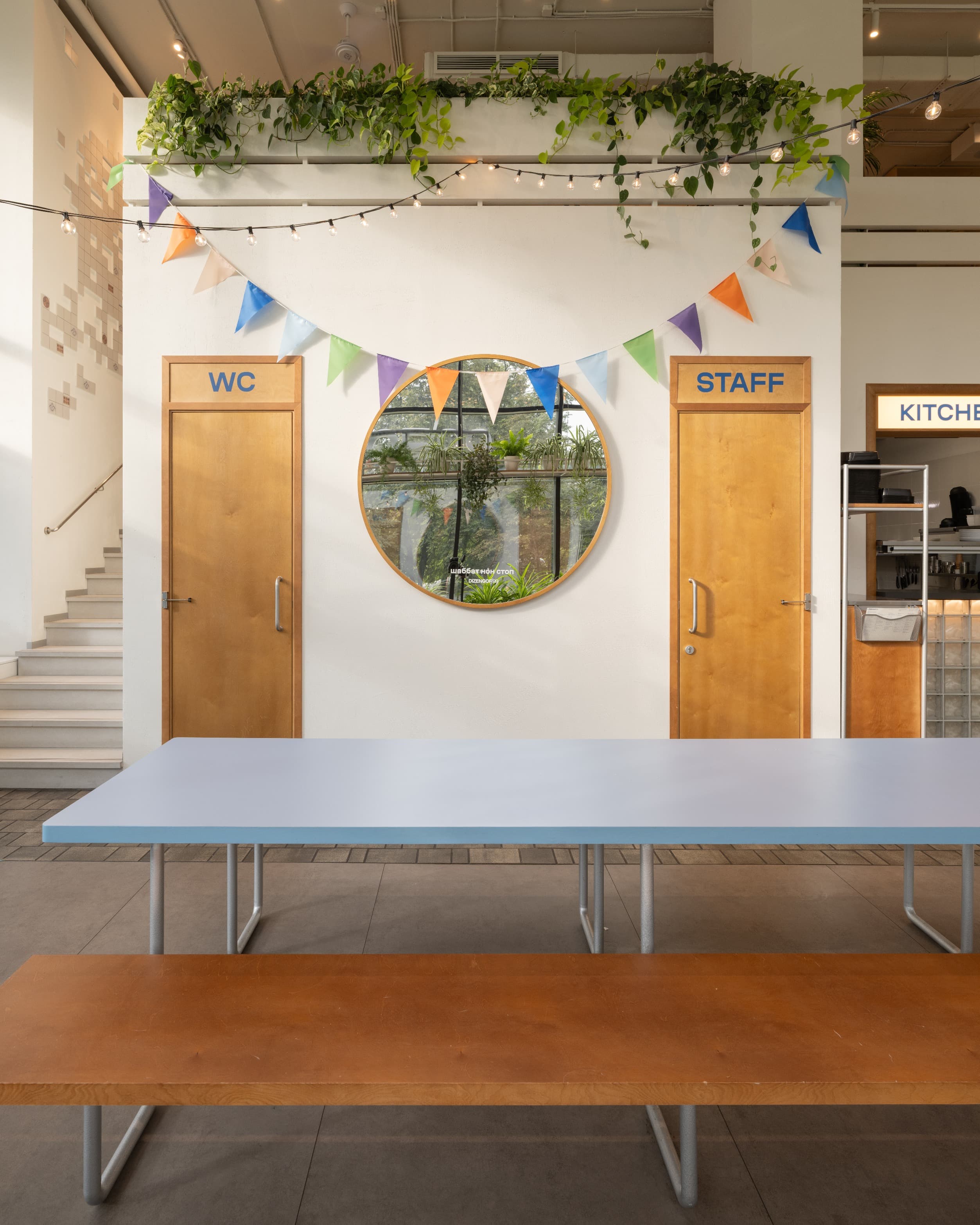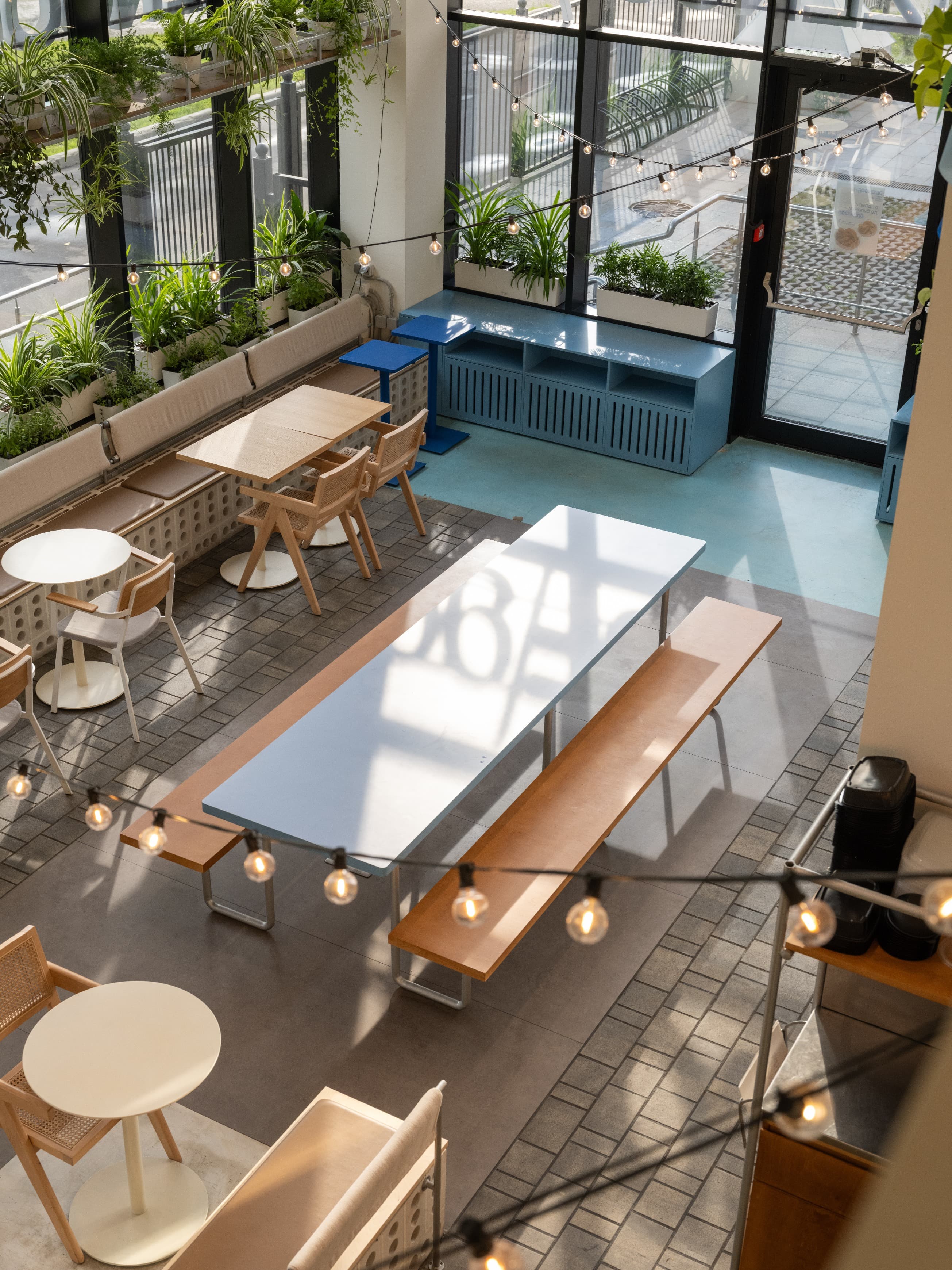 «Материалы были выбраны, чтобы подчеркнуть эстетику Тель-Авива, где в интерьерах ценят не идеальную отделку, а ощущение жизни и естественного старения. В проекте использованы шпон, фанера, плитка и фасадная штукатурка, брусчатка на полу первого этажа и виниловый паркет на втором этаже. Особого внимания заслуживает использование строительных материалов в мебели: скамейки изготовлены из пустотелого бетонного кирпича, что позволяет сохранить эстетику Тель-Авива. низкий бюджет, но при этом добавляет аутентичности.