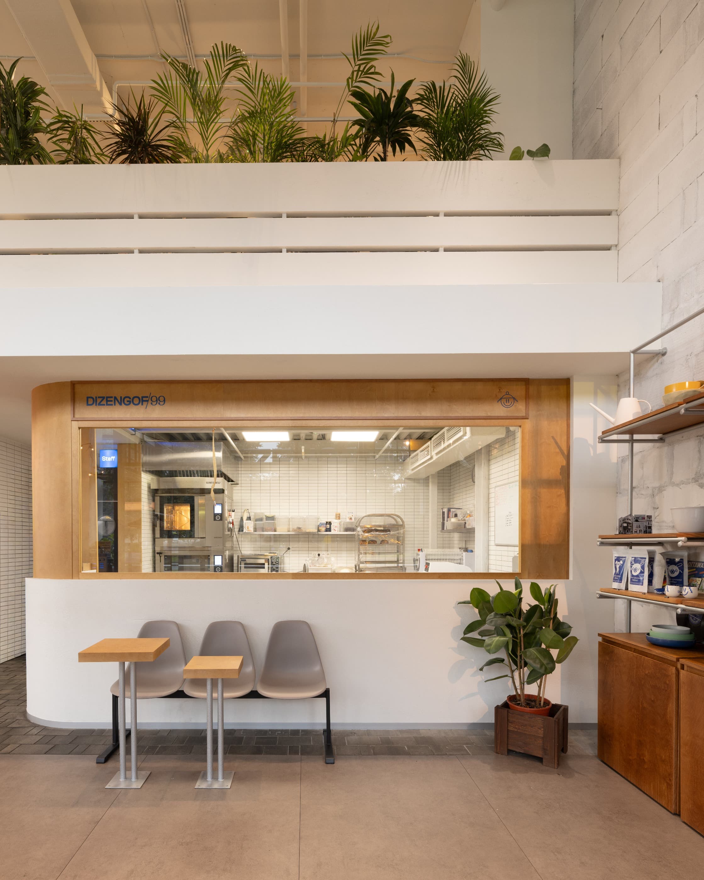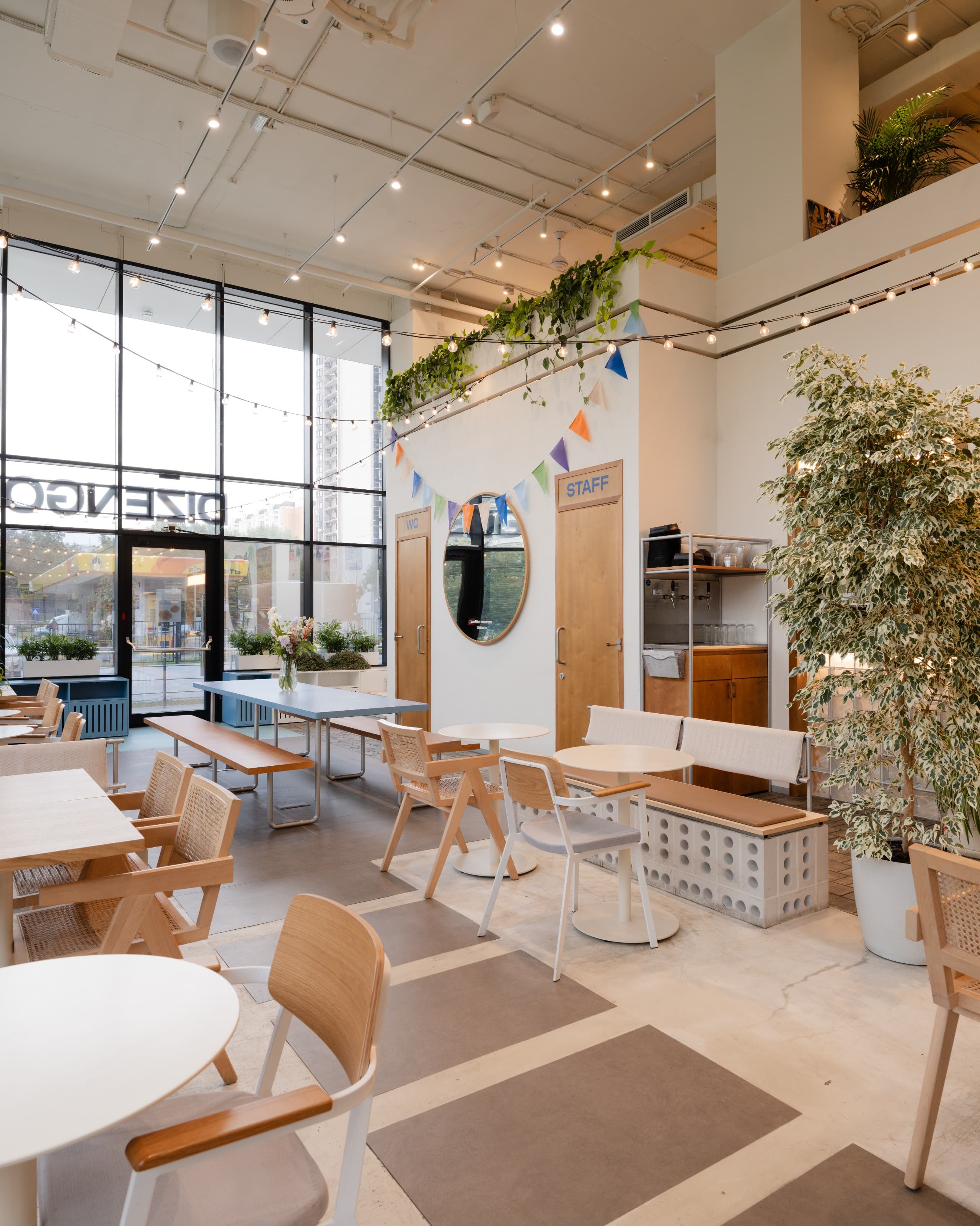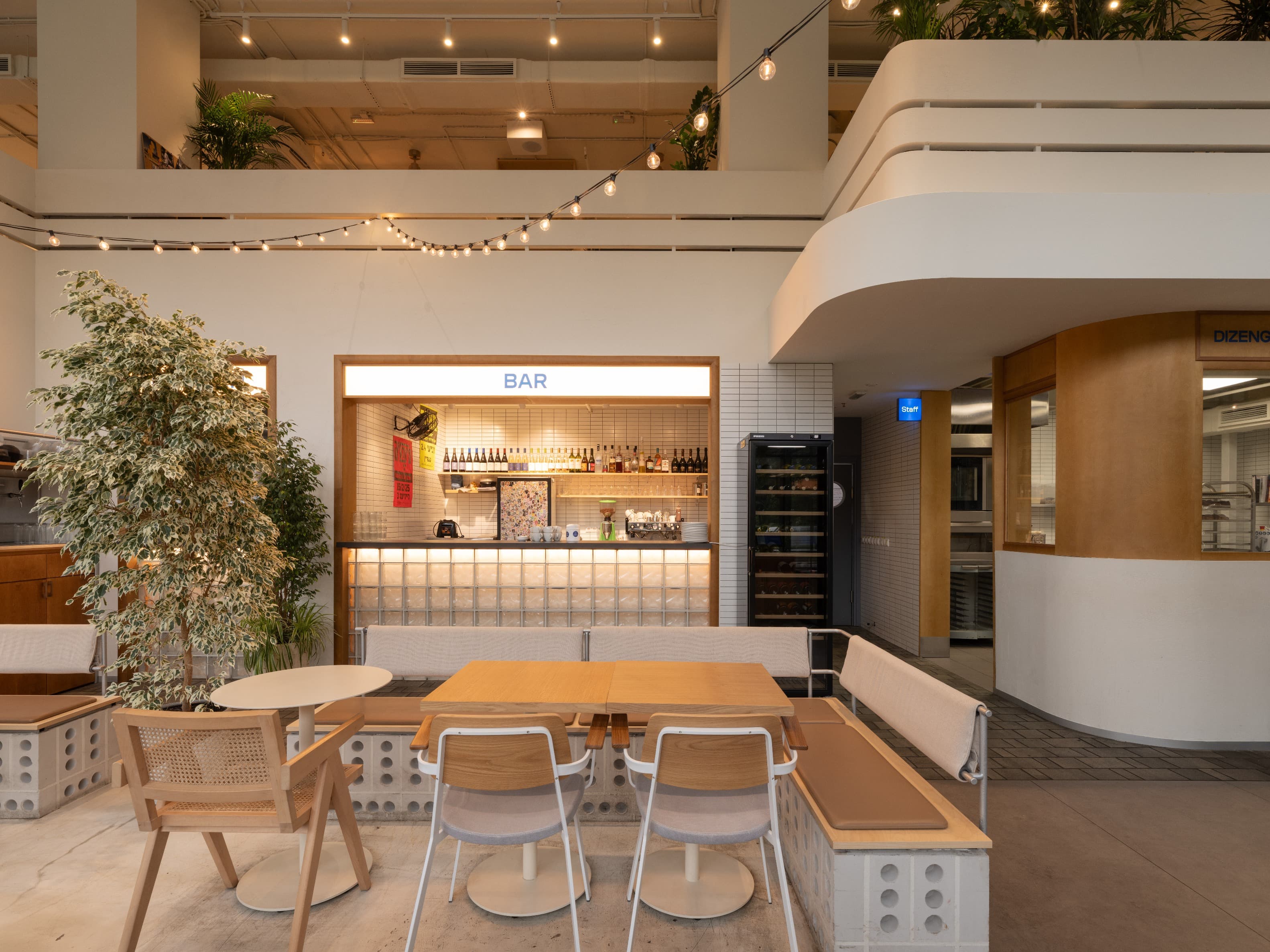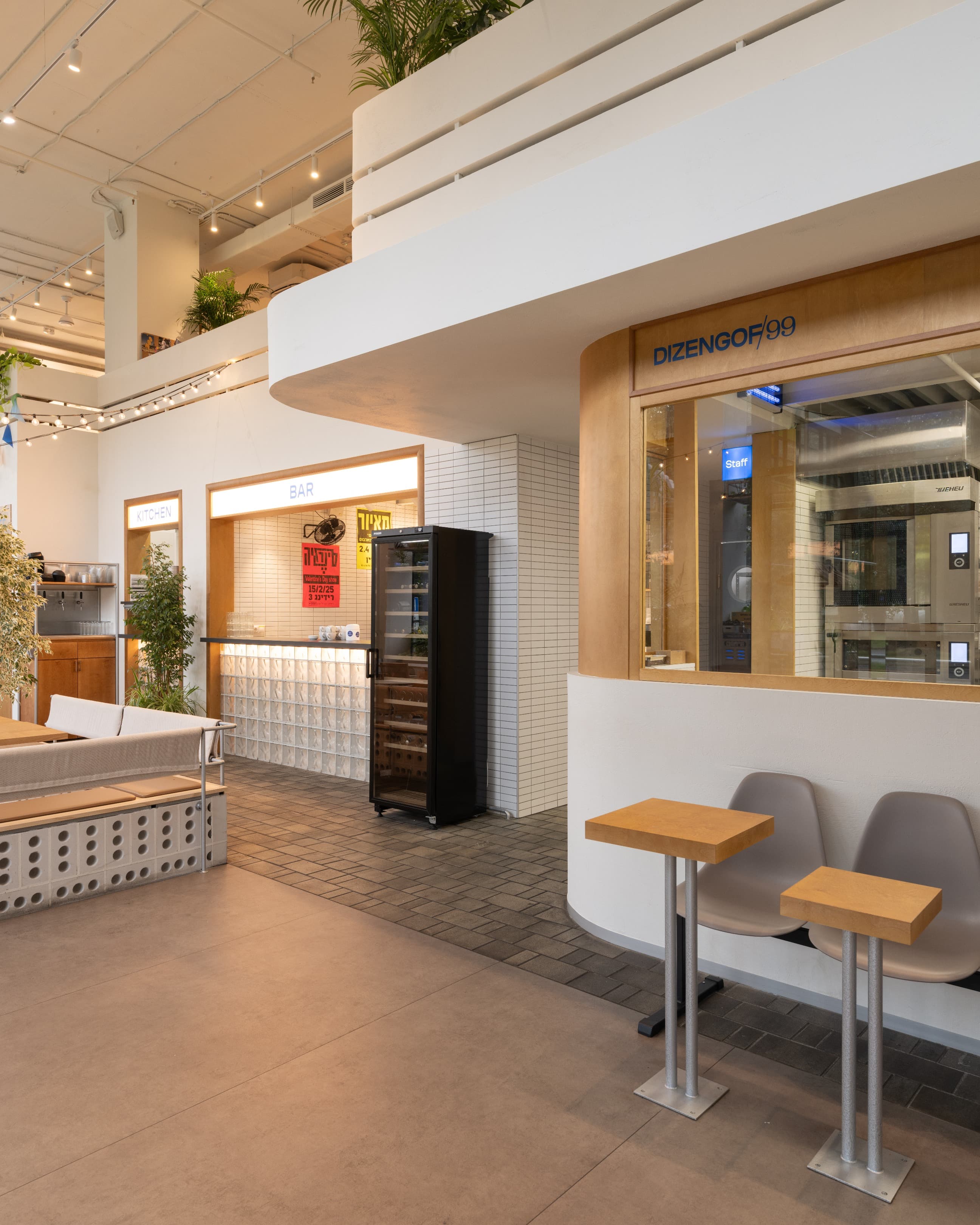 «Изучая город и саму улицу Дизенгоф, мы обратили внимание на характерное для Тель-Авива размывание границ между интерьером и улицей, а также на архитектуру особого района Белого города, построенного полностью в стиле Баухаус: белые фасады со стеклянными блоками, закругленные углы и террасы», — поясняют авторы проекта. «Так родилась идея создать в Москве пространство, в которое посетитель, войдя, оказывается на «улице» Тель-Авива».