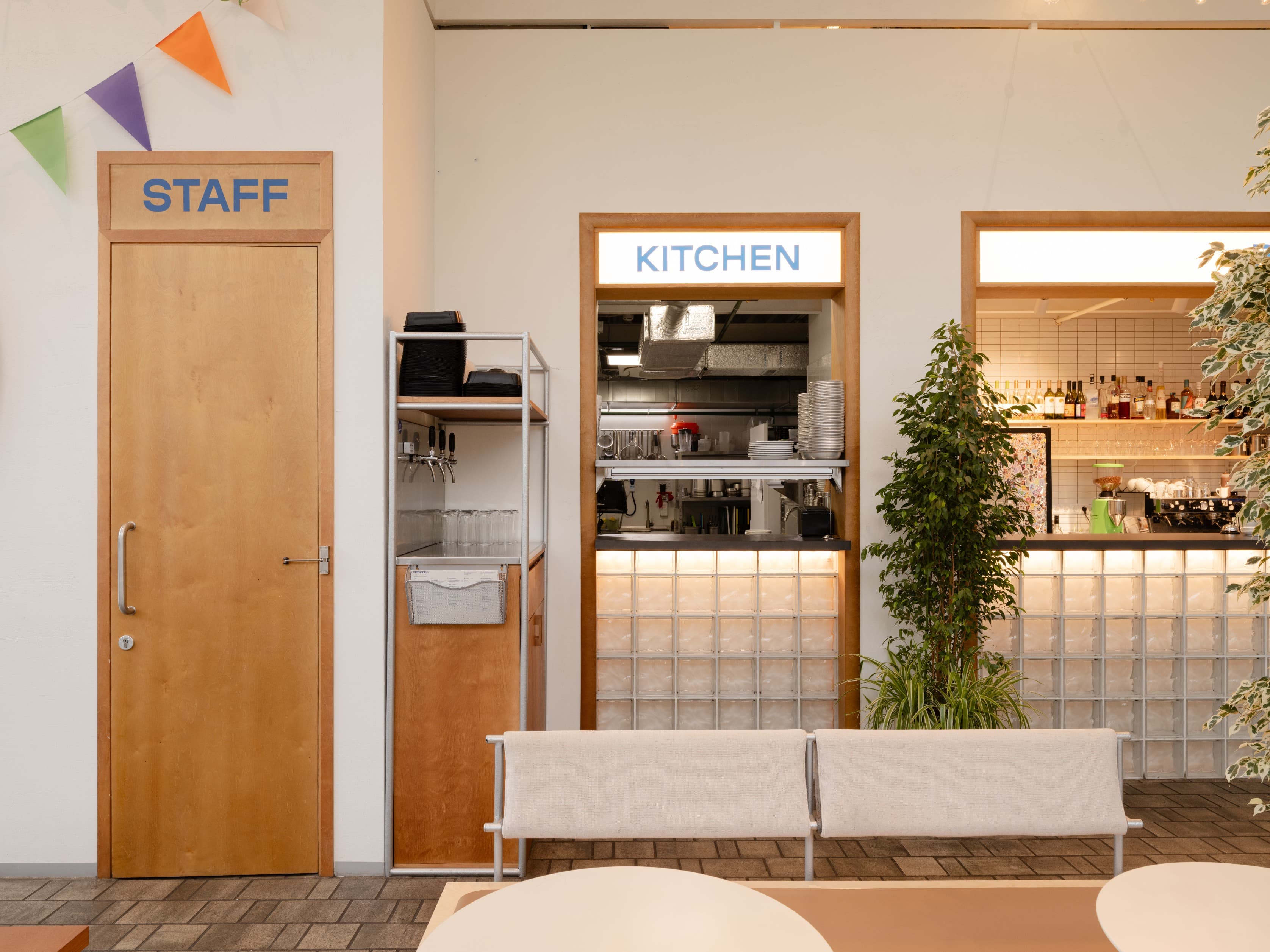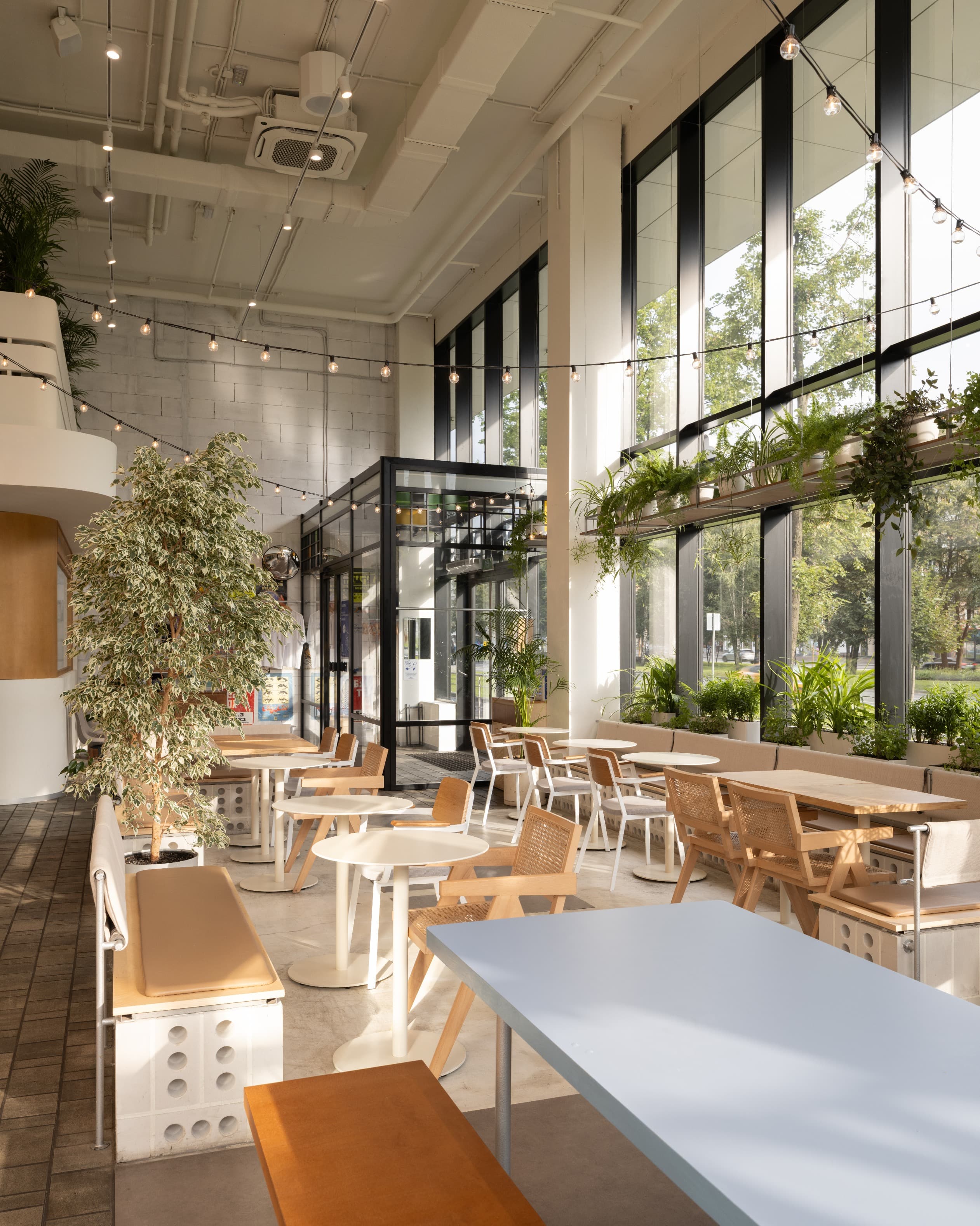 «Поднявшись на второй этаж, гость попадает на «террасу» этого здания. Здесь атмосфера становится более уютной и интимной: дерево и мягкая мебель сочетаются с неоновыми вывесками, бра, фотографиями и пластинками на стенах. Второй этаж задуман как многофункциональное пространство: здесь можно работать на ноутбуке, проводить конференции и музыкальные вечера на небольшой сцене, отдыхать с друзьями или с детьми. Проект впервые для сети включила в себя пекарню, отдельную детскую зону и полноценные рабочие места, превратив ресторан в центр притяжения жителей региона, где раньше таких пространств не было.