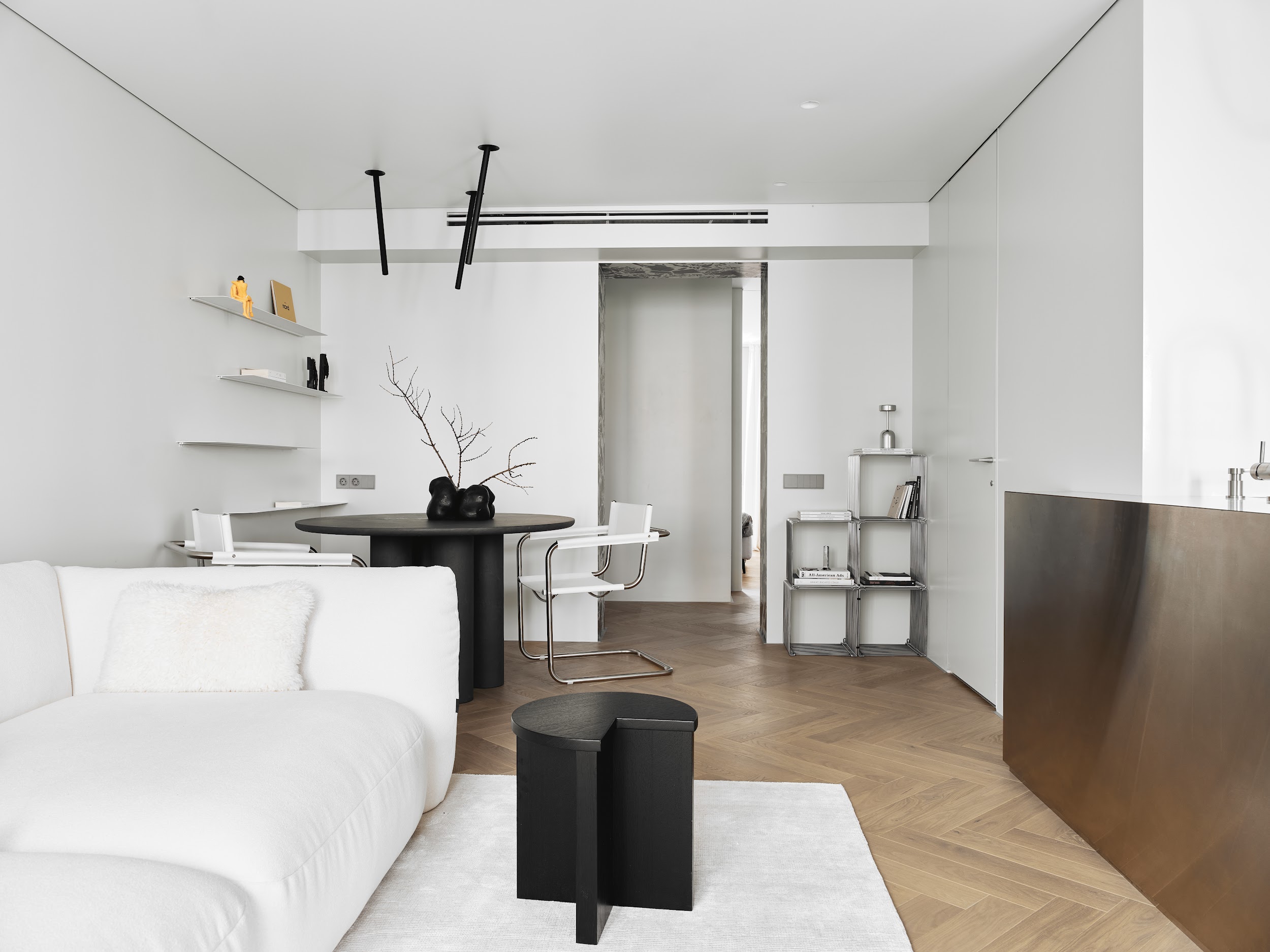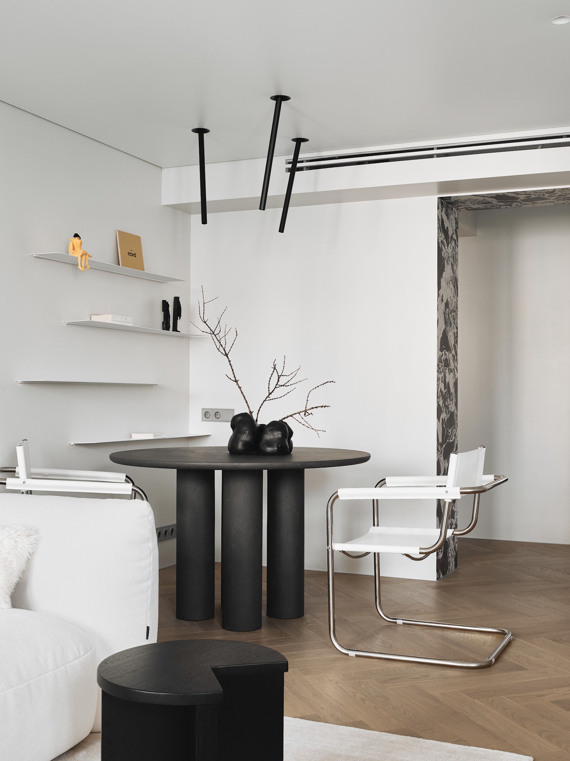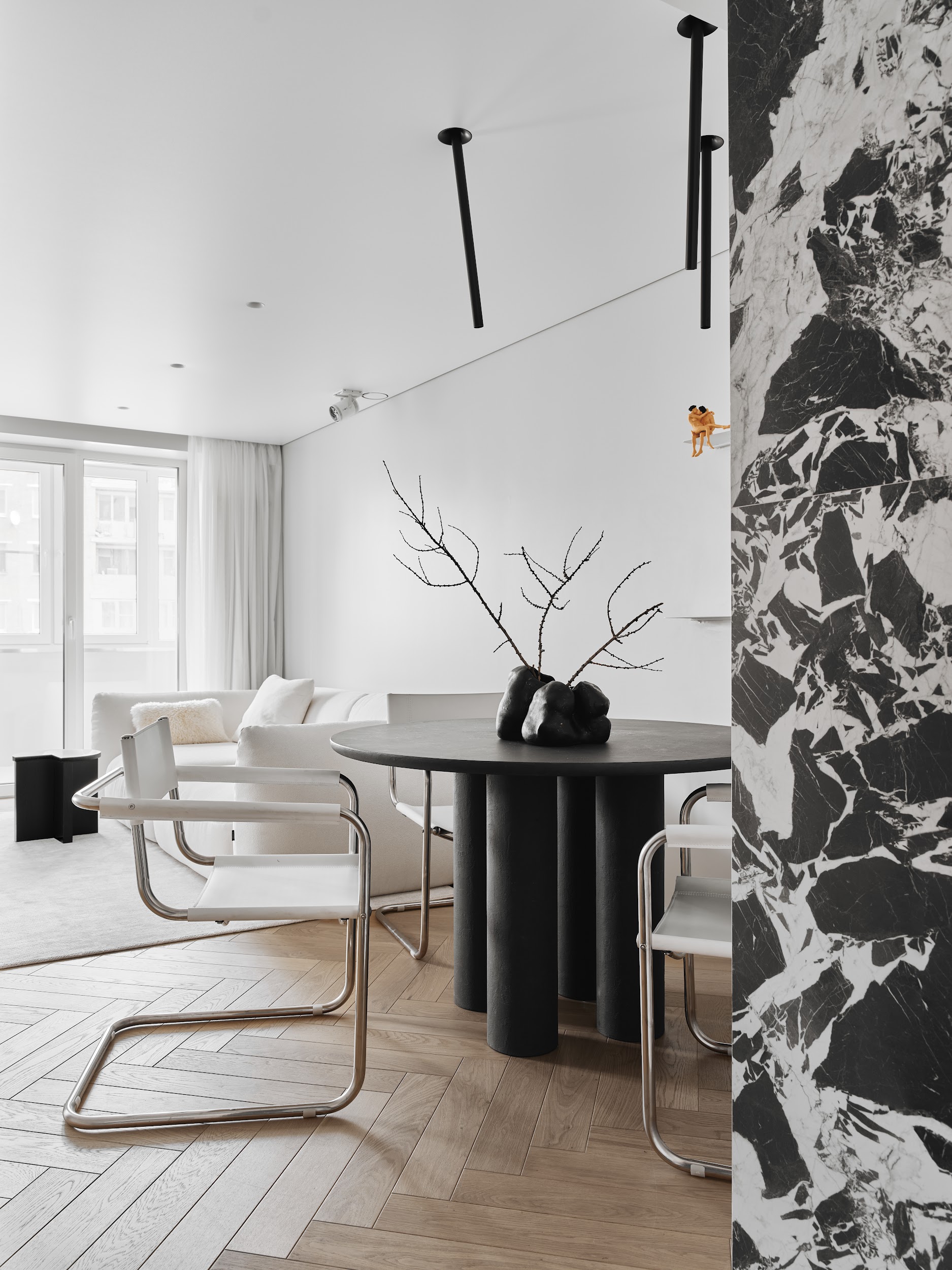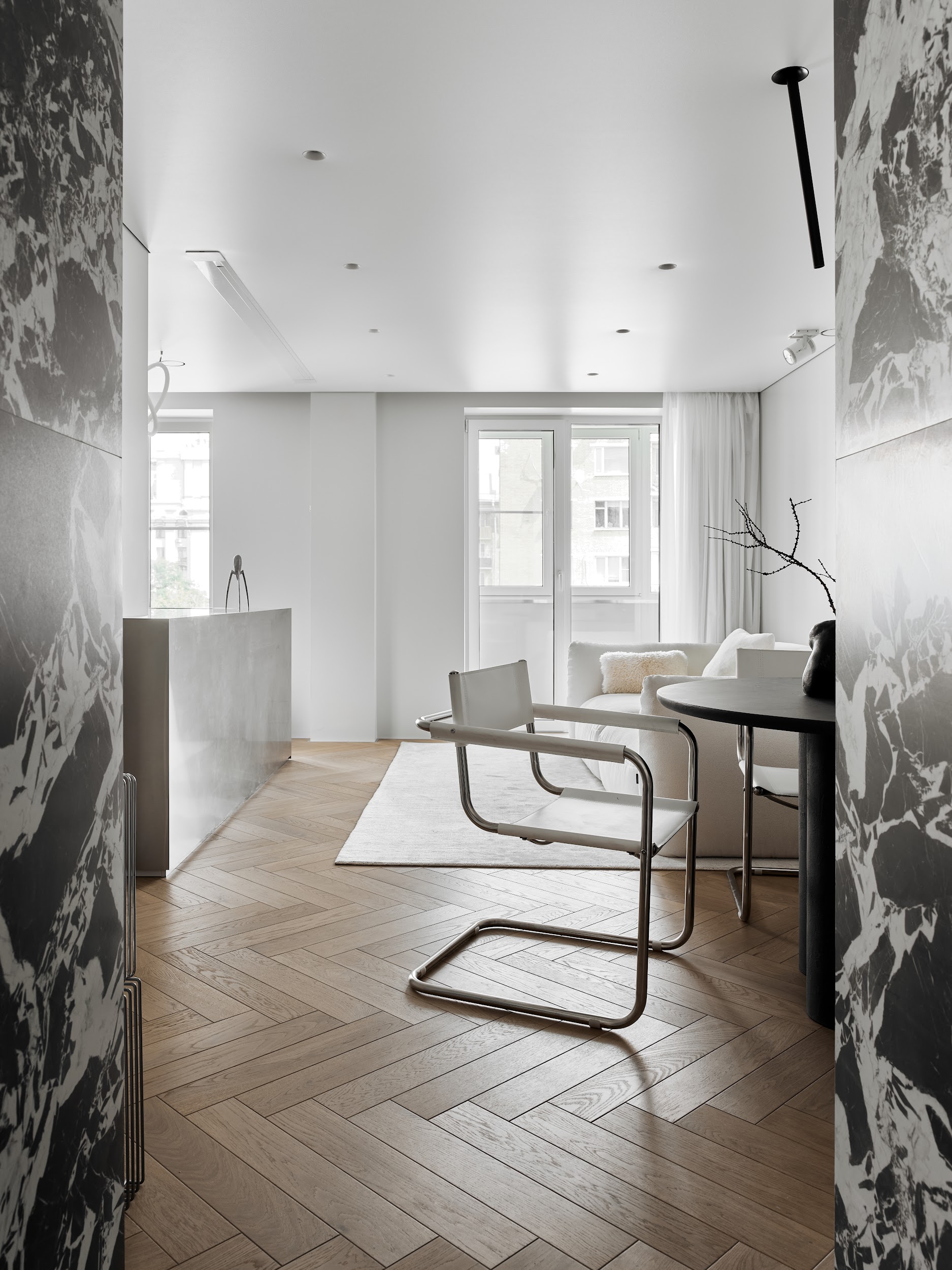 Эта квартира в Московском Старом фонде является глубоко личным проектом дизайнера Евгения Малишкина, которого он создал для него и его жены. Как соучредитель дизайнерского офиса СеверЭто воплощено в этом пространстве с площадью 51 квадратного метра. Одним из метров его основной эстетический принцип является гармония контрастов. Интерьер отражает полное единство пары в взглядах на стиль, их стремление к чистоте форм и отсутствие визуального шума.