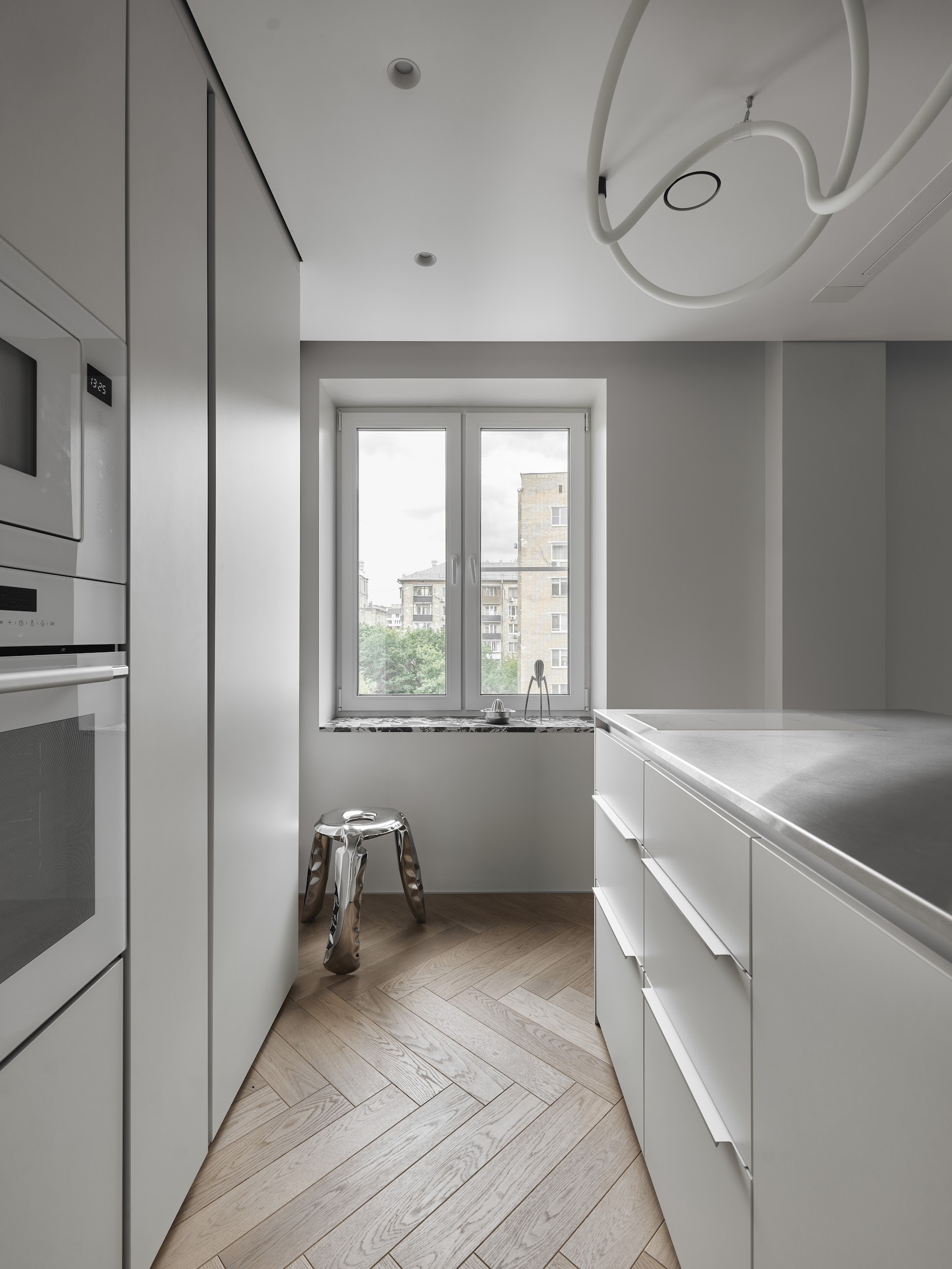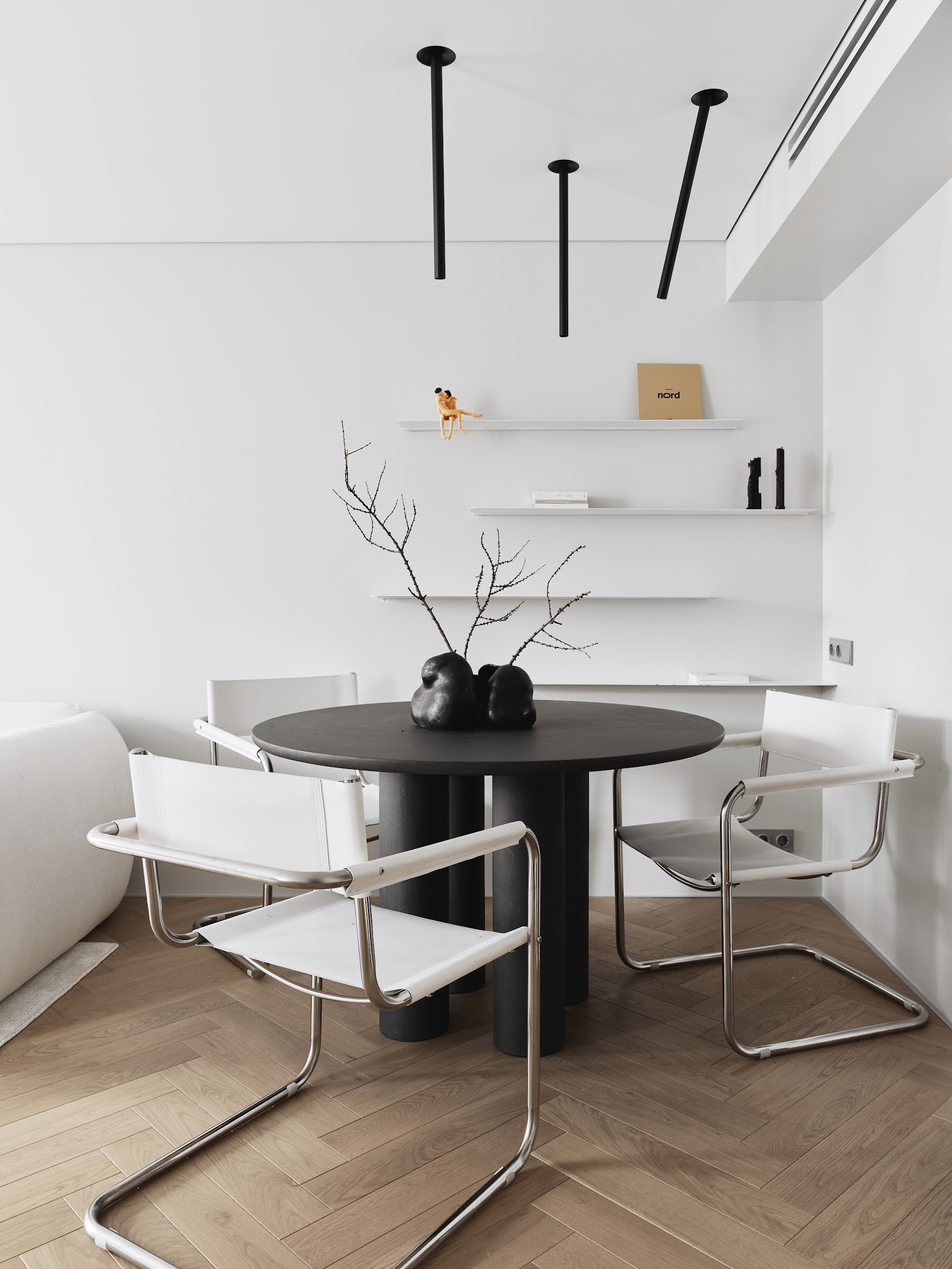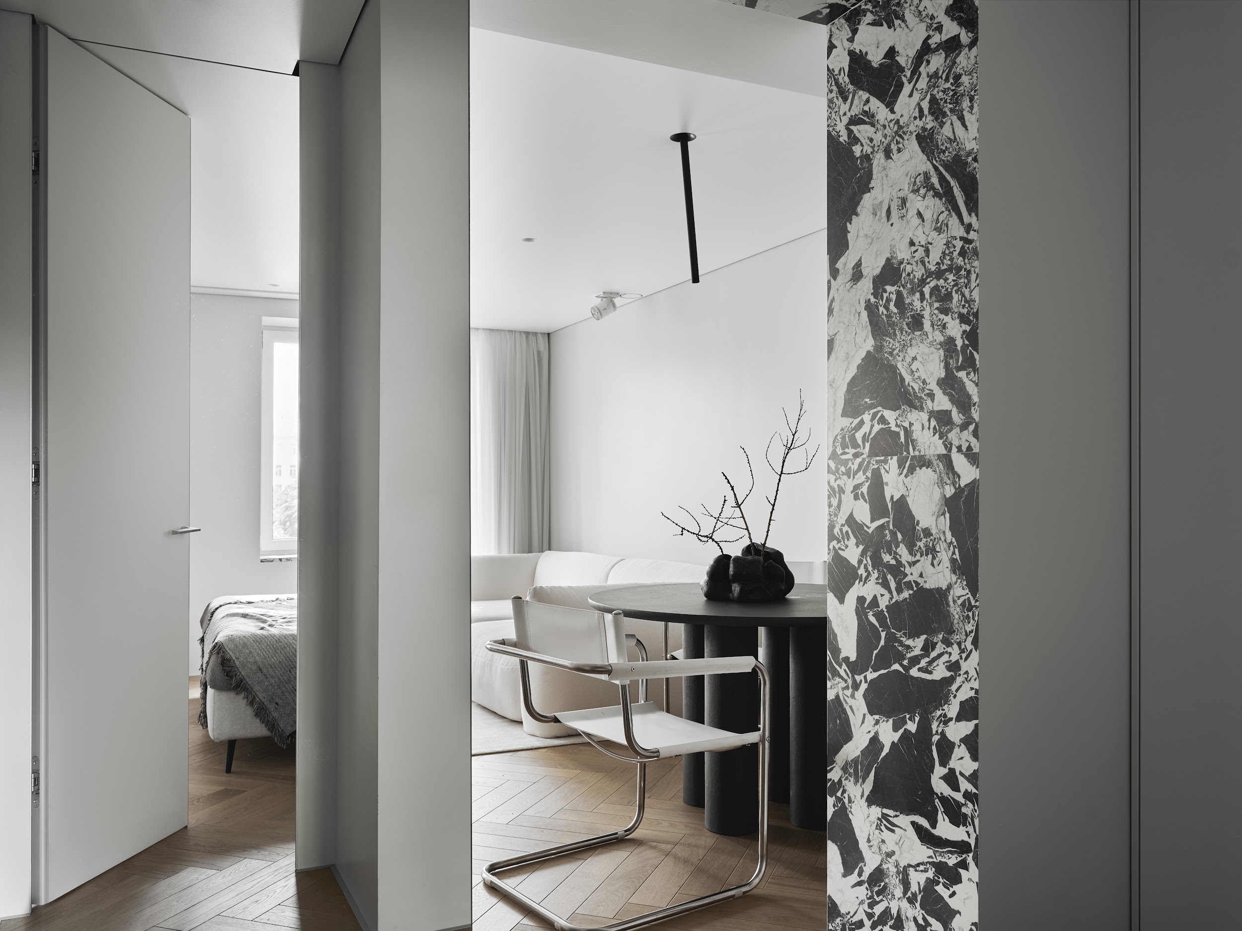 Эта квартира в Московском Старом фонде является глубоко личным проектом дизайнера Евгения Малишкина, которого он создал для него и его жены. Как соучредитель дизайнерского офиса СеверЭто воплощено в этом пространстве с площадью 51 квадратного метра. Одним из метров его основной эстетический принцип является гармония контрастов. Интерьер отражает полное единство пары в взглядах на стиль, их стремление к чистоте форм и отсутствие визуального шума.