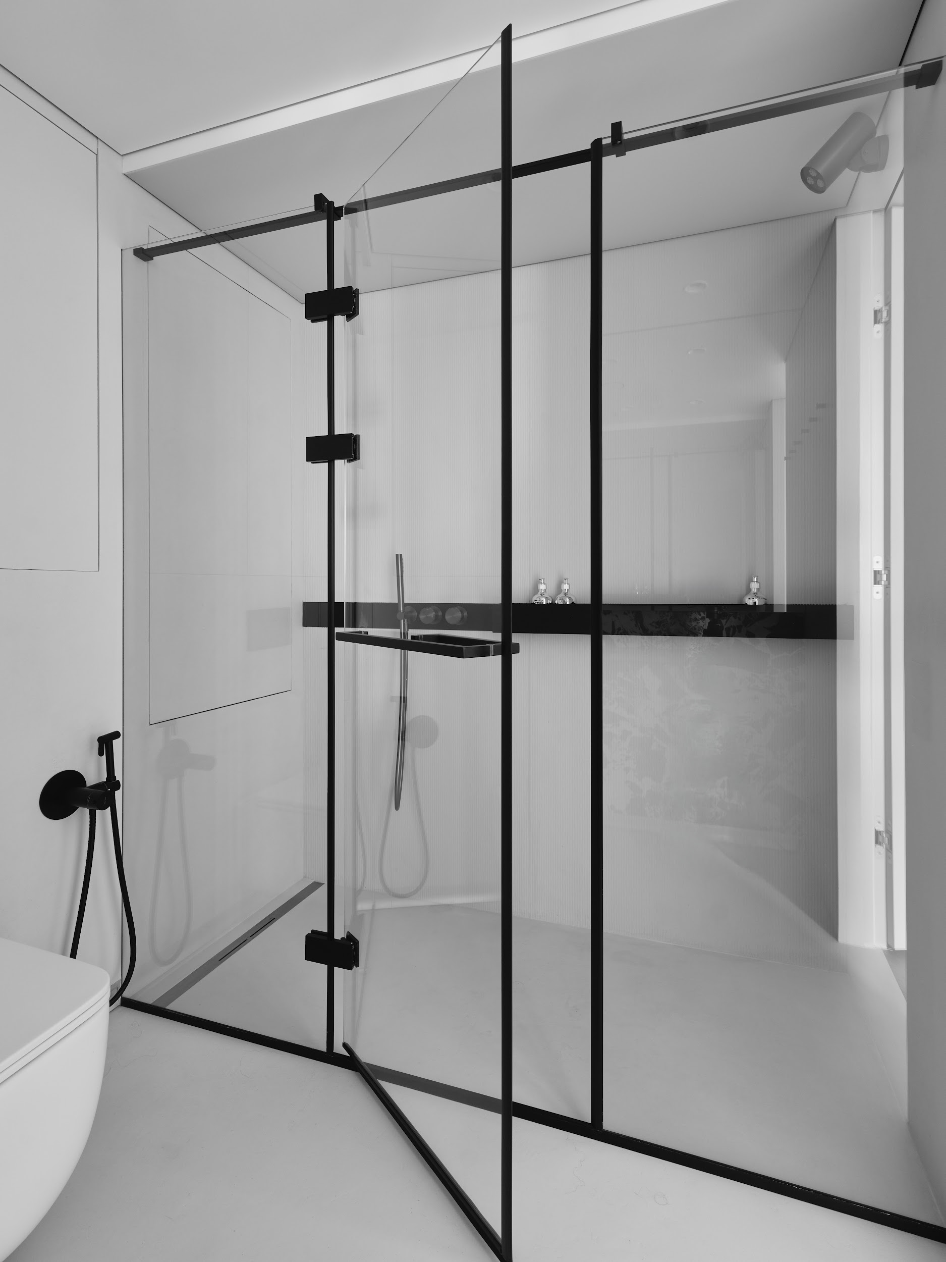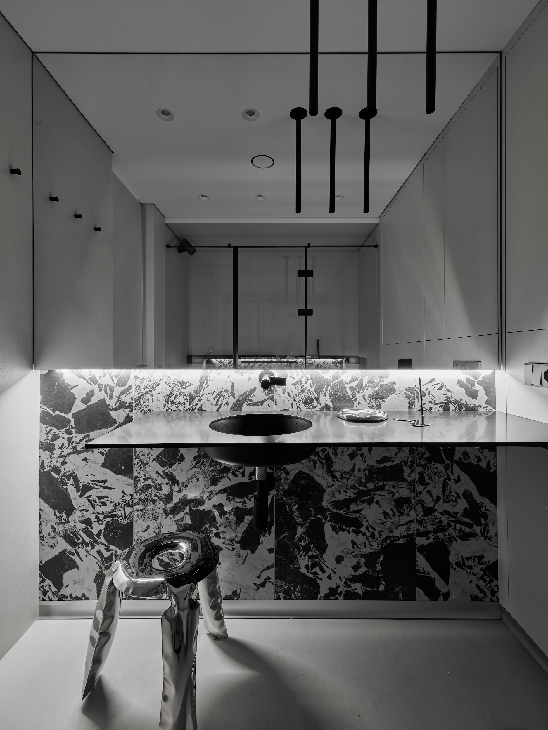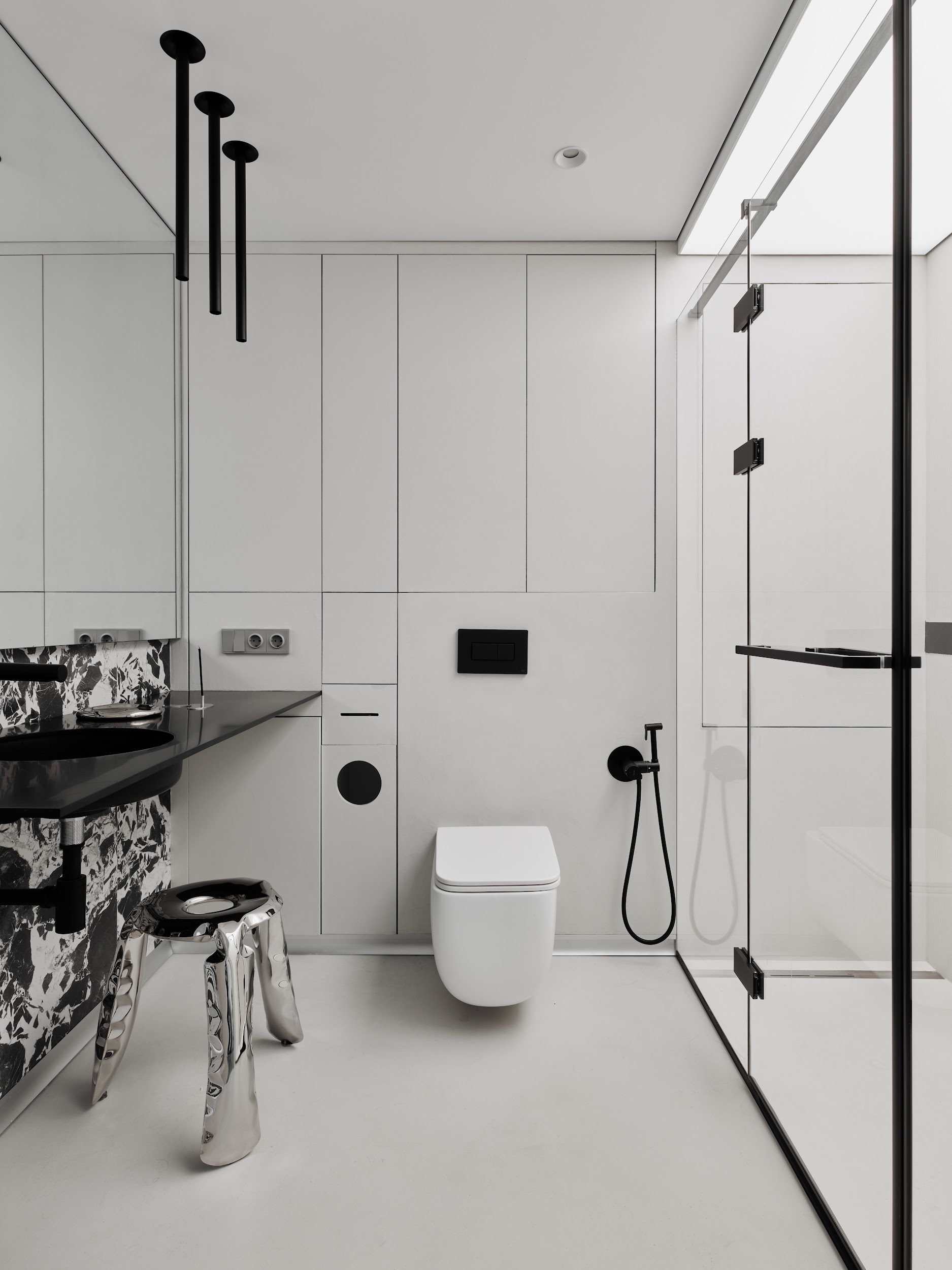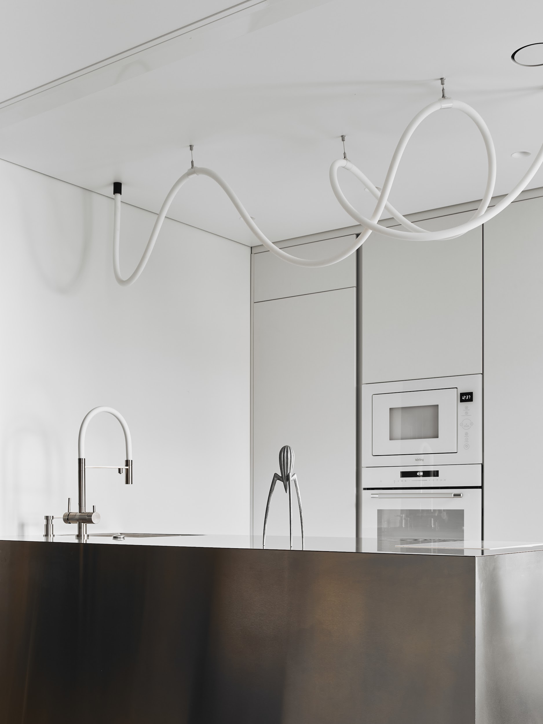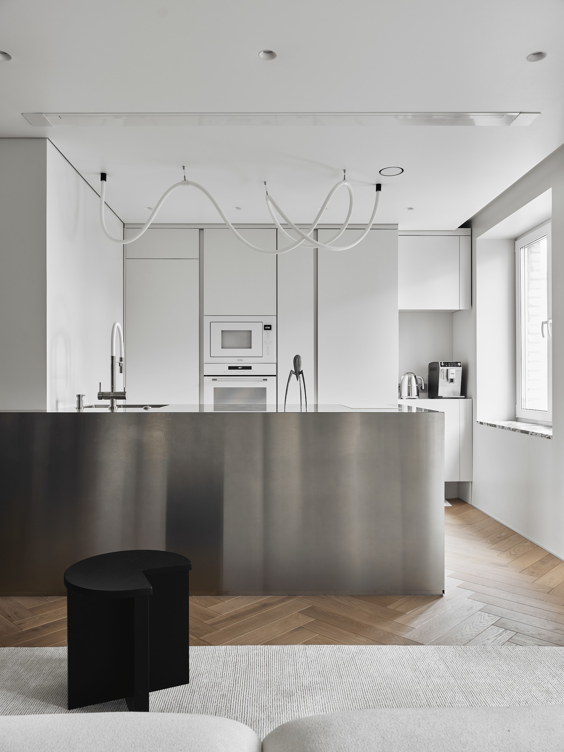 «Мы намеренно отказались от визуального шума, сосредоточившись на композиции, материалах и нюансах», — объясняет Юджин. — В нержавеющей стали, натуральном камне, белых плоскостях, горячих паркете — все собрано в сбалансированной спокойной структуре, где нет ничего лишнего. Особая роль сыграла декор, собранная его женой разных частей света: он принес не только индивидуальность внутри, но и свою личную историю — худой, но и чувствовал. Это не стилизованный интерьер, а среда, в которой нам действительно удобно. «»