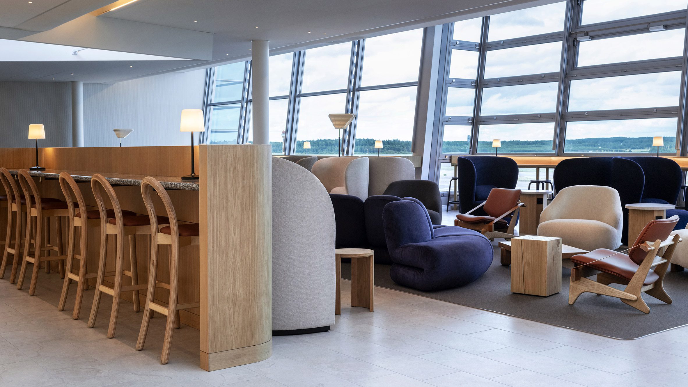 Деревянный стол у входа в зал ожидания, открытый для пассажиров бизнес-класса и участников Finnair Plus Gold, был изготовлен вручную финским дизайнером Антреем Хартикайненом. Изогнутая стена из переливающейся плитки ведет к зоне, отведенной для держателей карт Platinum и Platinum Lumo, обрамленной тяжелыми звукопоглощающими шторами. Плитка и шторы напоминают темно-синий оттенок логотипа Finnair.