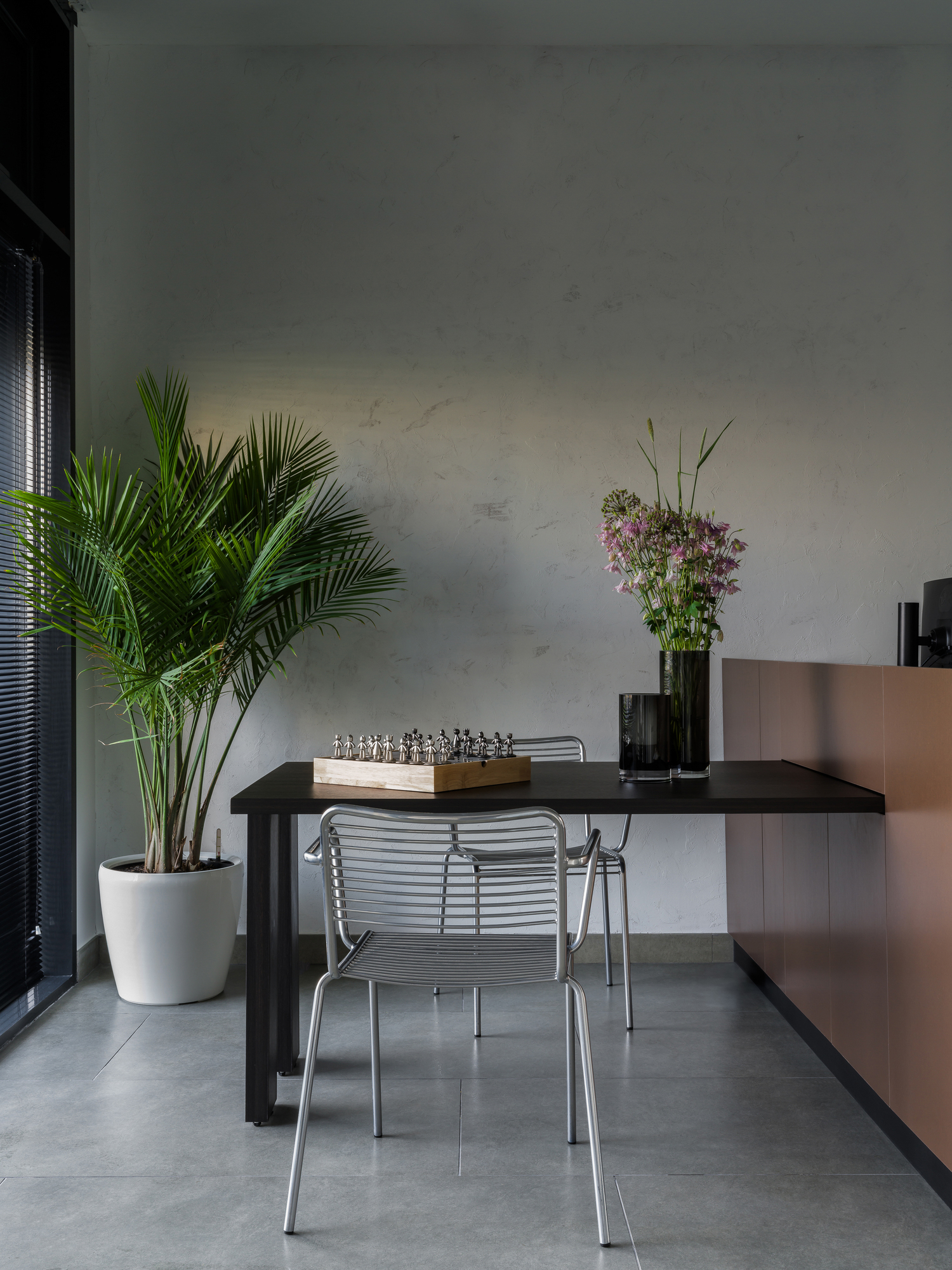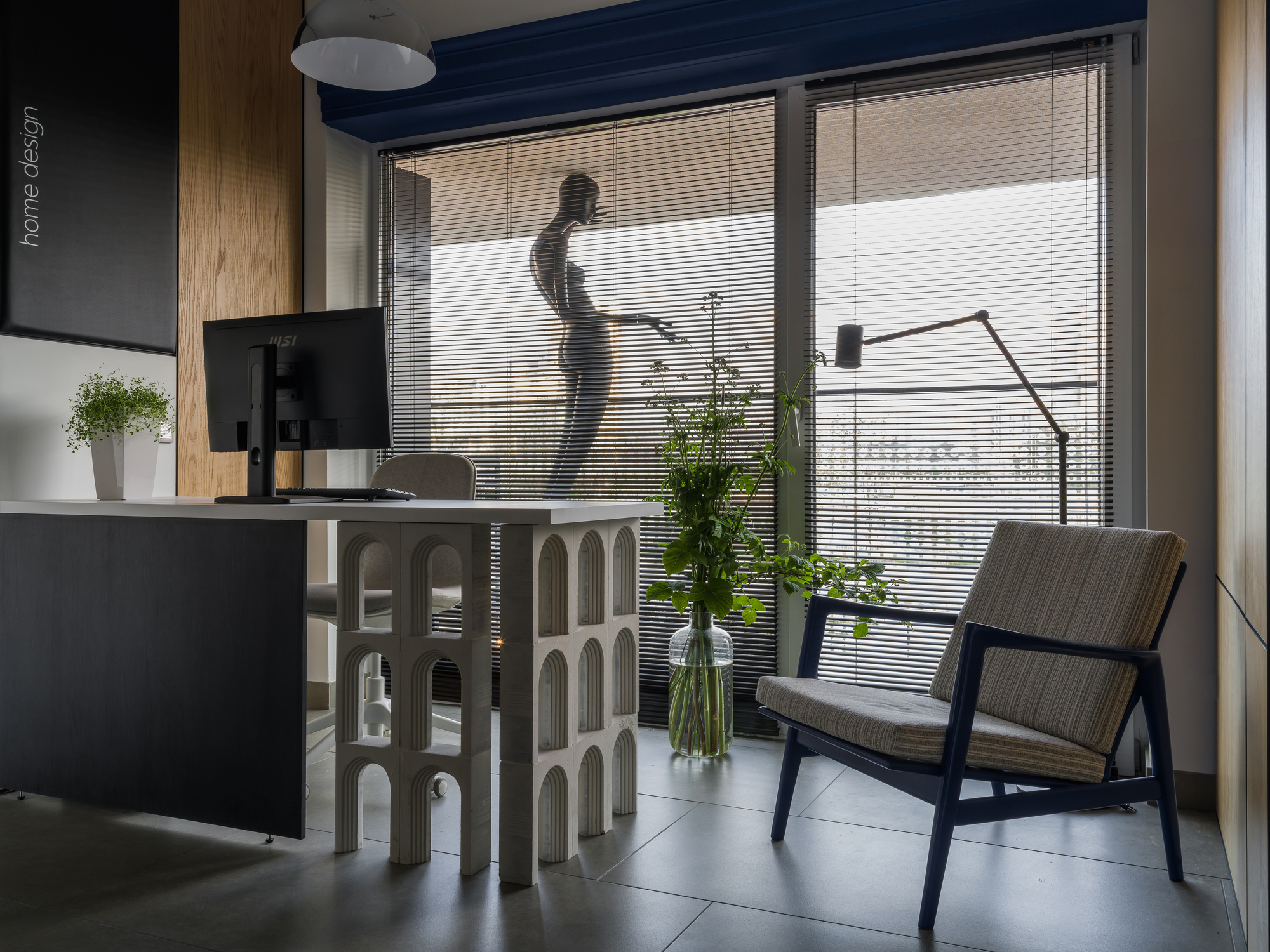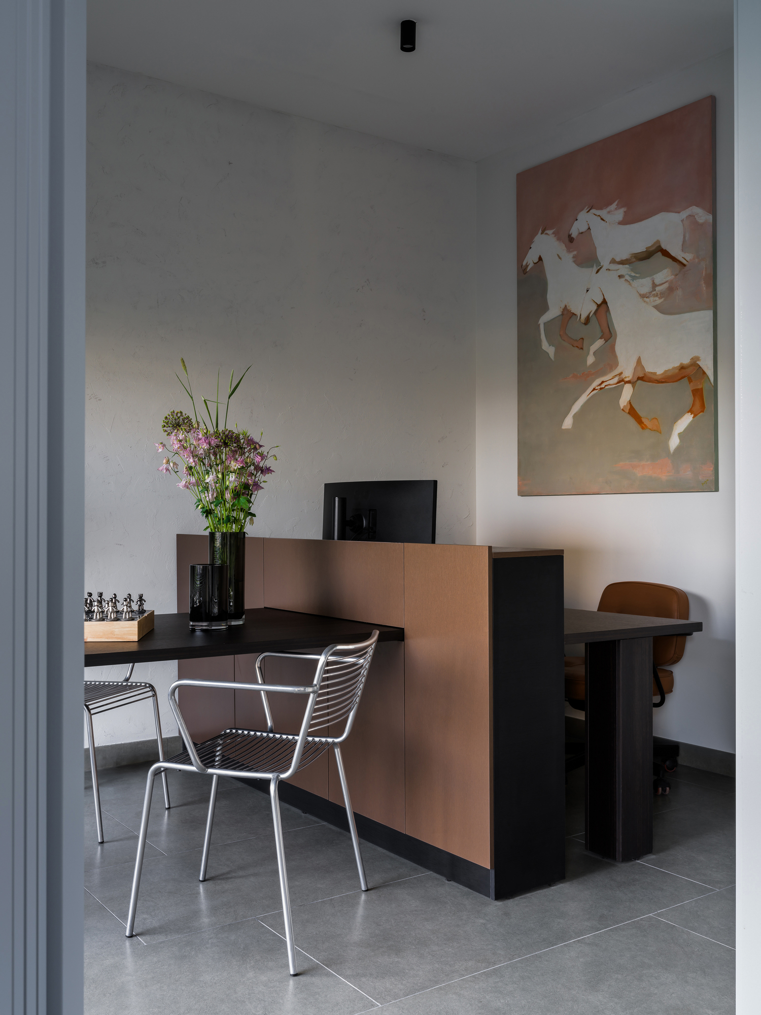 «На втором этаже есть две ключевые зоны», — поясняют авторы проекта. — Home Design — это мастерская идей, где рождается архитектура будущих интерьеров и где эскизы превращаются в линии продуманных рисунков. Напротив — зона Home Fashion, настоящая гардеробная из материалов и аксессуаров: здесь концепция чувствуется на ощупь, можно сравнить фактуры и нюансы дерева и камня. От Home Fashion путь ведет к сердцу офиса – террасе, где аромат трав и мягкого текстиля навевает воспоминания детства и наполняет верой в лучшее. Это уголок, где можно вдохновиться, выпить кофе из старинной посуды бабушки Веры – бабушки основателя конторы – и на мгновение ощутить себя на отдыхе под ореолом нежнейшей заботы. Уединенный кабинет директора располагался на первом этаже.