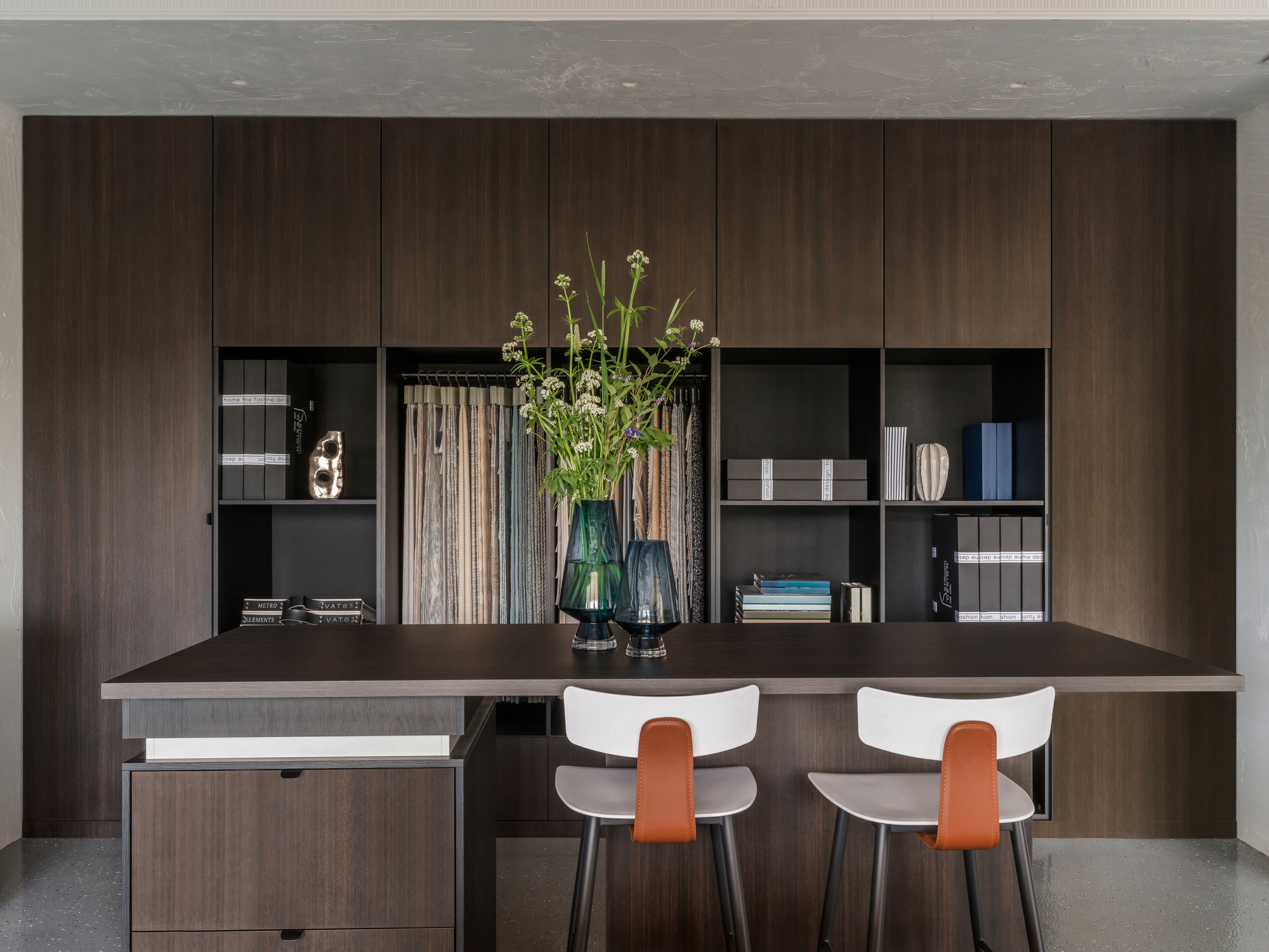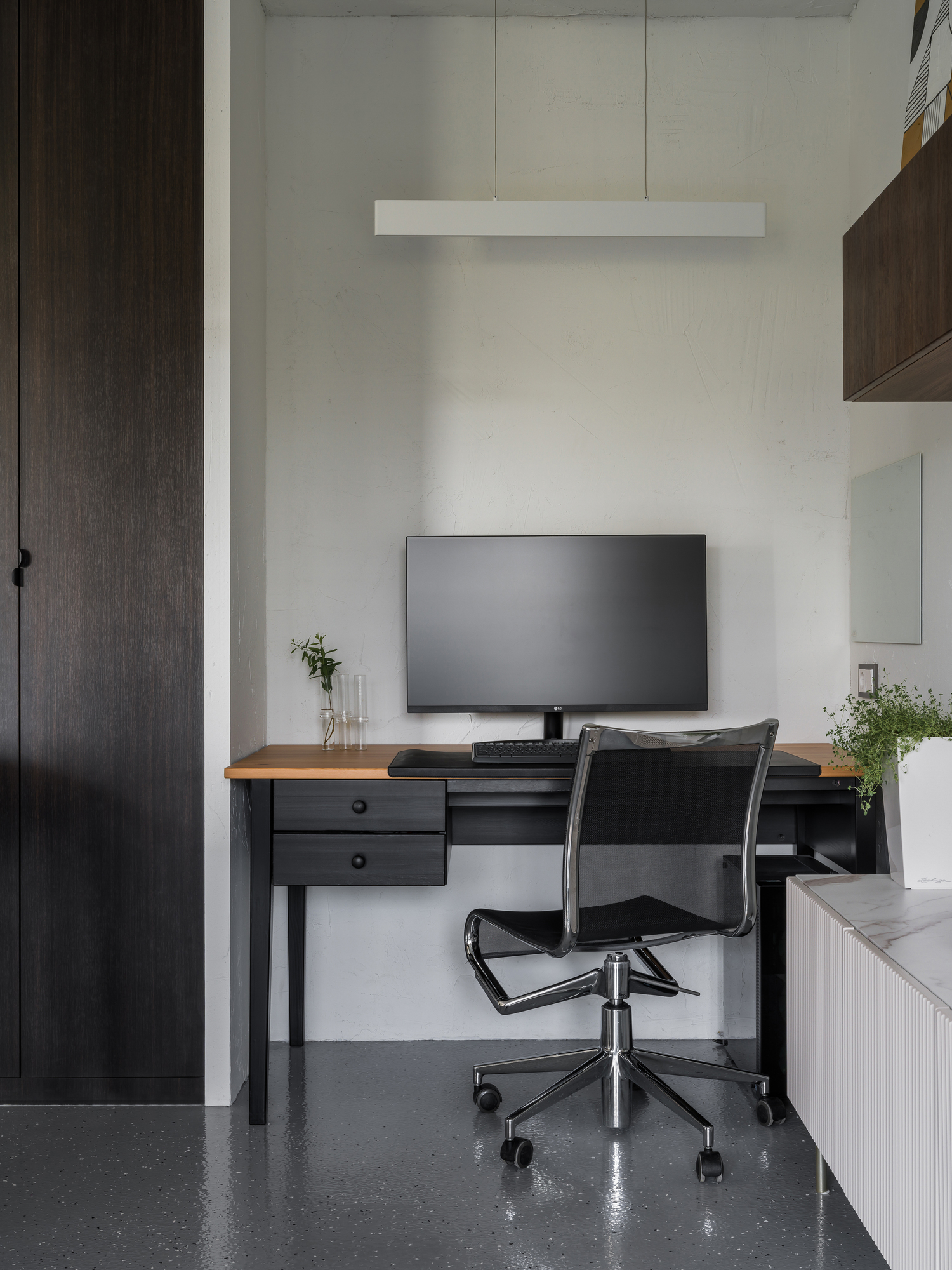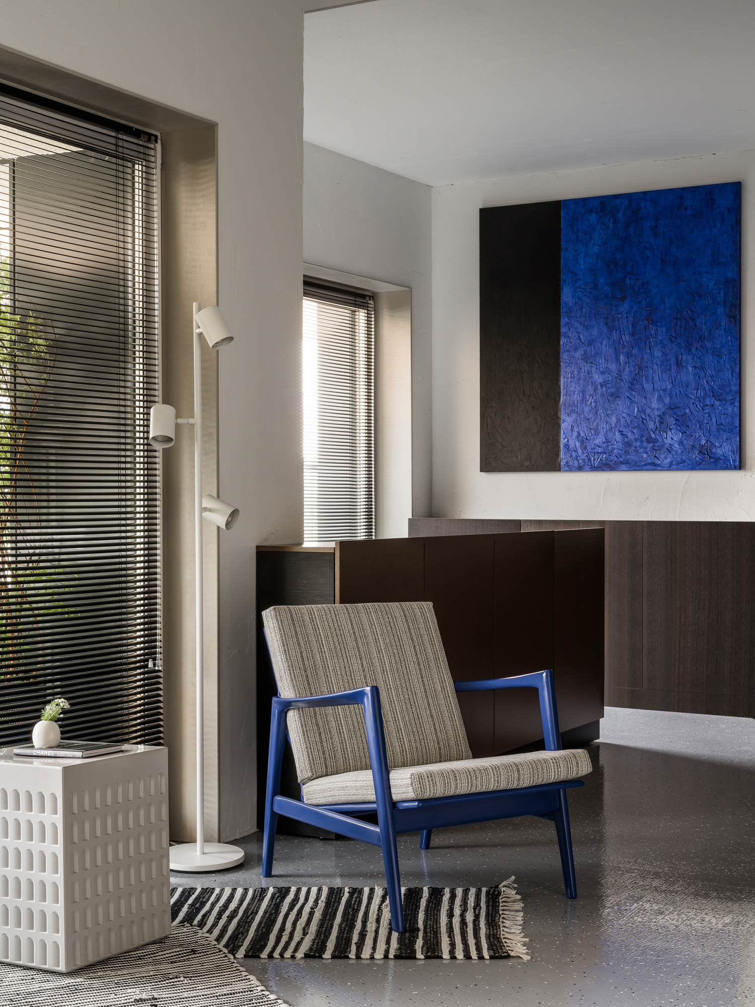 «На втором этаже есть две ключевые зоны», — поясняют авторы проекта. — Home Design — это мастерская идей, где рождается архитектура будущих интерьеров и где эскизы превращаются в линии продуманных рисунков. Напротив — зона Home Fashion, настоящая гардеробная из материалов и аксессуаров: здесь концепция чувствуется на ощупь, можно сравнить фактуры и нюансы дерева и камня. От Home Fashion путь ведет к сердцу офиса – террасе, где аромат трав и мягкого текстиля навевает воспоминания детства и наполняет верой в лучшее. Это уголок, где можно вдохновиться, выпить кофе из старинной посуды бабушки Веры – бабушки основателя конторы – и на мгновение ощутить себя на отдыхе под ореолом нежнейшей заботы. Уединенный кабинет директора располагался на первом этаже.