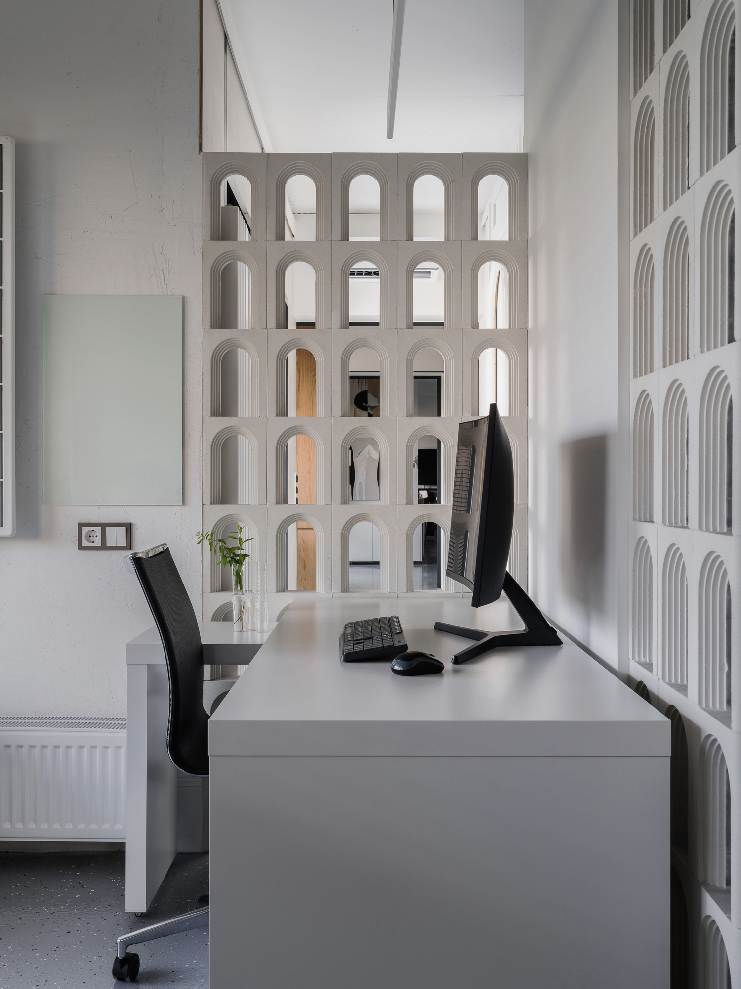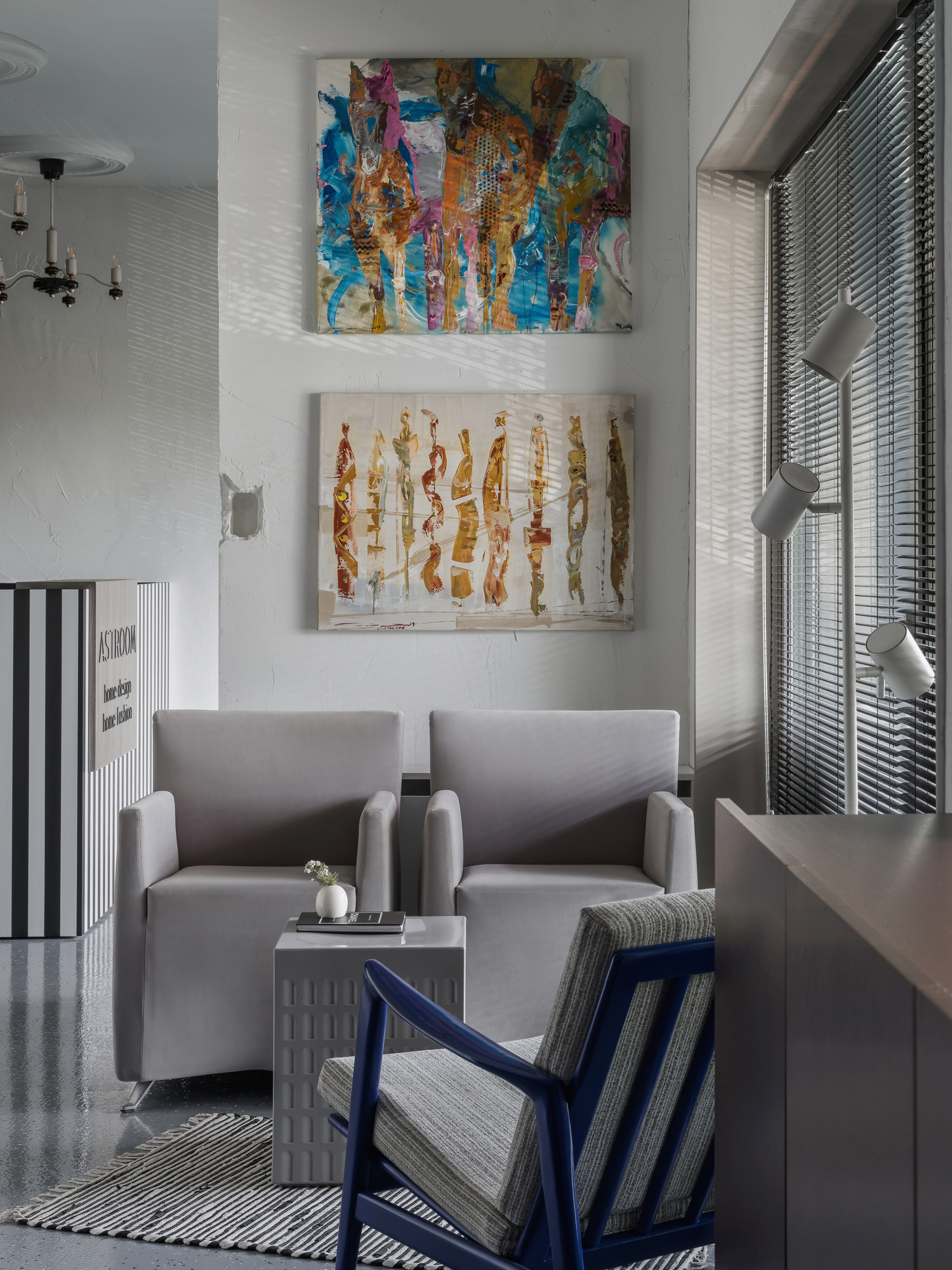 «Офис живет в диалоге прошлого и настоящего: винтажные кресла и советские люстры 1970-х годов соседствуют с современными решениями. Стены украшают картины Татьяны Борджиа, Алексея Желнина, Стаси Вигерич. Легкие диалоги с материалами, подчеркивающие рельефы штукатурки «Нотр-Дам», цементных блоков, лепнины и панелей. Аксессуары, вобравшие в себя наши находки из разных стран, придают эмоциональный ритм пространству».