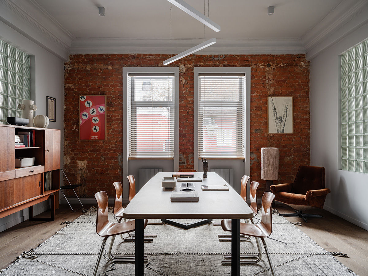 «Основатель компании был близок к современной эстетике середины века; в проекте мы хотели воспроизвести его и подчеркнуть историческое наследие этого места. Однако когда я впервые приехал в офис, это было довольно печальное зрелище. От первоначальных архитектурных достоинств не осталось и следа: гипсокартонные перегородки разделили помещение на зоны причудливой формы, высокие потолки были понижены, лепнина спрятана, кирпич фасада облицован.