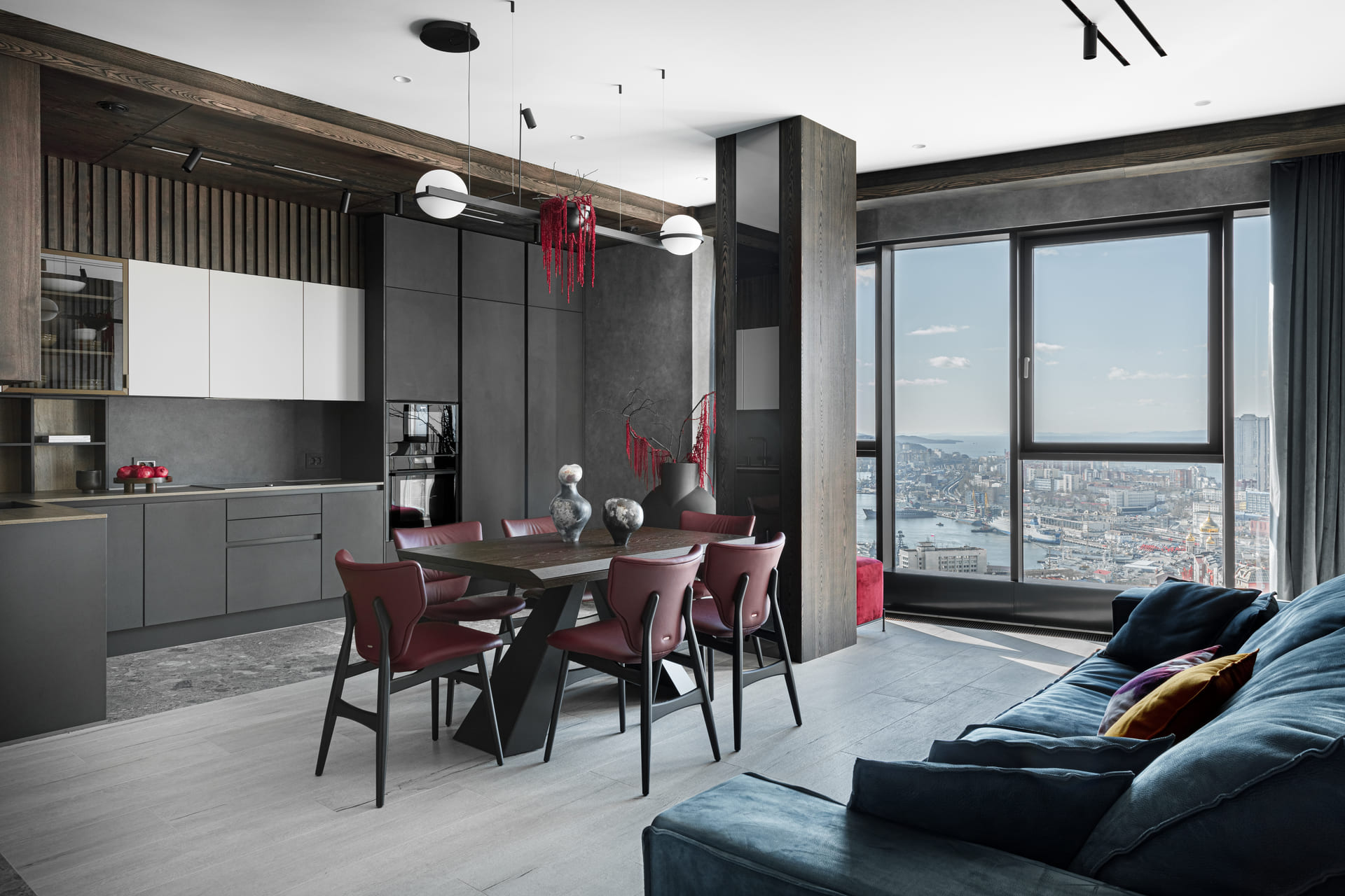 Дизайнер Оксана Мокриенко спроектировала эффектную квартиру общей площадью 103,6 квадратных метра на 10 этаже клубного дома во Владивостоке. метры. Темные тона, использованные в этом интерьере, служат фоном для ярких акцентов, придающих пространству индивидуальность.