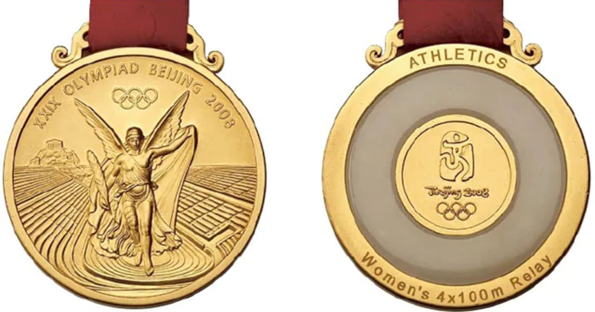 На аверсе медали отражает греческий характер Олимпийских игр: богиня победы Ника, представленная на стадионе Панатинаикос. На реверсе медали инкрустированы нефритом, а на металлической центральной части выгравирована эмблема Игр 2008 года в Пекине. Вдохновением для дизайна крючка для медали послужил нефрит «хуан», церемониальный кусок нефрита, украшенный узором двойного дракона и узором «пу», тростниковой циновки.