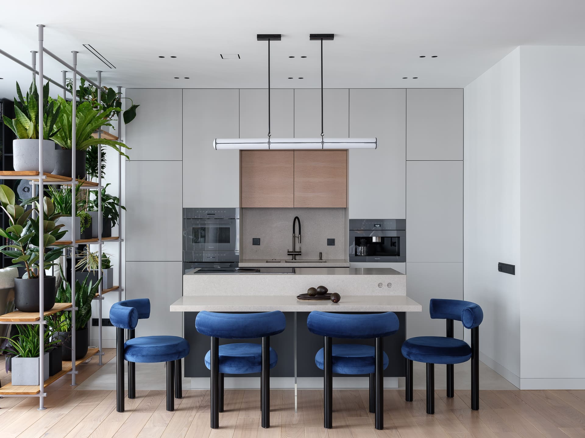 «Первоначальное помещение сдавалось без перегородок, что можно считать преимуществом. При работе над планировкой мы использовали концепцию текучих пространств: комнаты соединяются друг с другом и имеют лишь условные границы. Таким образом, прихожая, кухня, гостиная и зимний сад, в котором расположен бар и уголок для чтения, образуют единое пространство.