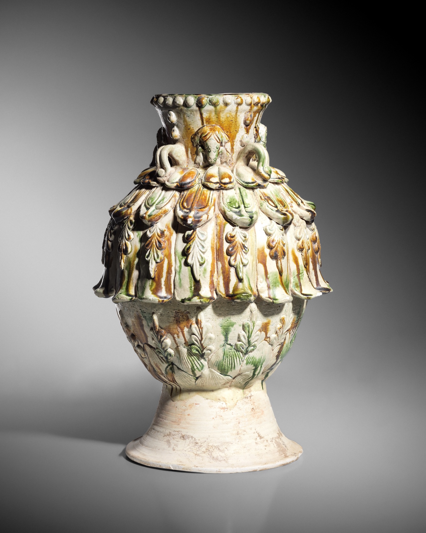 Внутри — сложный круг эпох и контекстов. Камилла Лепренс представила севрский фарфор XVIII века и современный бисквитный фарфор той же фабрики. Галерея Воклер предложила барельефы музейного качества с изображением ящериц, листьев и морских рептилий от учеников Бернара Полисси XIX века. Кристиан Дейдье переносит зрителя в Китай VI века, где уже можно догадываться о будущих техниках санкэ, ярко проявившихся в эпоху Тан (VII-IX вв.), когда особенно активно стали использоваться свинцовые эмали с оксидами меди, железа и марганца, создающие плавные переходы желтого, зеленого и коричневого цветов.