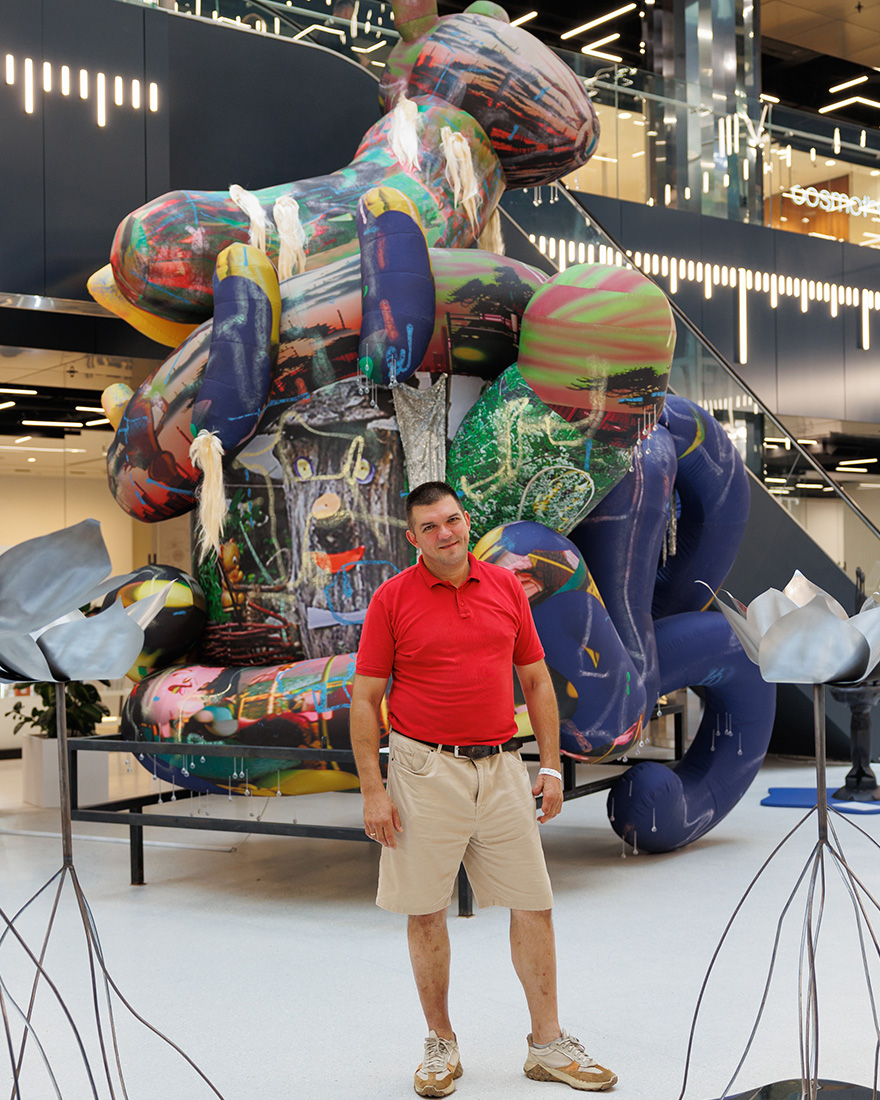 Прежде всего, как художник, я занимаюсь комбинаторным и общим коллажем. Я делаю сложные многослойные объекты, картины, коллажи, где объединяются различные материалы, контексты и обстоятельства. Все это неожиданно и интересные комбинации появляются. Надувные скульптуры — это отдельная страница в моей практике. Это сложные работы, которые являются выпуклыми картинами в цветной ткани, такие как холст, только опухшие в виде определенных объемов. Краска наносится на ткань, коллажи Elements-Wigs, маски и объект искусства основаны на металлической структуре. Для меня это классическая комбинация линии и пятен. Эти вещи можно считать искусством после интернет, потому что у них есть интернет-изображение и поколения нейронной сети. И все эти аэрофигуры на самом деле являются прямым режимом трехмерного реализации. И я заинтересован в том, как проект преобразуется из цифрового в физический и наоборот. Появление этой серии было разработано мной как историей экспорта, потому что основной стороной надувных вещей является их мобильность. На ударе этот объект помещается в спортивную сумку, которая позволяет его открывать в местах или совершенно разные города за день.