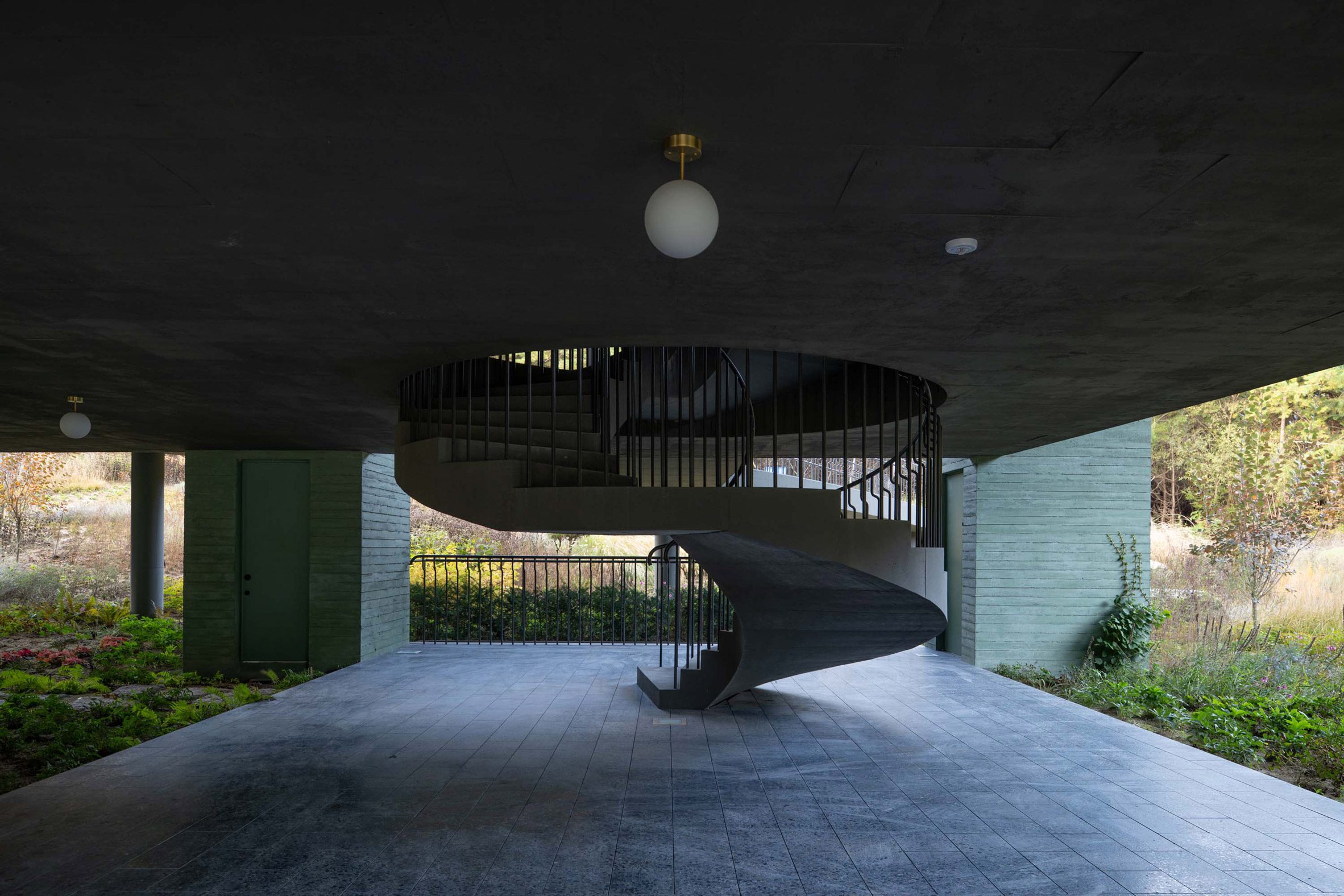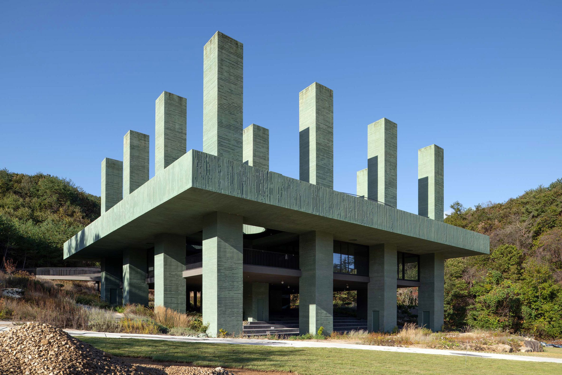 Чилийская архитектурная студия Pezo von Ellrichshausen спроектировала ресторан Les Jardins de Médongaule в южнокорейской провинции Кёнгидо с 16 массивными колоннами из зеленого бетона. Это высокое строение с террасой на крыше теперь является частью садового комплекса на северо-востоке Сеула. Официальное название проекта — Überhaus — отражает возвышенное расположение дома, но архитекторы Маурисио Пезо и София фон Элрихсхаузен называют здание Rest, подчеркивая, что оно служит одновременно рестораном и местом для отдыха.