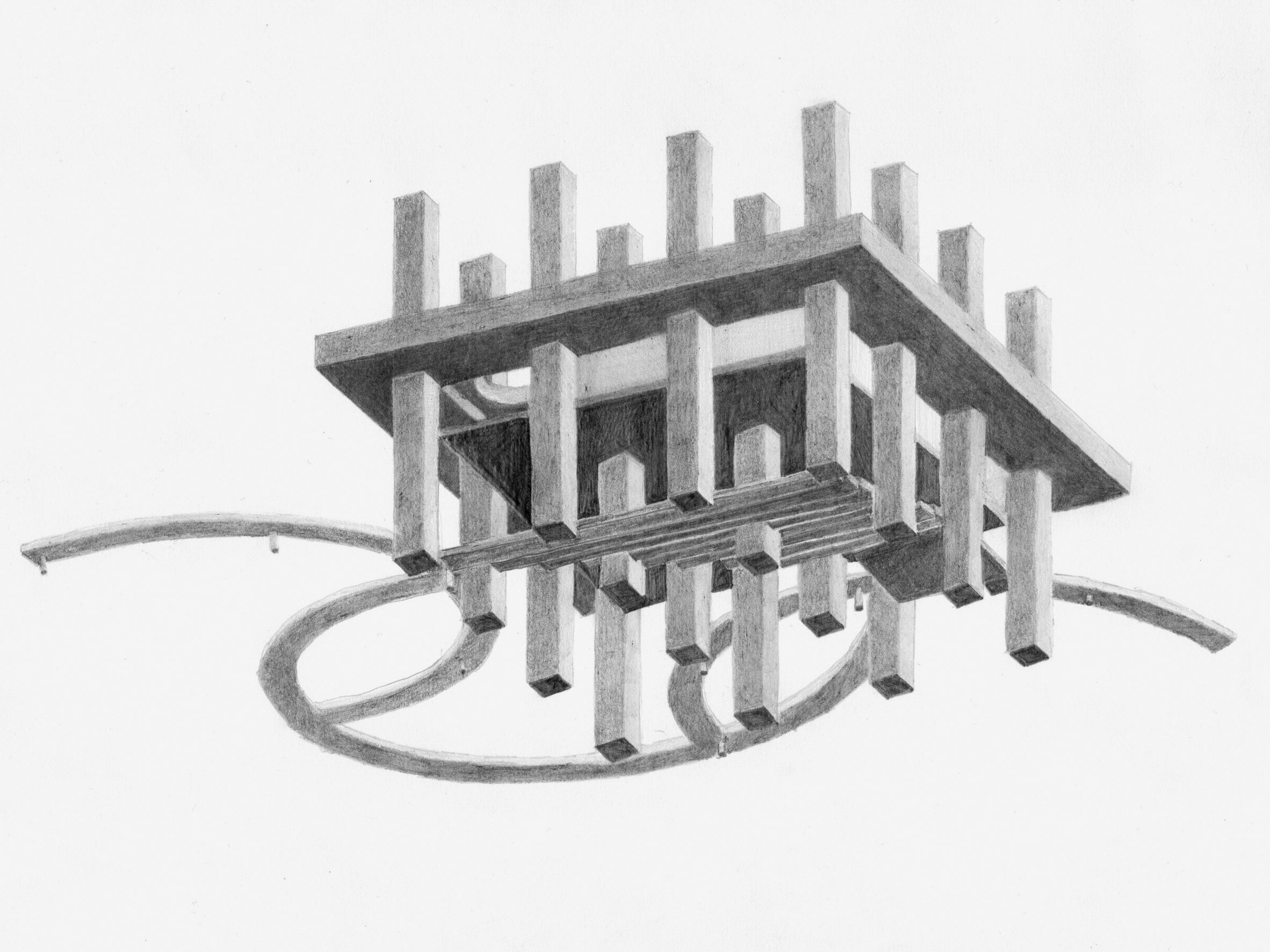 Колонны высотой 10 метров образуют четкую квадратную сетку, разделенную посередине бетонной плитой такой же толщины. Плита служит основой просторной террасы с балюстрадой. Столовая на 100 мест, кухня и другие помещения расположены под землей и покрыты ступенчатой площадкой.