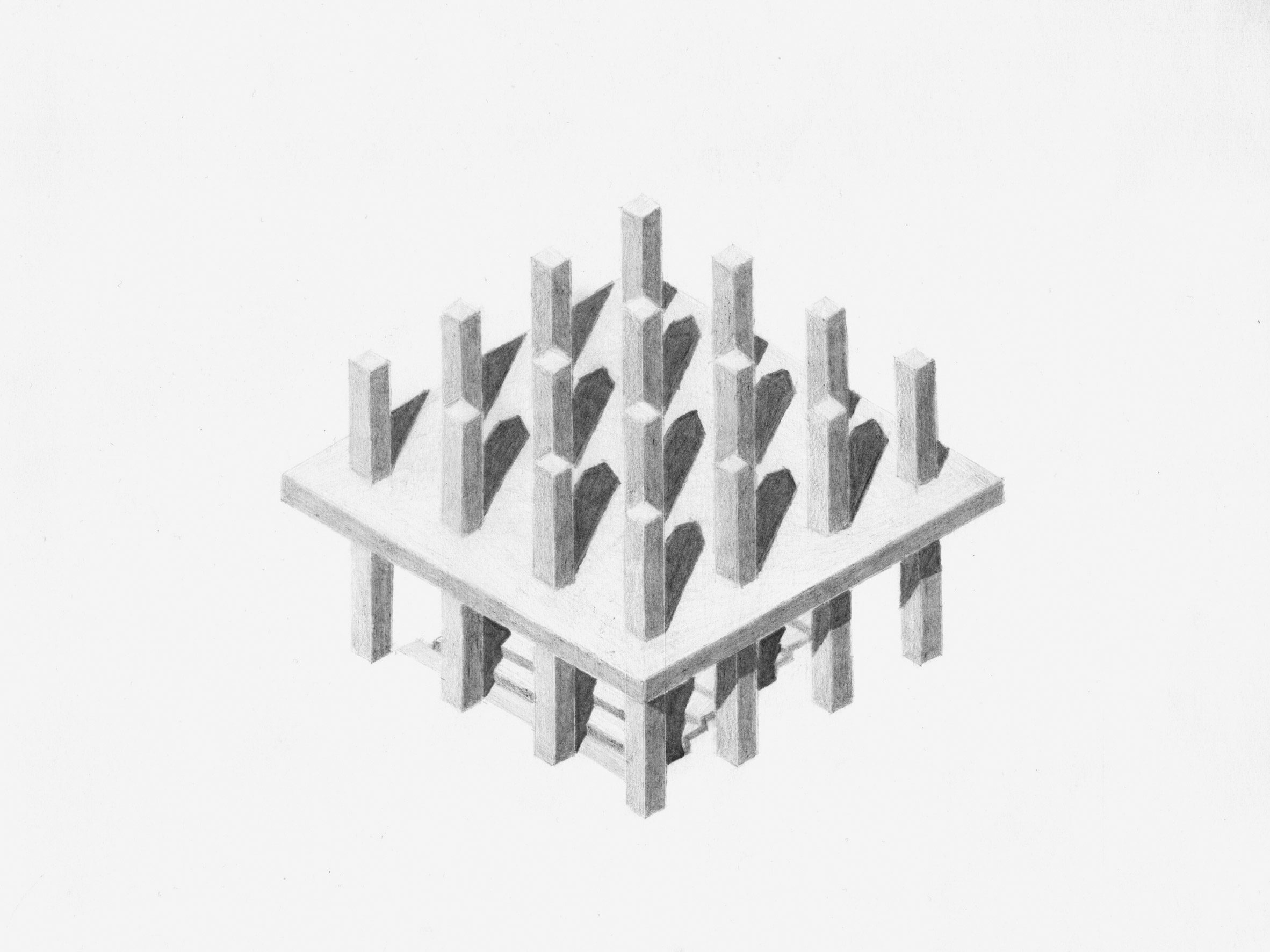 «Монументальные колонны и плиты своим масштабом создают ощущение вневременного присутствия, отбрасывают загадочные тени и приглашают к созерцанию», — поясняют авторы. Впервые в качестве основной организационной системы они используют колонны, предполагая воспринимать их не только как опоры, но и как основу для украшения: «К ним можно прикрепить гирлянды, свечи или навесы». По замыслу эта сдержанная выразительность оставляет «физическое и духовное пространство для заполнения».
