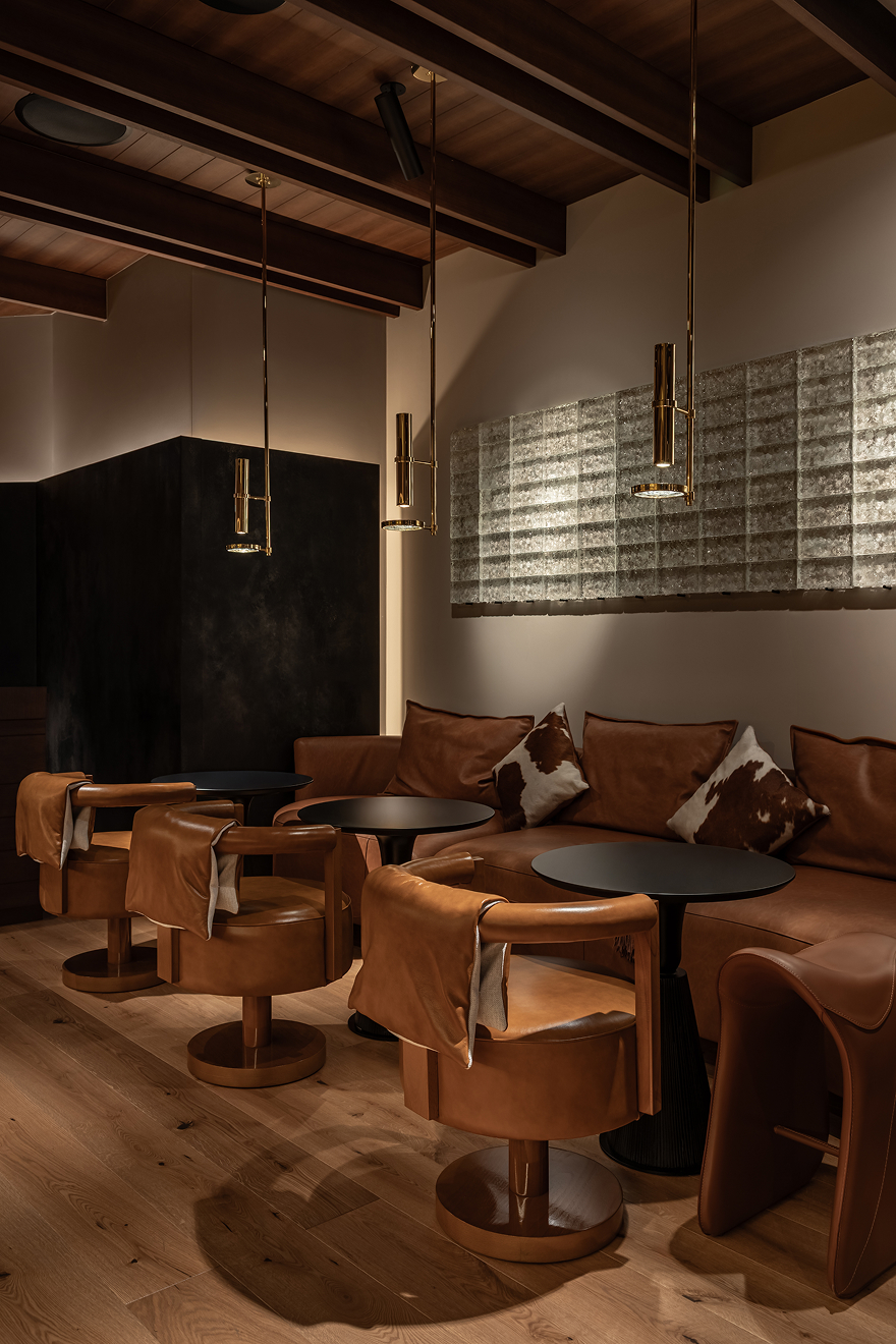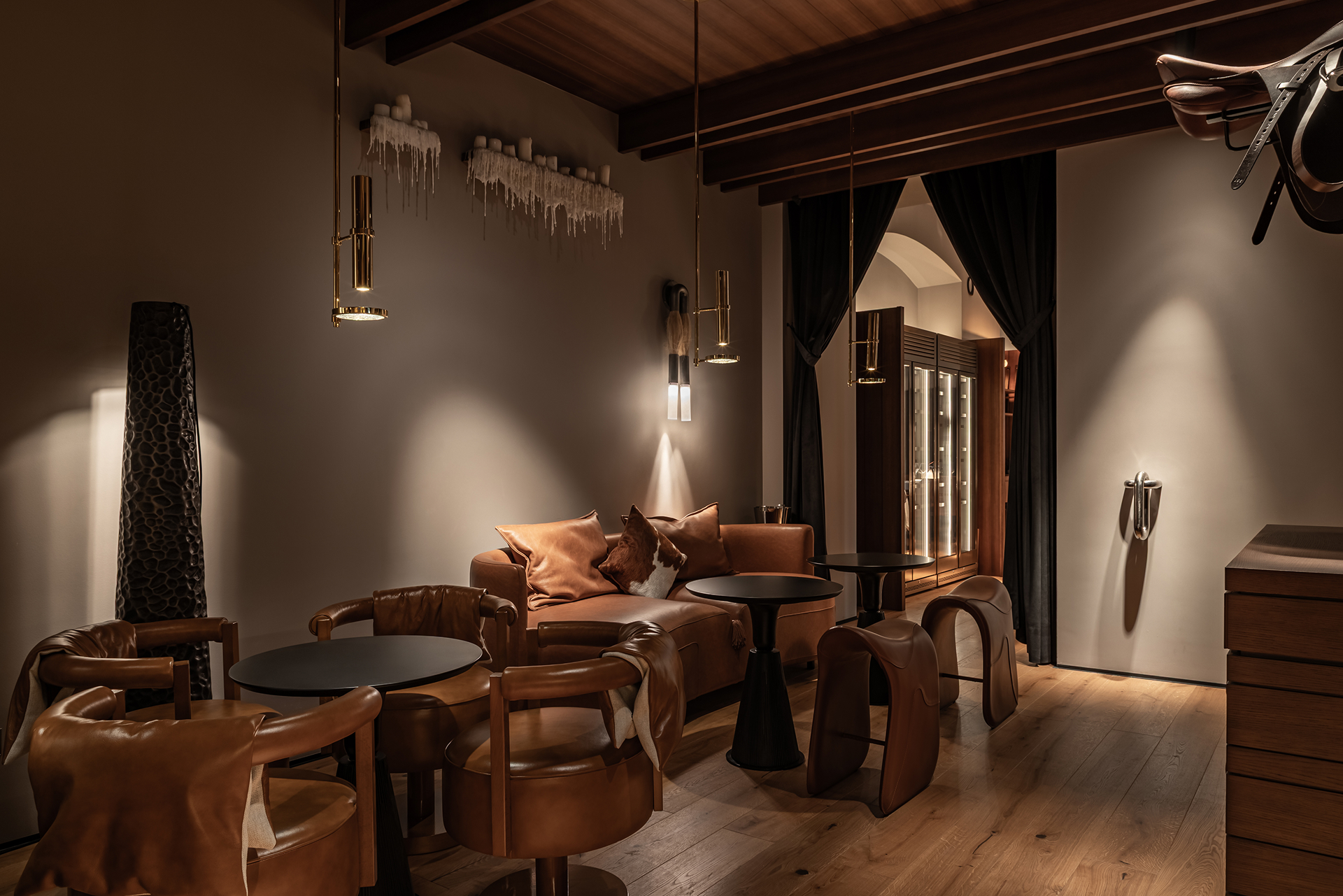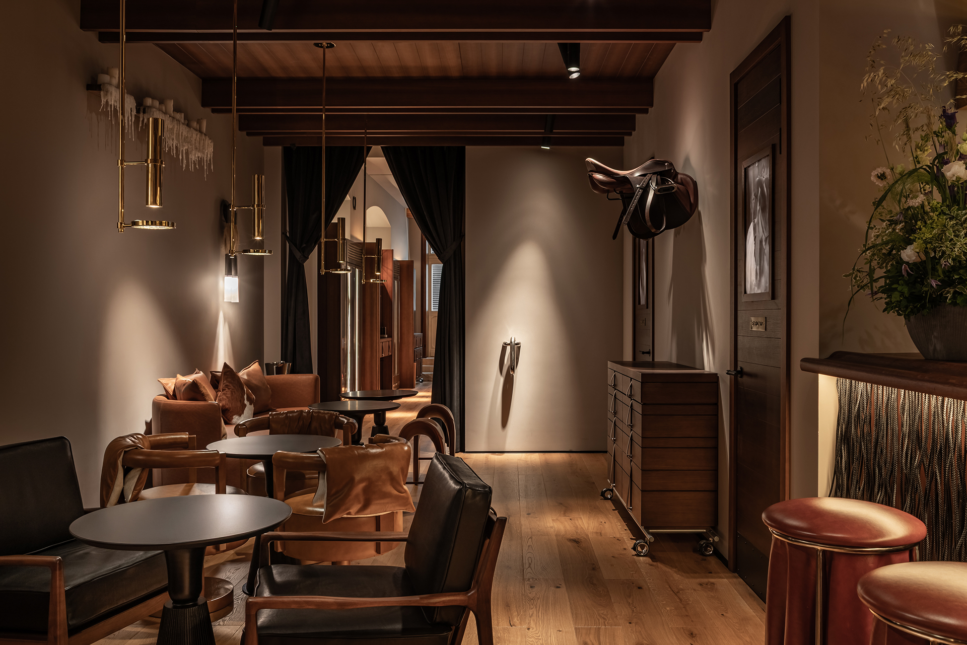 Гости могут отдохнуть в баре с приятной на ощупь деревянной стойкой, расположившись на табуретке в форме седла или на мягких креслах и диванах, обитых шорно-седельной кожей. А если вы посмотрите вверх, то увидите настоящее седло для конкура, свисающее с потолка. Еще одно оригинальное решение касается дверей в ванную. Они выполнены в виде входов в денники, но вместо окон установлены экраны, на которых транслируется видео с лошадью, как если бы она находилась внутри. Лошадь ходит по загону и периодически подходит к окну, высовывая в него морду. Дополняют атмосферу подковы, которые по народному поверью приносят удачу.