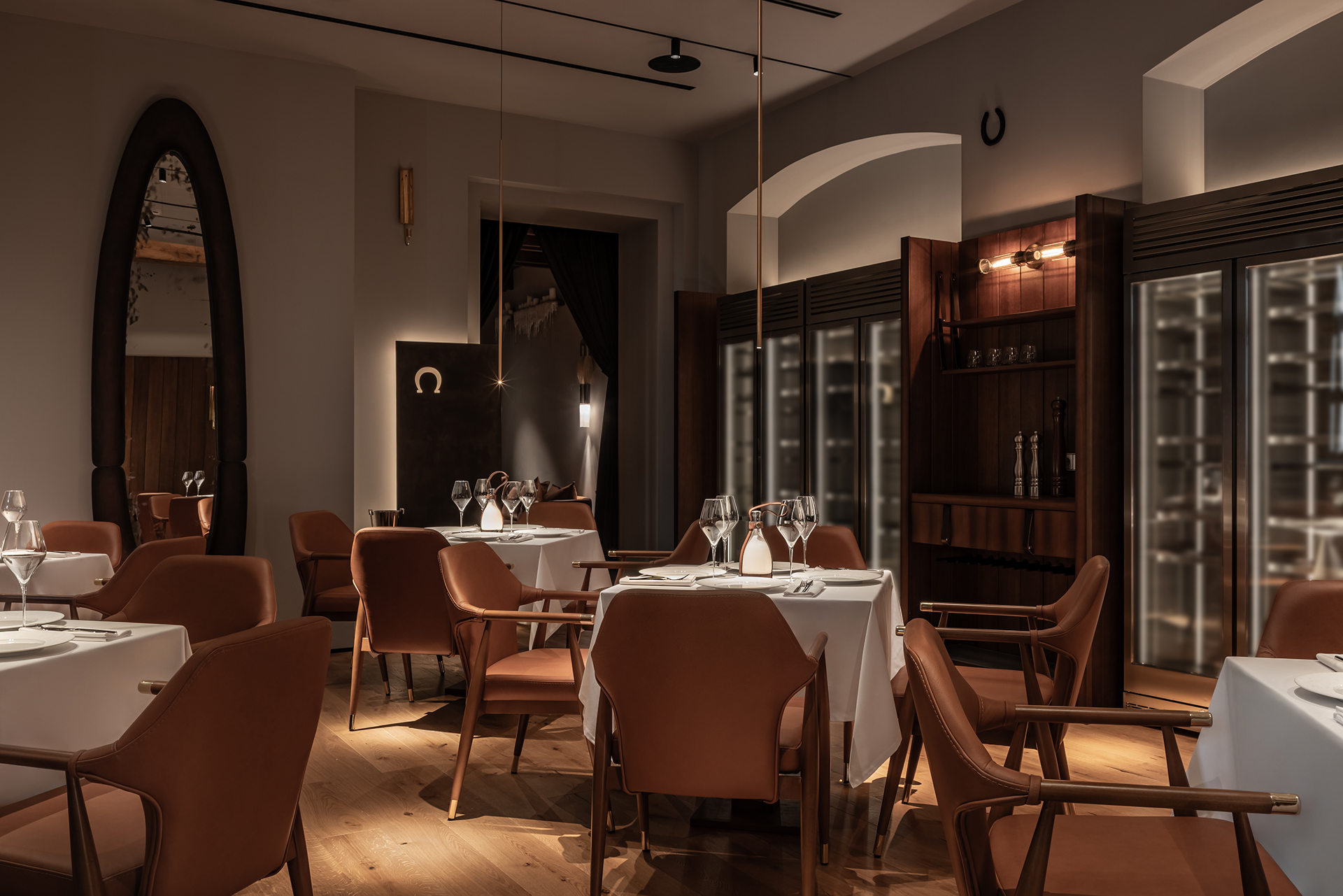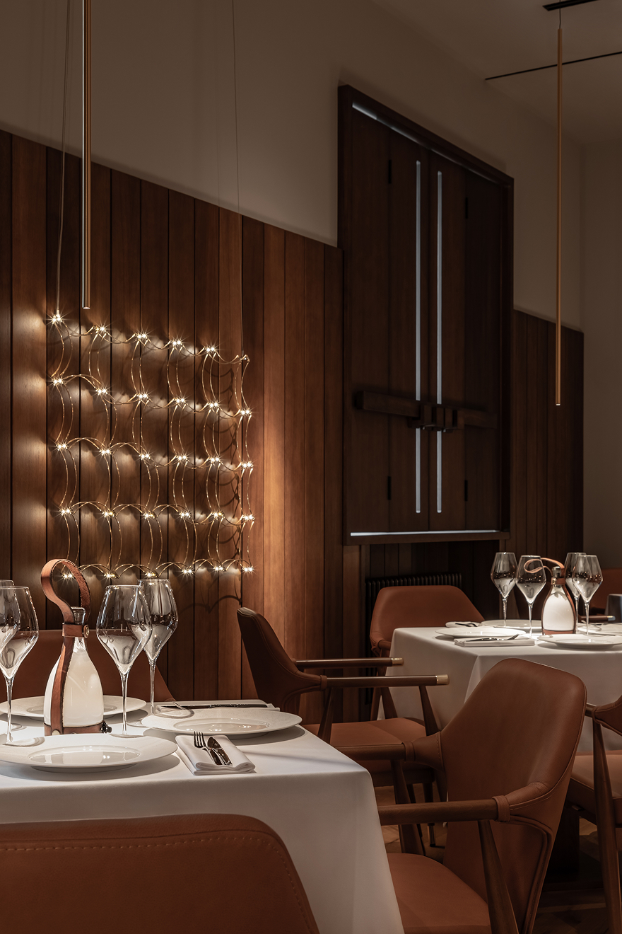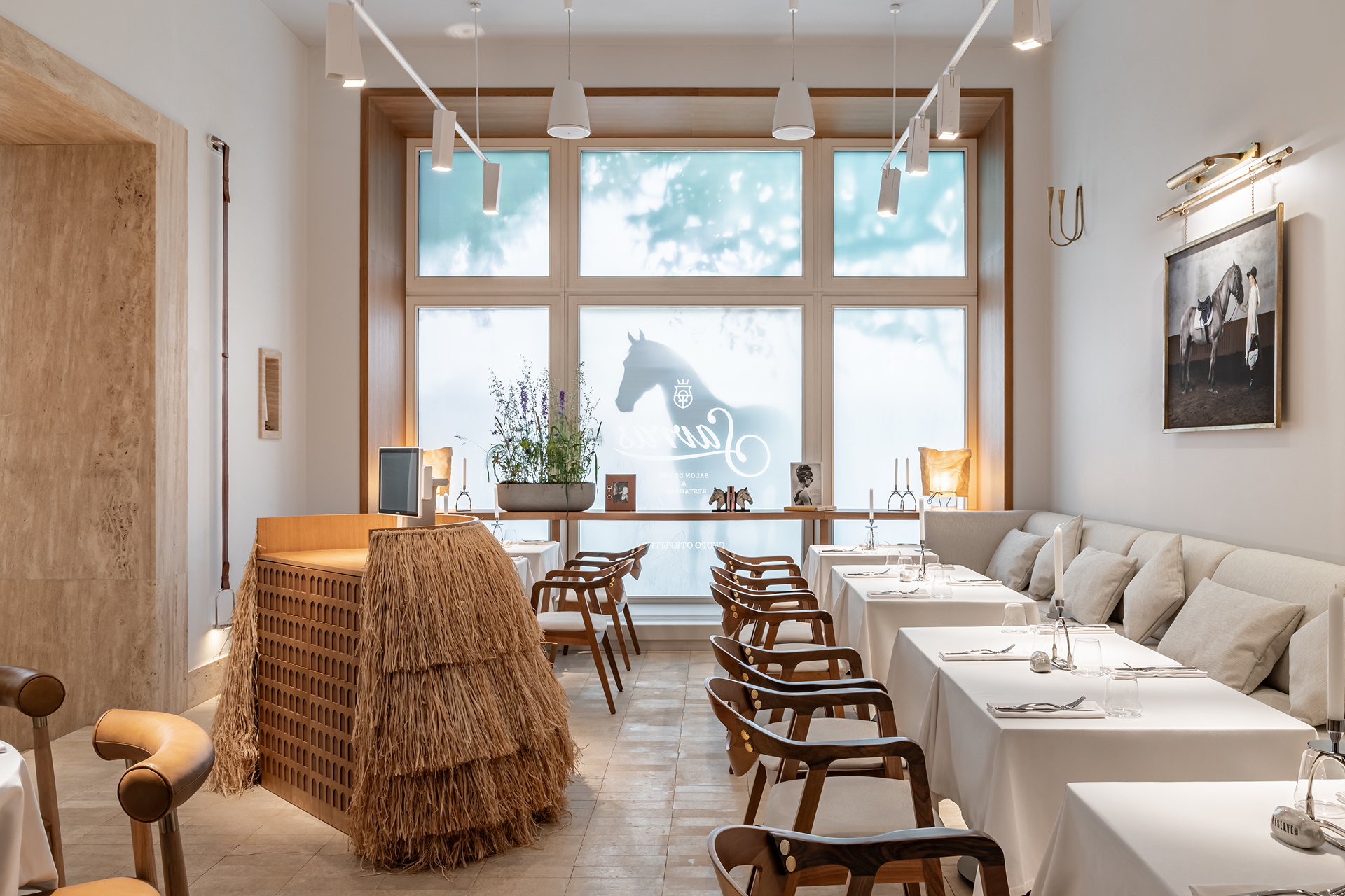 Любовь рестораторов к конному спорту проявляется в двух других залах – баре и изысканной столовой, сильно отличающихся от первой части и оформленных в темных тонах. Для отделки потолка и стен использован экзотический шпон дерева Etomoe («тигровое дерево»). Естественно, он имеет темно-красно-коричневый оттенок, что придает ему вид старых досок конюшни, пропитанных водой и временем. Винные погреба, станции техобслуживания, ставни, светильники, оформленные в едином экологическом стиле, все выполнено по рисункам дизайнеров.