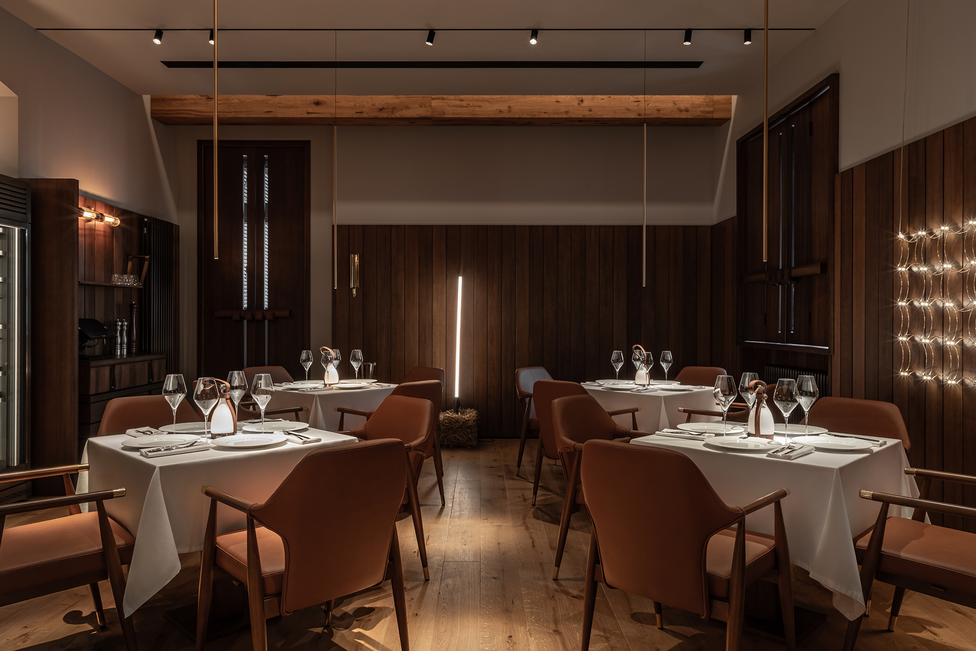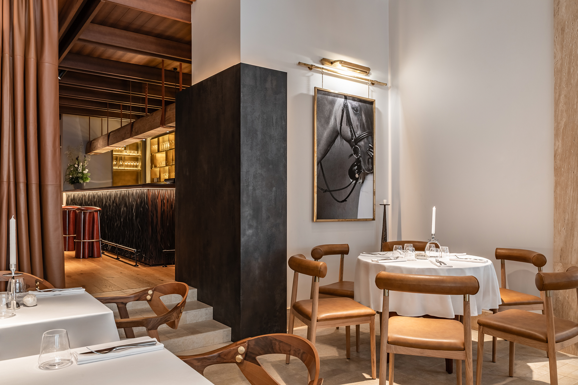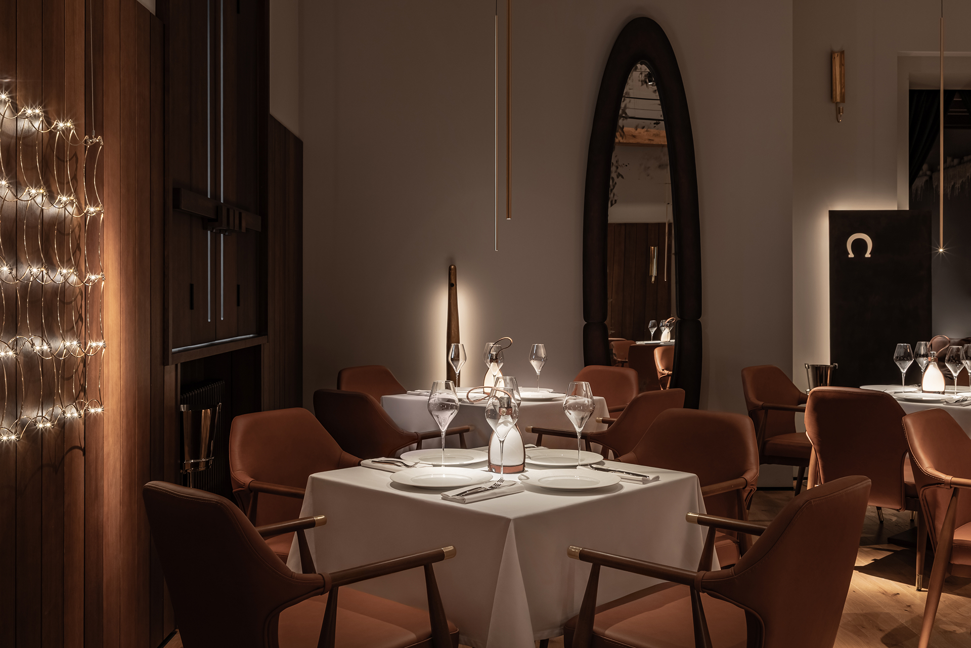 Любовь рестораторов к конному спорту проявляется в двух других залах – баре и изысканной столовой, сильно отличающихся от первой части и оформленных в темных тонах. Для отделки потолка и стен использован экзотический шпон дерева Etomoe («тигровое дерево»). Естественно, он имеет темно-красно-коричневый оттенок, что придает ему вид старых досок конюшни, пропитанных водой и временем. Винные погреба, станции техобслуживания, ставни, светильники, оформленные в едином экологическом стиле, все выполнено по рисункам дизайнеров.
