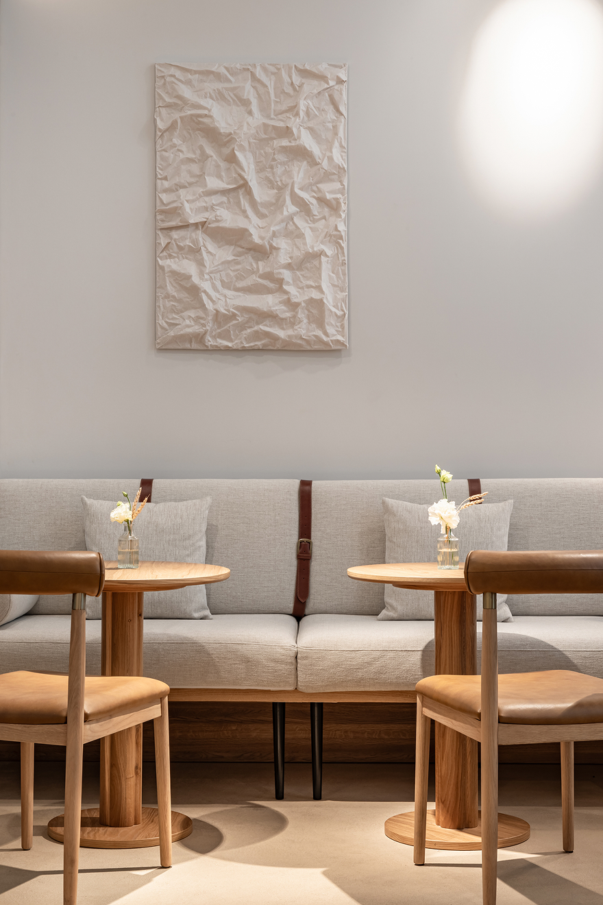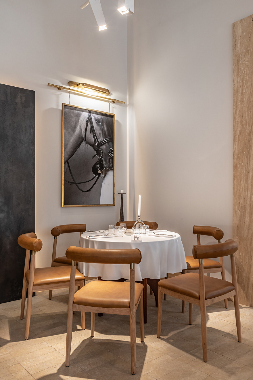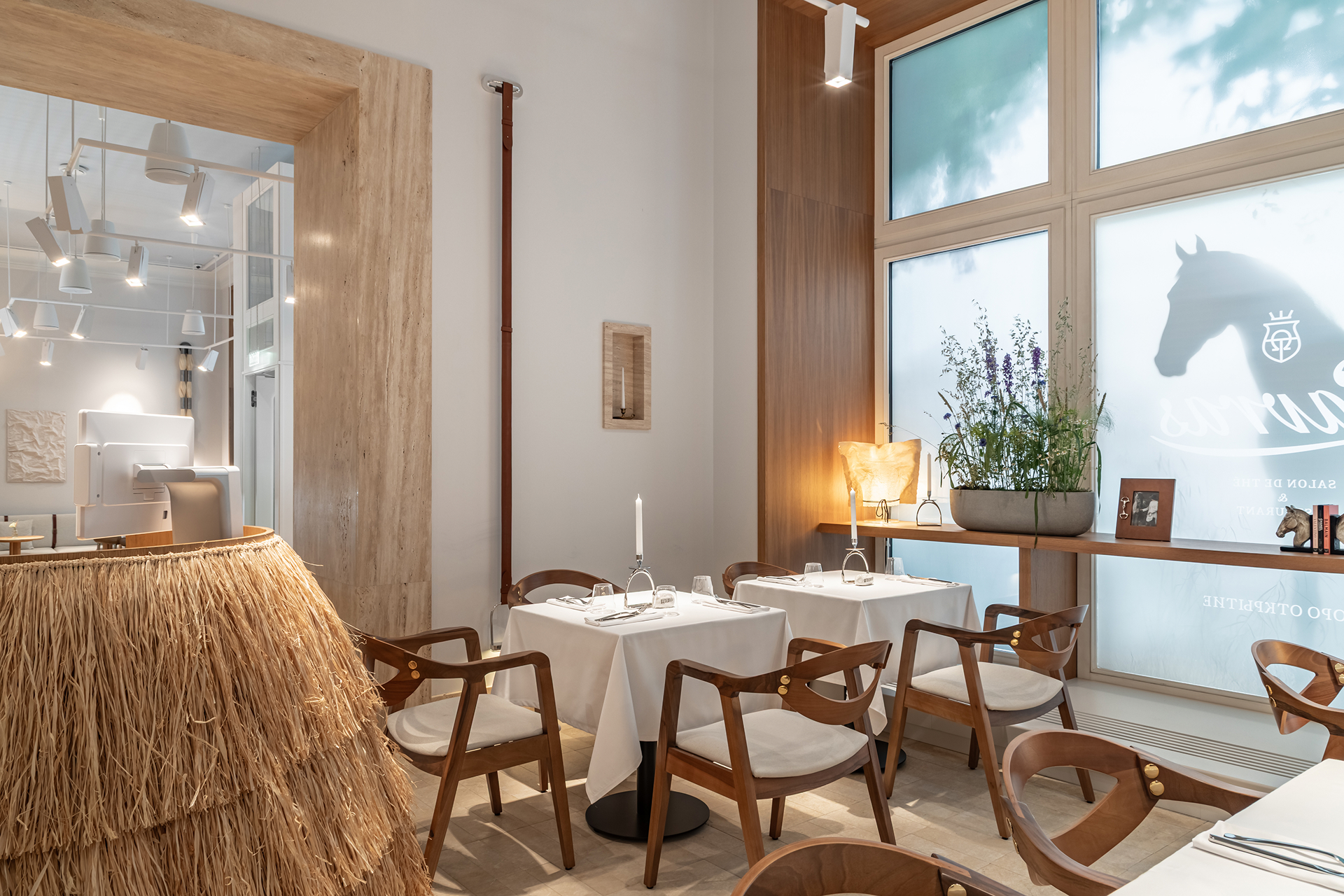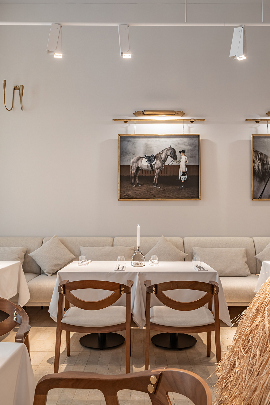 Кондитерская плавно перетекает во вторую столовую. Акцент также делается на светлые тона. Оштукатуренные стены украшены арт-объектами из мятой бумаги. Аксессуары напоминают об истории места, а также тонко отсылают к теме старых конюшен, которая все больше раскрывается в двух задних комнатах ресторана. Станция официантов оформлена в виде стога сена, а на стенах висит серия фотографий Ивана Рудыка с саврасскими лошадьми, выполненная в стиле модной фотографии.
