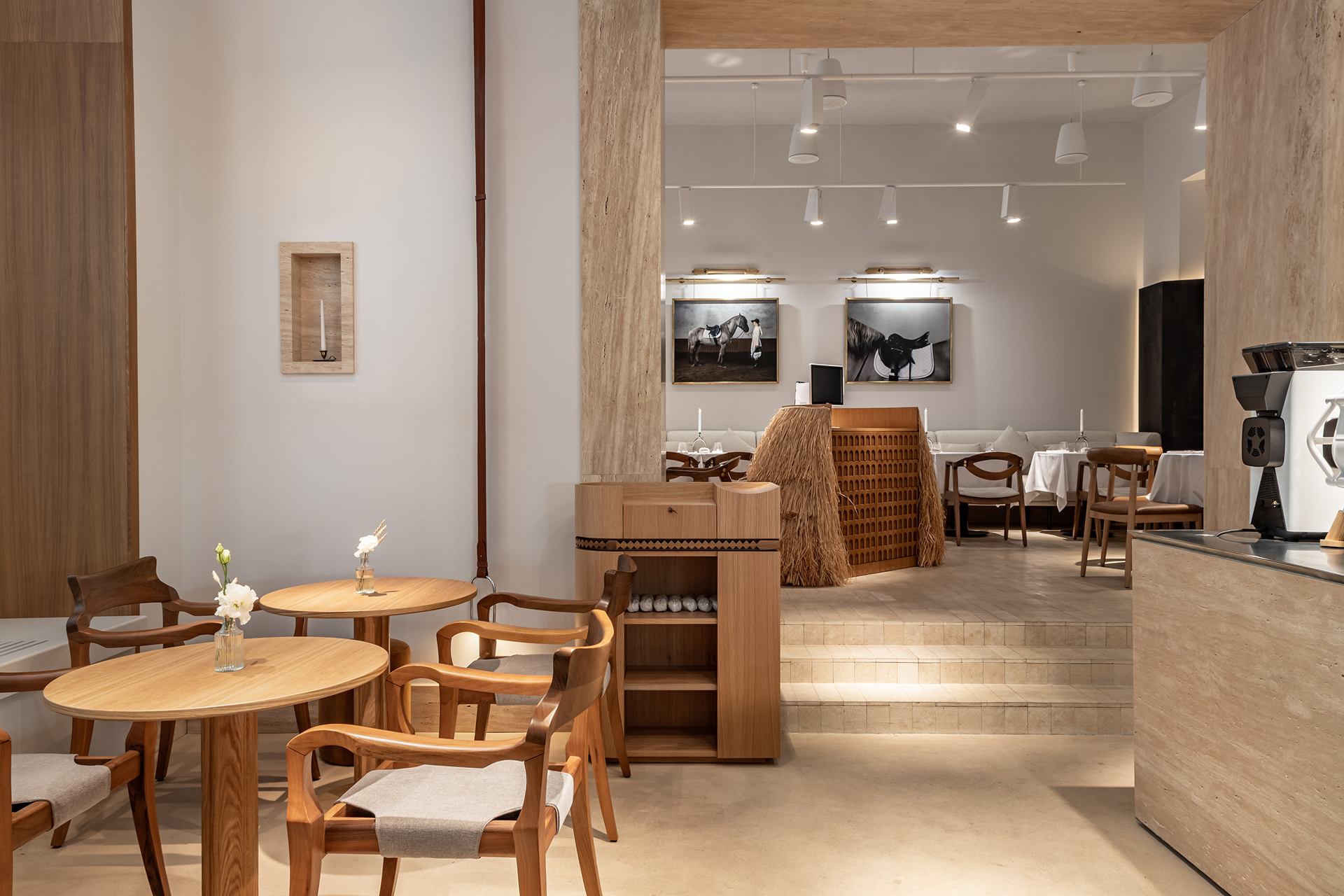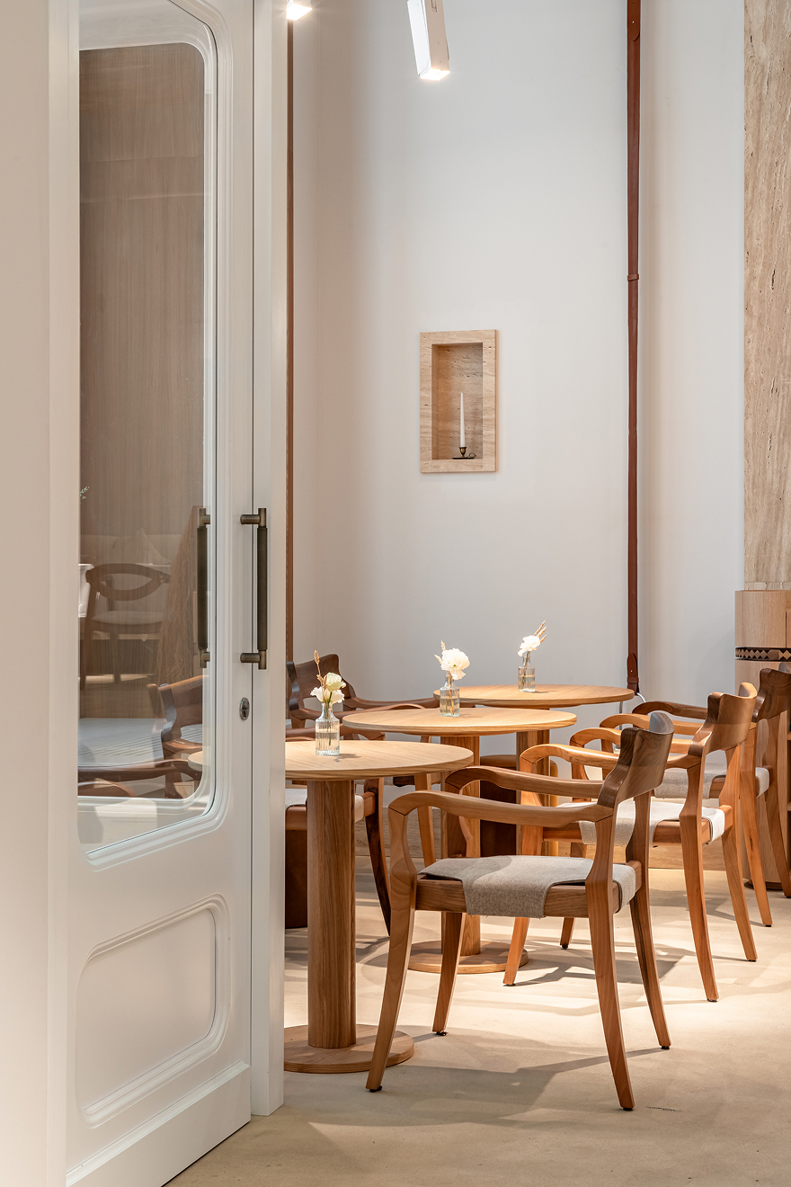 Мебель легкая и не перегружает пространство. Голубовато-серый потолок, как и лепнина, был тщательно восстановлен из имеющихся фрагментов. Полы выложены травертином и выложены простой брусчаткой, интерпретированной в современном стиле. Кондитерская витрина украшена плитами травертина – здесь можно заказать кофе, десерты и один из 50 сортов чая из личной коллекции владельцев Savras.