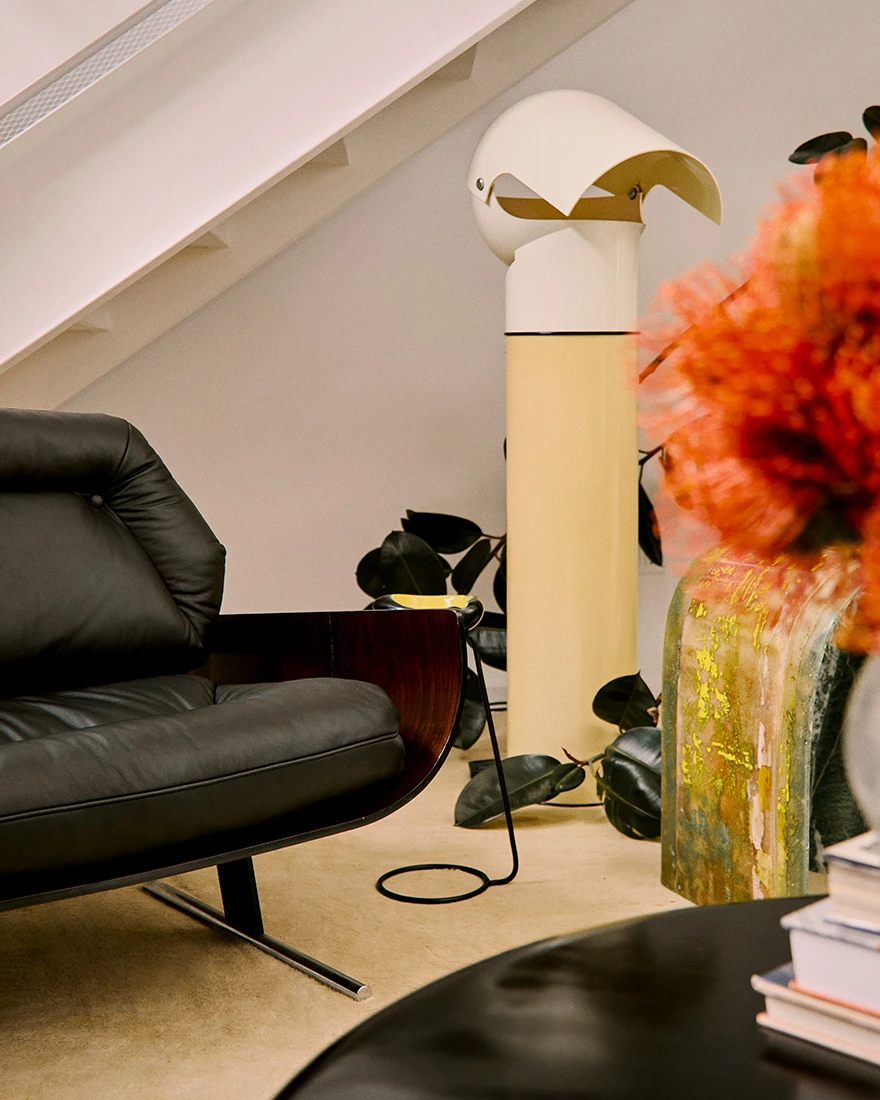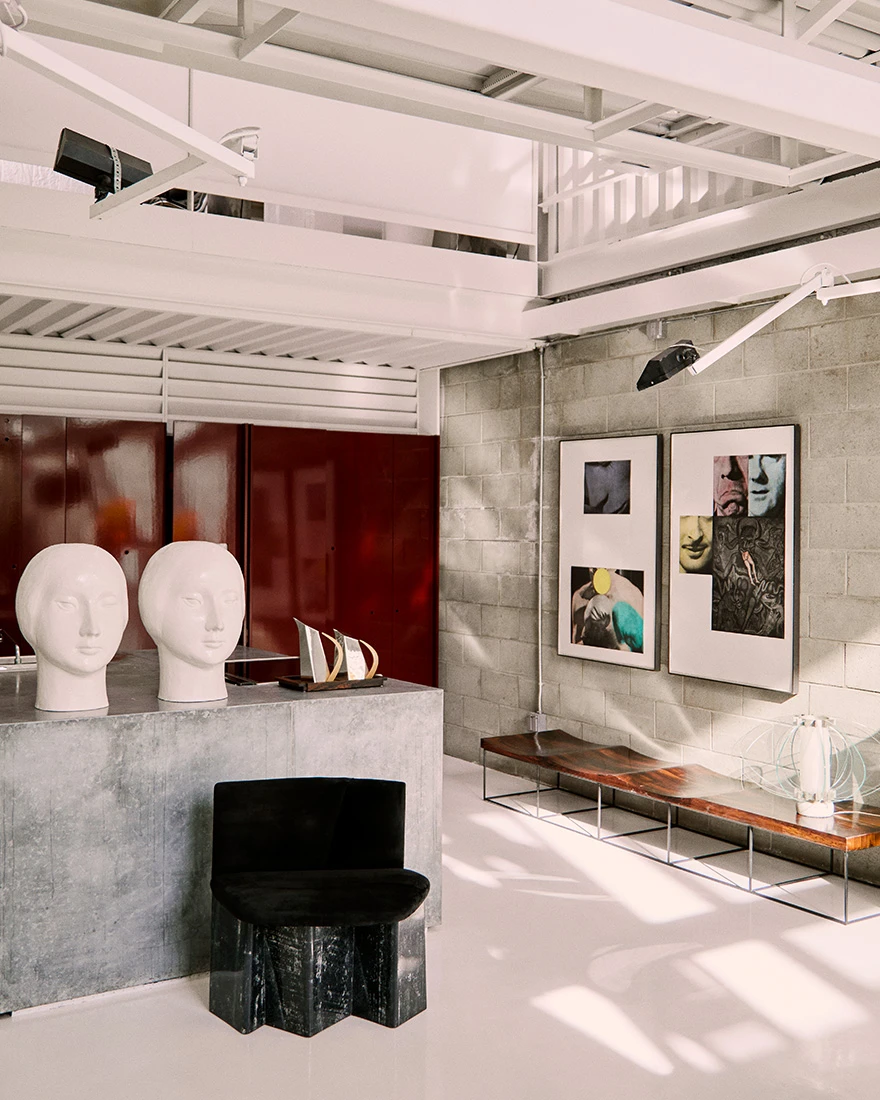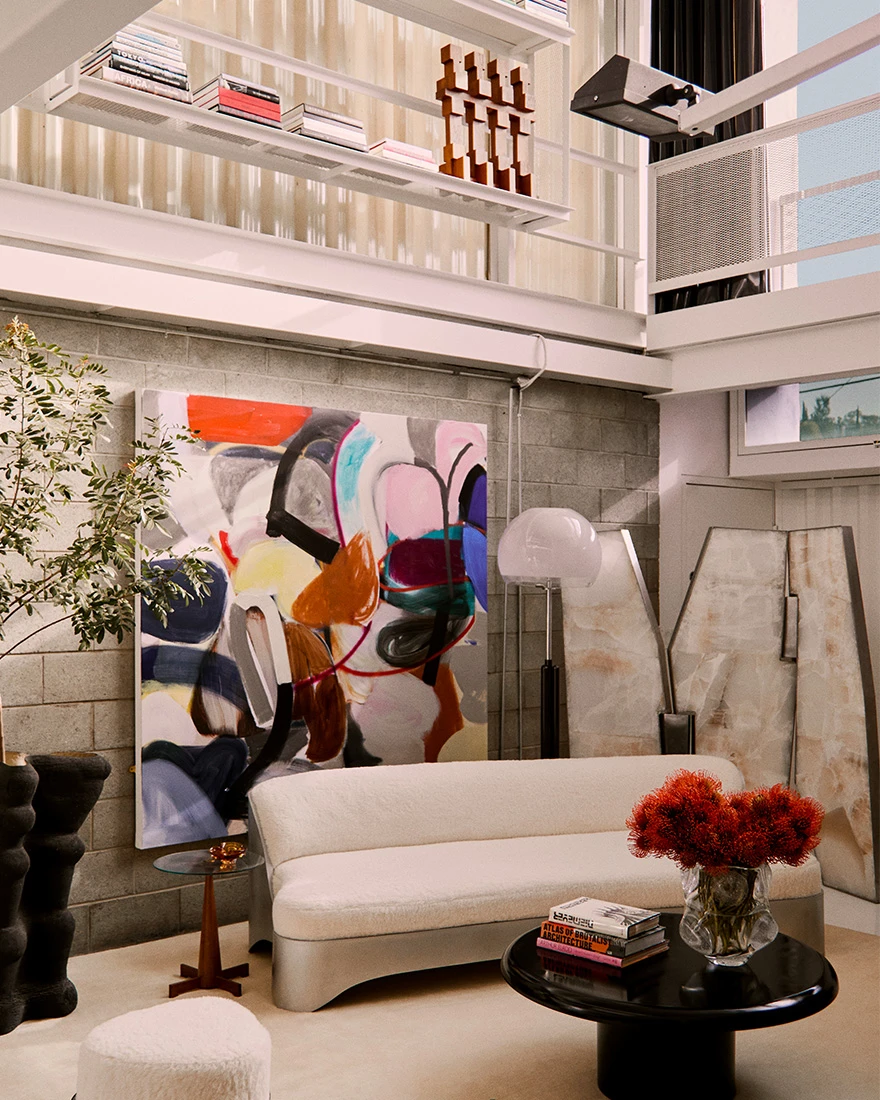 Строгая индустриальная эстетика подчеркнута контрастным содержанием: классика дизайна, которая помогла распространить дух Италии за рубежом — мебель Анджело Манджаротти, Гае Ауленти и Гаэтано Пеше, а также работы художников Ванессы Бикрофт и Роджера Хермана дополняют эклектичный ансамбль.
