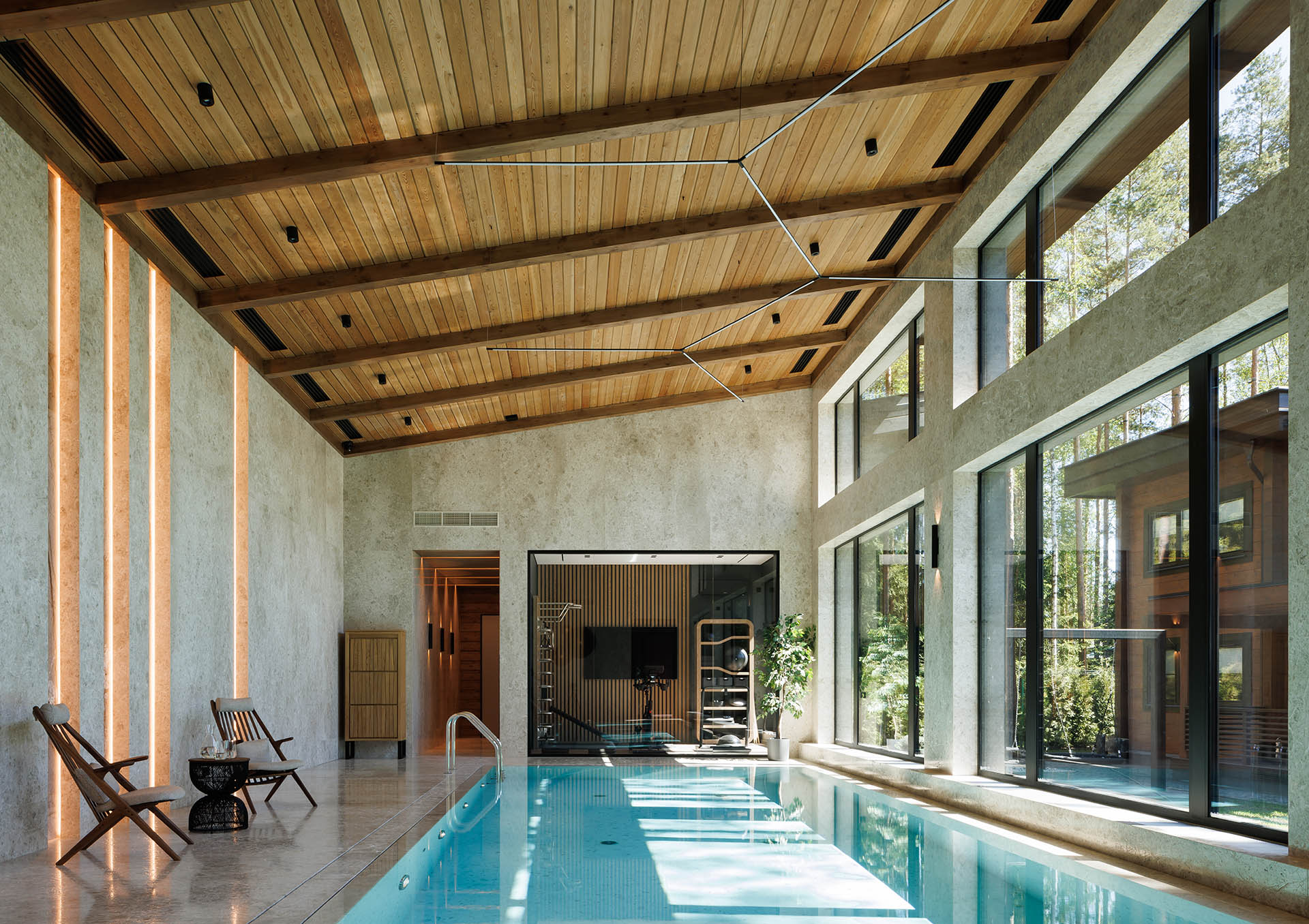 Санаторий представляет собой одноэтажное здание с многоуровневой покатой крышей. Центральная часть, где расположен бассейн, значительно выше. Имеет панорамное остекление, что позволяет владельцам любоваться северными пейзажами через окна в любую погоду. «Проектирование бассейна — технологически сложный процесс: нам пришлось подумать о системах очистки воды, обеззараживания, фильтрации, подогрева воды, поддержания температуры воздуха и осушителях. Панорамные окна также должны были соответствовать специфике здания: перед нами стояла задача минимизировать теплопотери», — добавляет дизайнер.