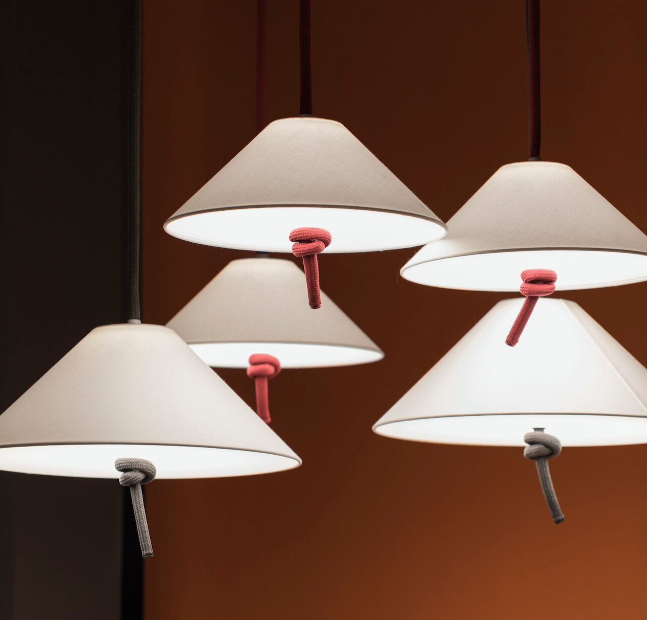 Абажуры доступны в хлопковом и бумажном исполнении Tyvek — яркой палитре, которая сохраняет сдержанный шарм коллекции. Серые или красные шнуры контрастируют с молочно-белыми абажурами, привнося в дизайн спокойную напряженность: легкость сочетается с весом, мягкость со структурой. Этот диалог фактур также помогает создать двойной образ: светильник HAT одновременно классический и современный, универсальный, но в то же время с сильным характером.