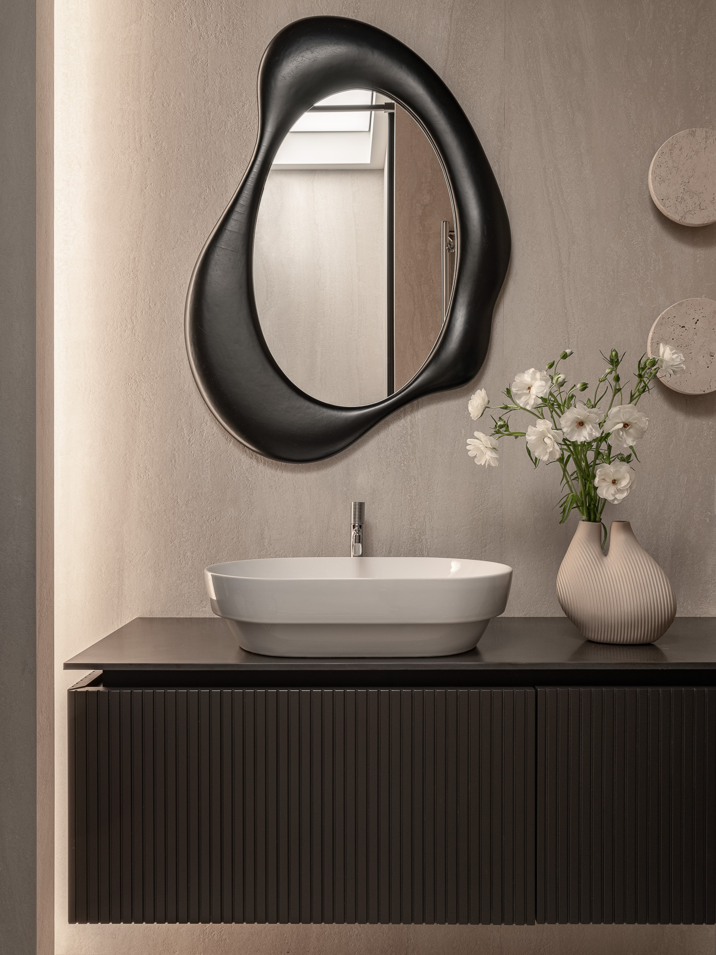 Внутри дизайнер решил сохранить мягкие линии и декоративность, характерные для стиля. Так появляются богато украшенные карнизы и розетки с цветочным орнаментом, арочные проемы, ведущие в гостиную и кухню, а также полукруглый плавающий потолок с подсветкой в прихожей. «По плану БТИ между мокрой зоной и несущей стеной был очень узкий проход, который нельзя было расширить. И чтобы избежать туннельного эффекта, я придумала такое не совсем стандартное решение», — поясняет Анна.