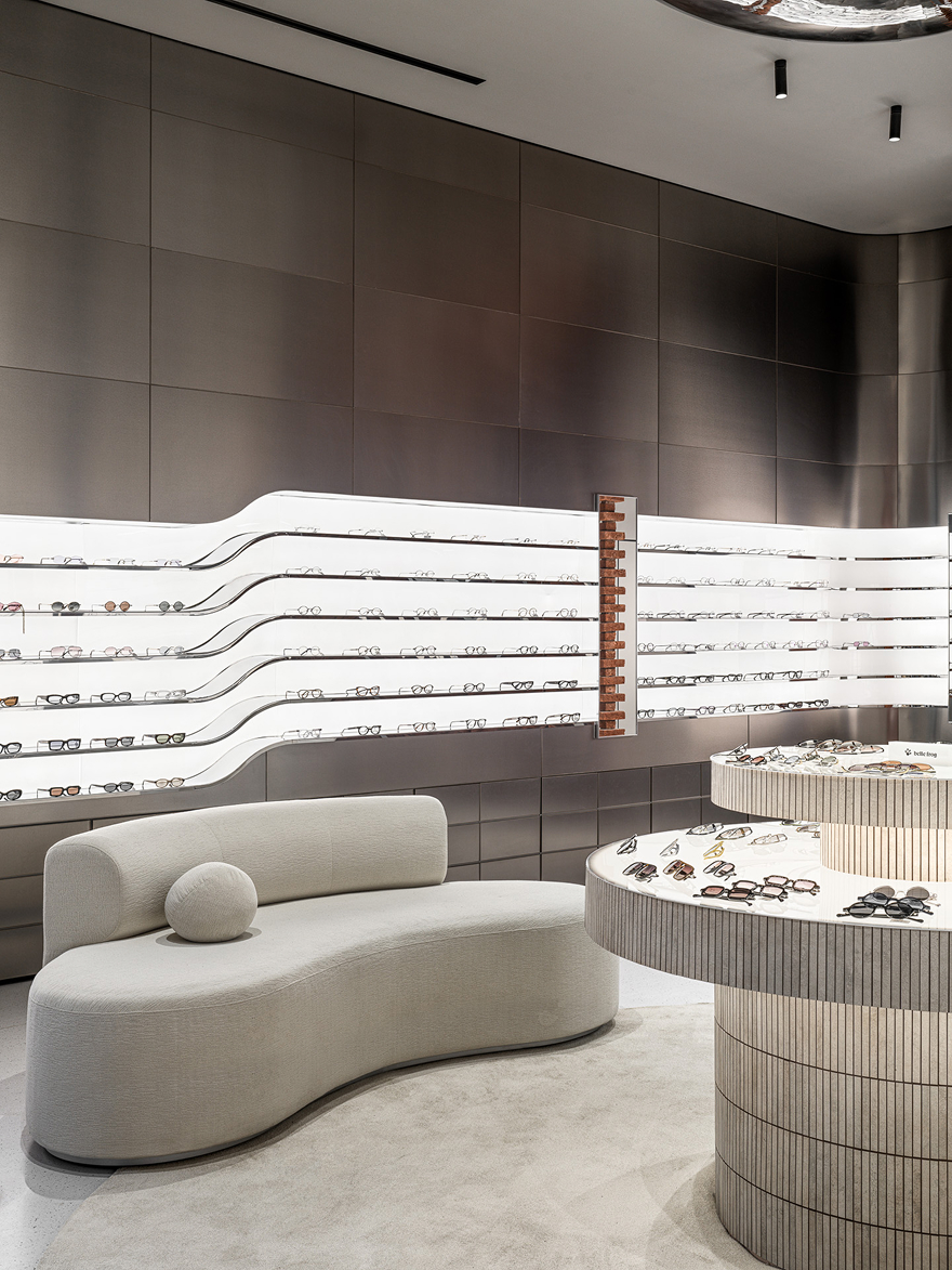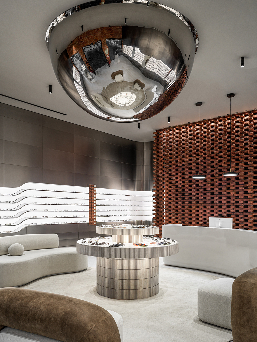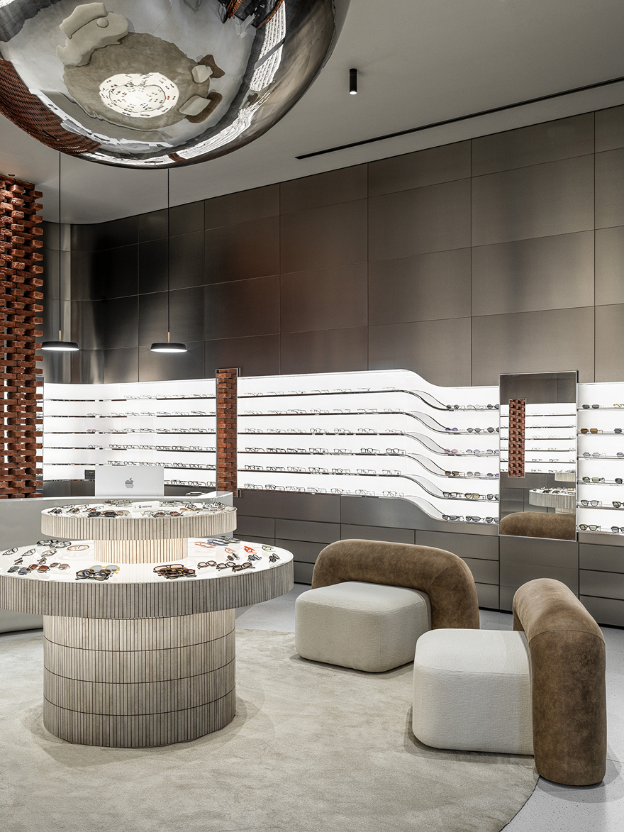 В космосе с площадью 95 квадратных метров. Счетчики сформировали основной зал для выставки и продажи, медицинский офис для проверки видения и функционального экономического блока. Цель — выбранная коллекция очков, эффективно подчеркиваемая хромированным полушарием. Вокруг есть гостиная, удобная для выбора, общения и ожиданий без спешки.
