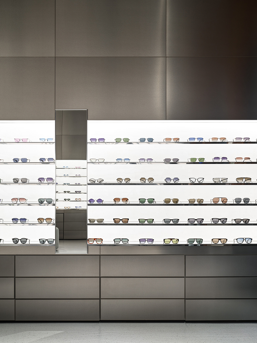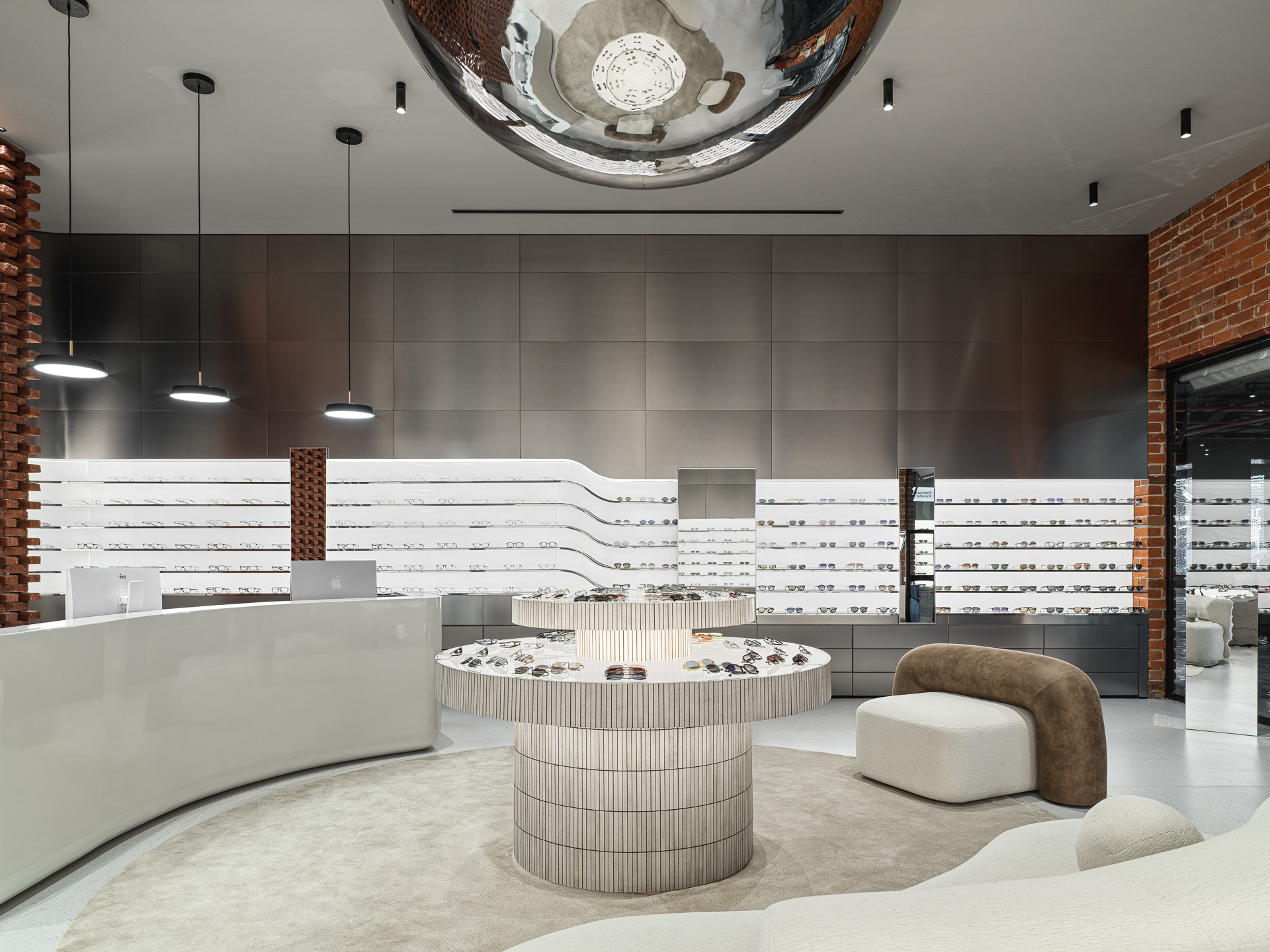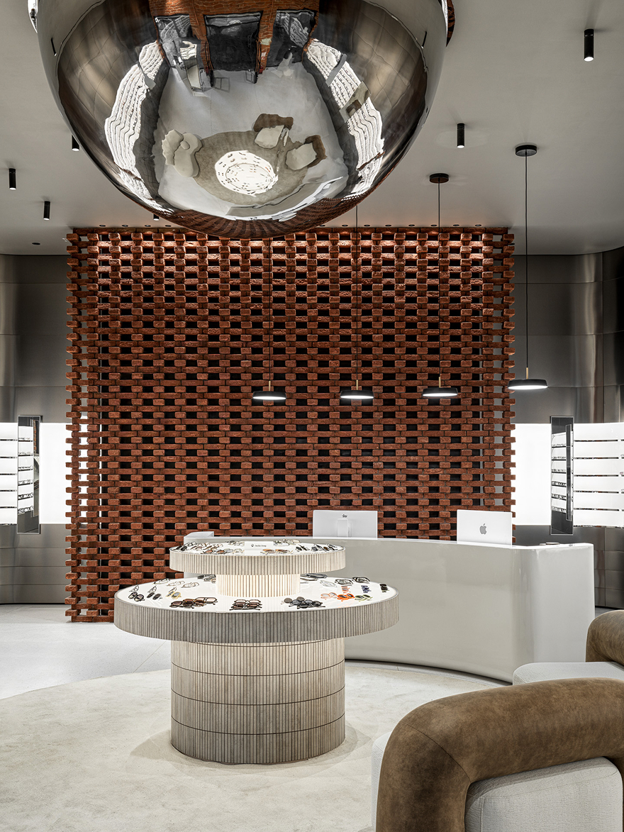 В космосе с площадью 95 квадратных метров. Счетчики сформировали основной зал для выставки и продажи, медицинский офис для проверки видения и функционального экономического блока. Цель — выбранная коллекция очков, эффективно подчеркиваемая хромированным полушарием. Вокруг есть гостиная, удобная для выбора, общения и ожиданий без спешки.