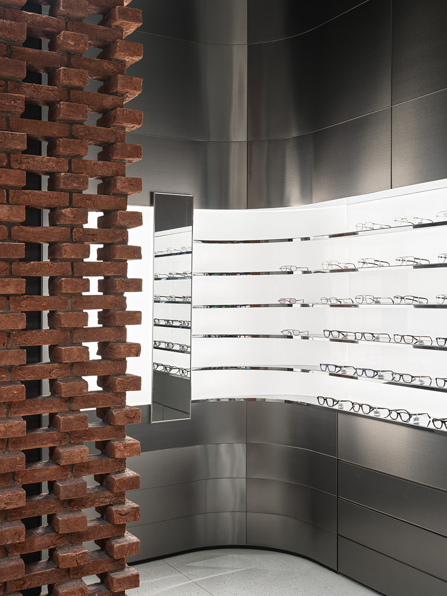 «Очки — это эмоциональный и технологический продукт, поэтому мы объединили свежесть металла с жарой кирпича, создавая мост в истории места и чувственный контраст», — говорят авторы проекта. «Баланс между современными технологиями, комфортом и хорошей ссылкой на историю делает пространство уникальным и запоминающимся».