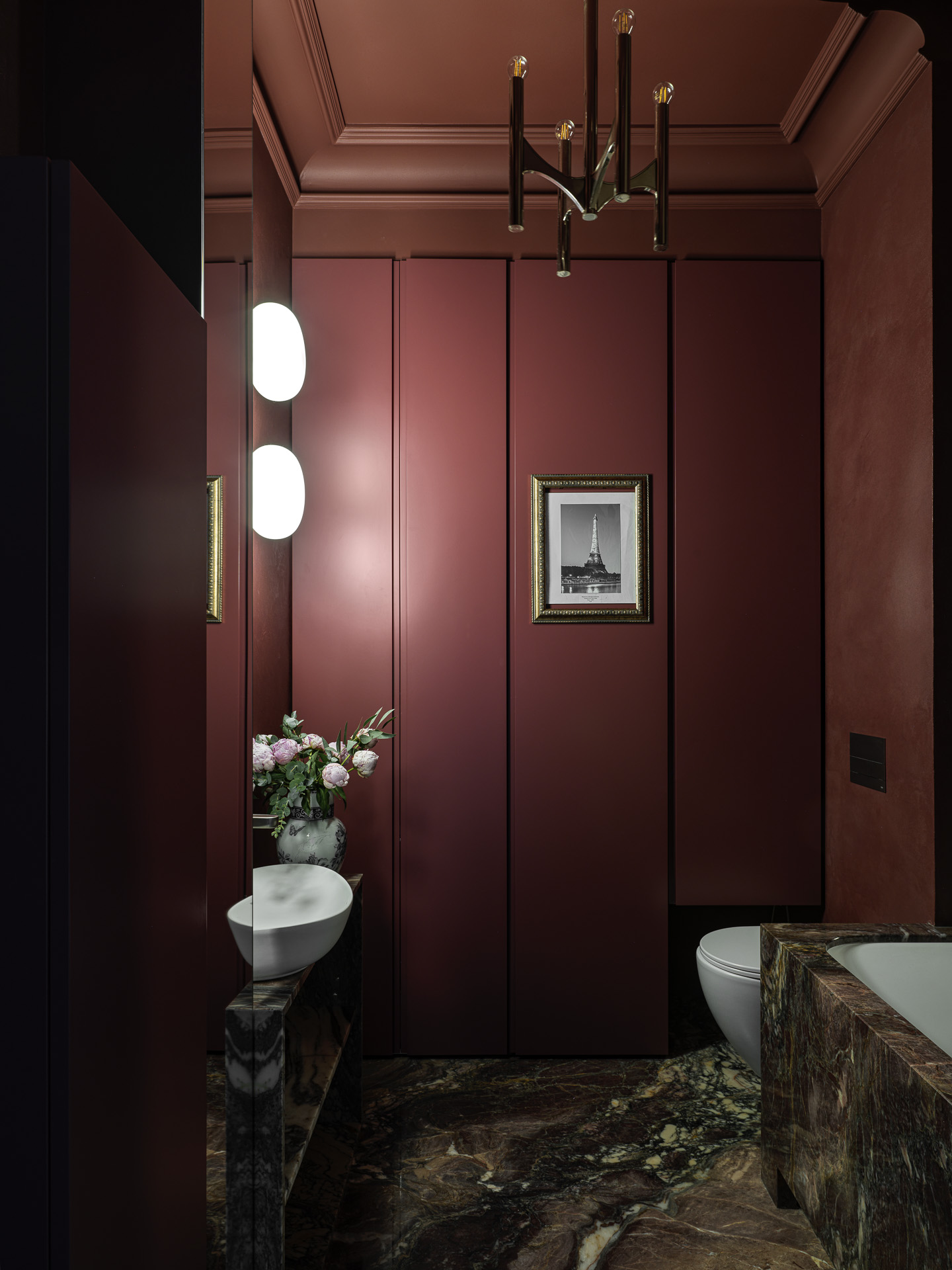 «Палитра подчеркивает настроение каждого пространства: тихая золотистая гостиная, бодрящая, наполненная вином ванная комната и темная спальня. Технологические решения органично интегрированы в интерьер: в гипсовую лепнину встроены канальные кондиционеры, вместо телевизора — лазерный проектор, а за фасадами ванной комнаты спрятана полноценная постирочная».