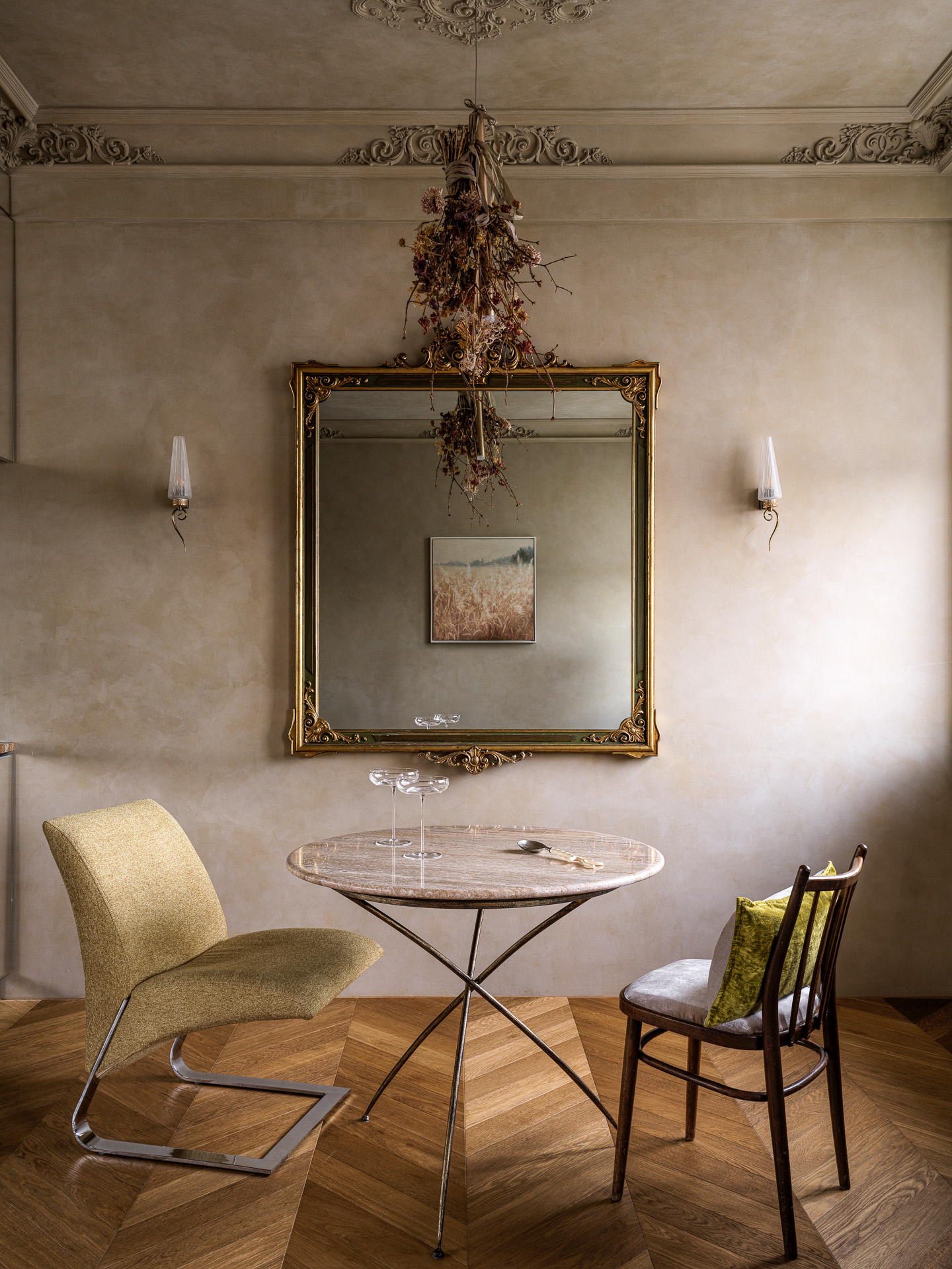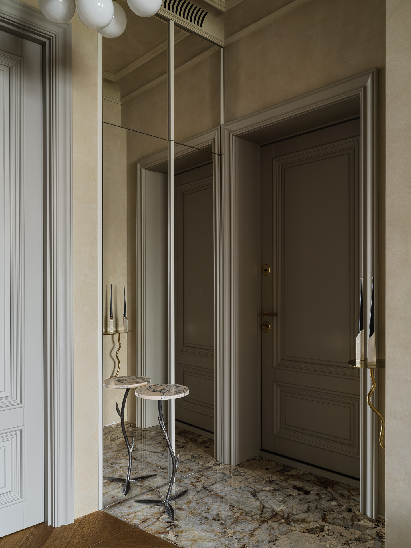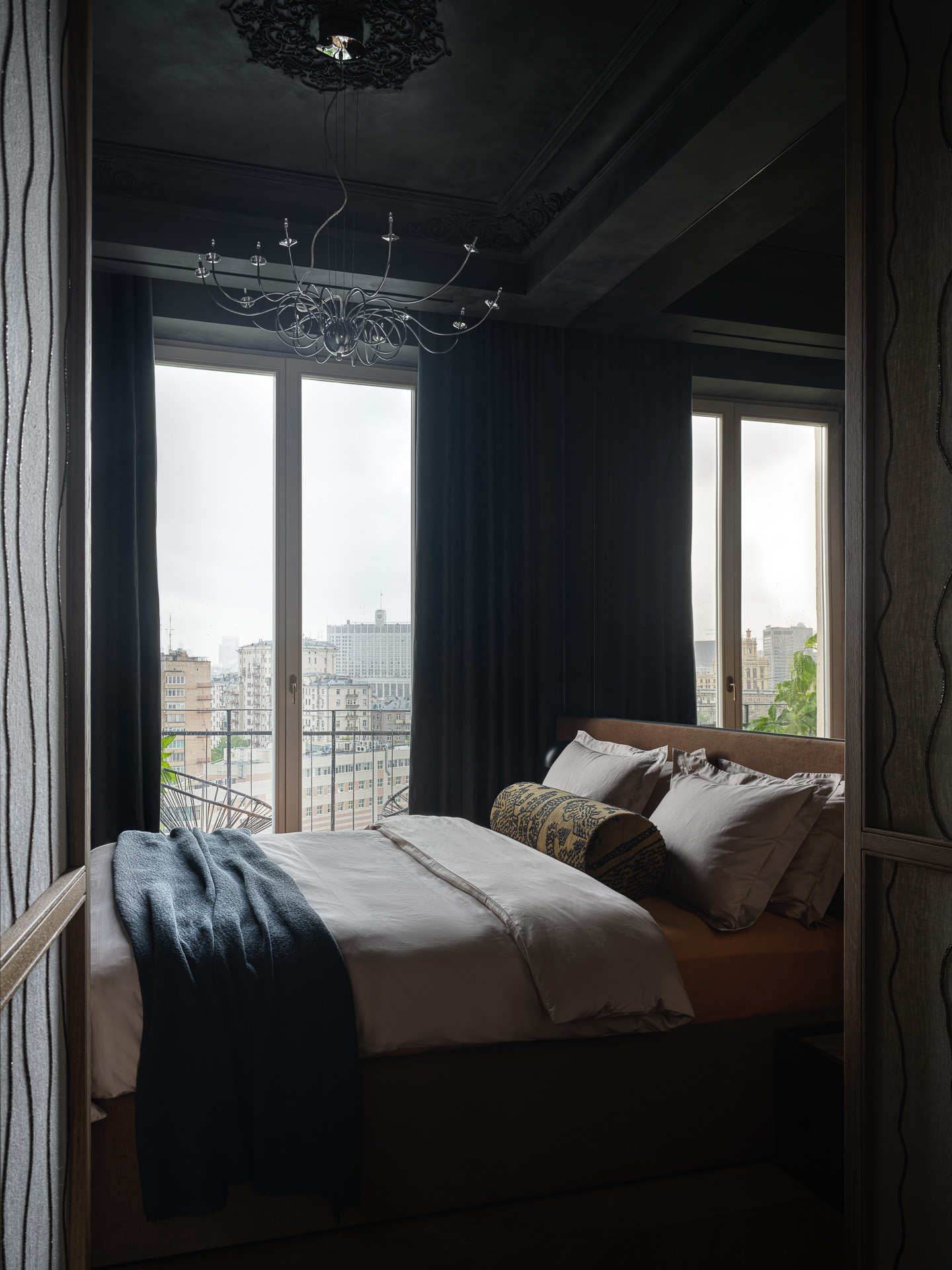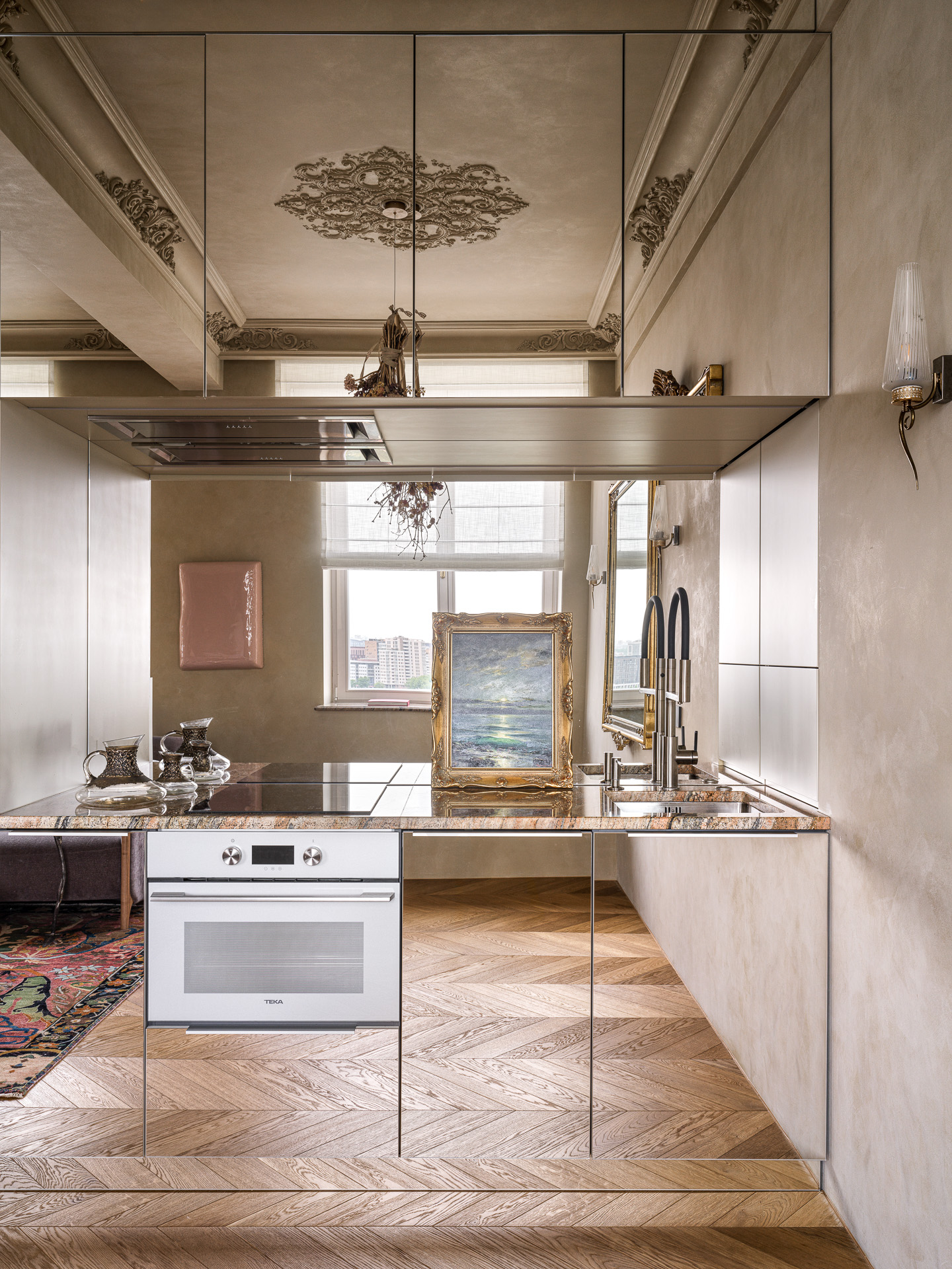 «Одним из самых смелых решений, которые нам удалось реализовать, была кухня, созданная полностью из зеркал. Мне хотелось, чтобы кухня-гостиная не оставляла места для предметов домашнего обихода, а полезные функции растворялись в пространстве. Так кухня исчезла – вместо нее открылся чудесный вид на набережные Москвы-реки. Хотя в моем портфолио много минималистичных проектов, для меня я создала нечто иное: тонкую эстетику старины, любовь к антиквариат и уважение к истории сочетаются в этом интерьере с технологичными решениями.