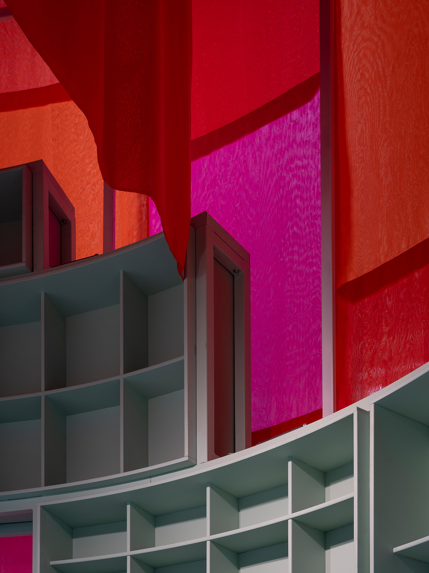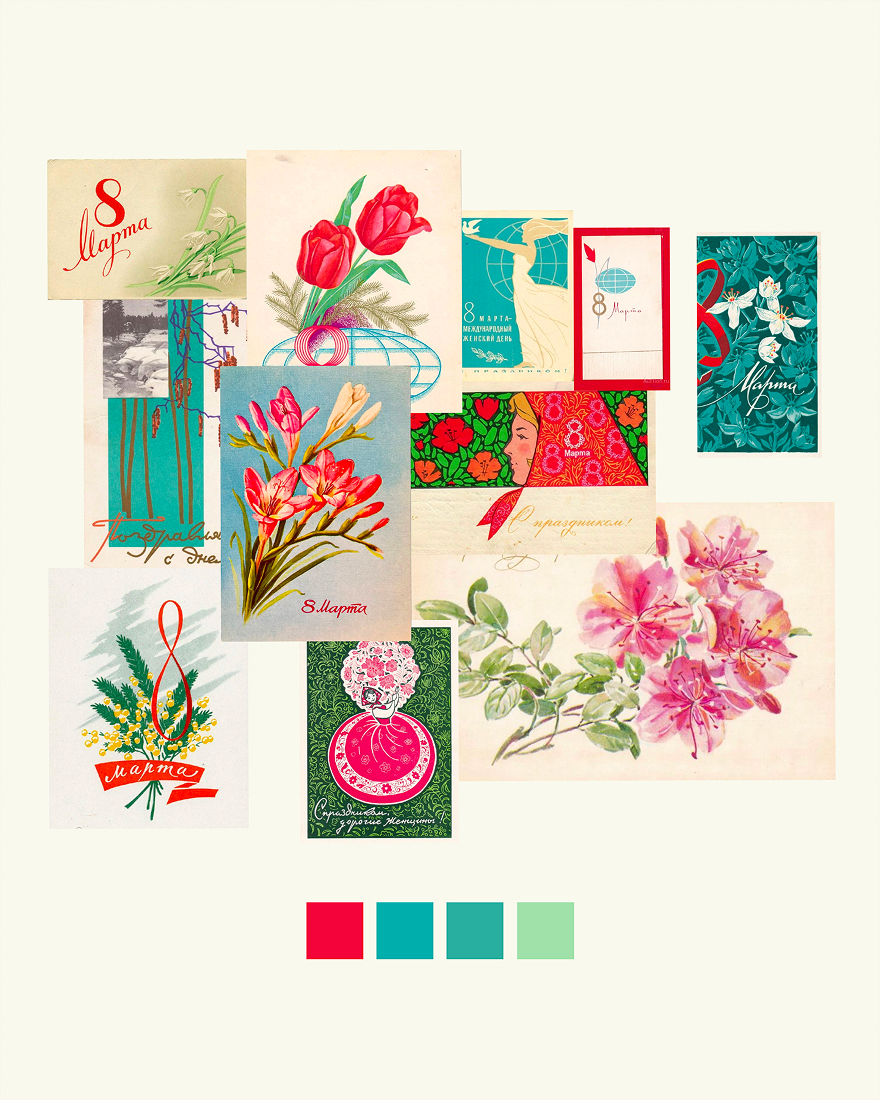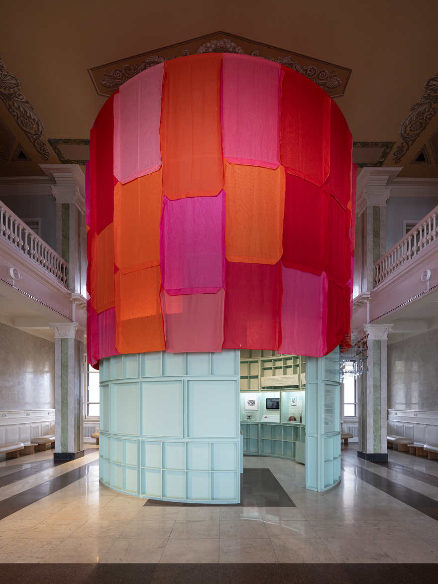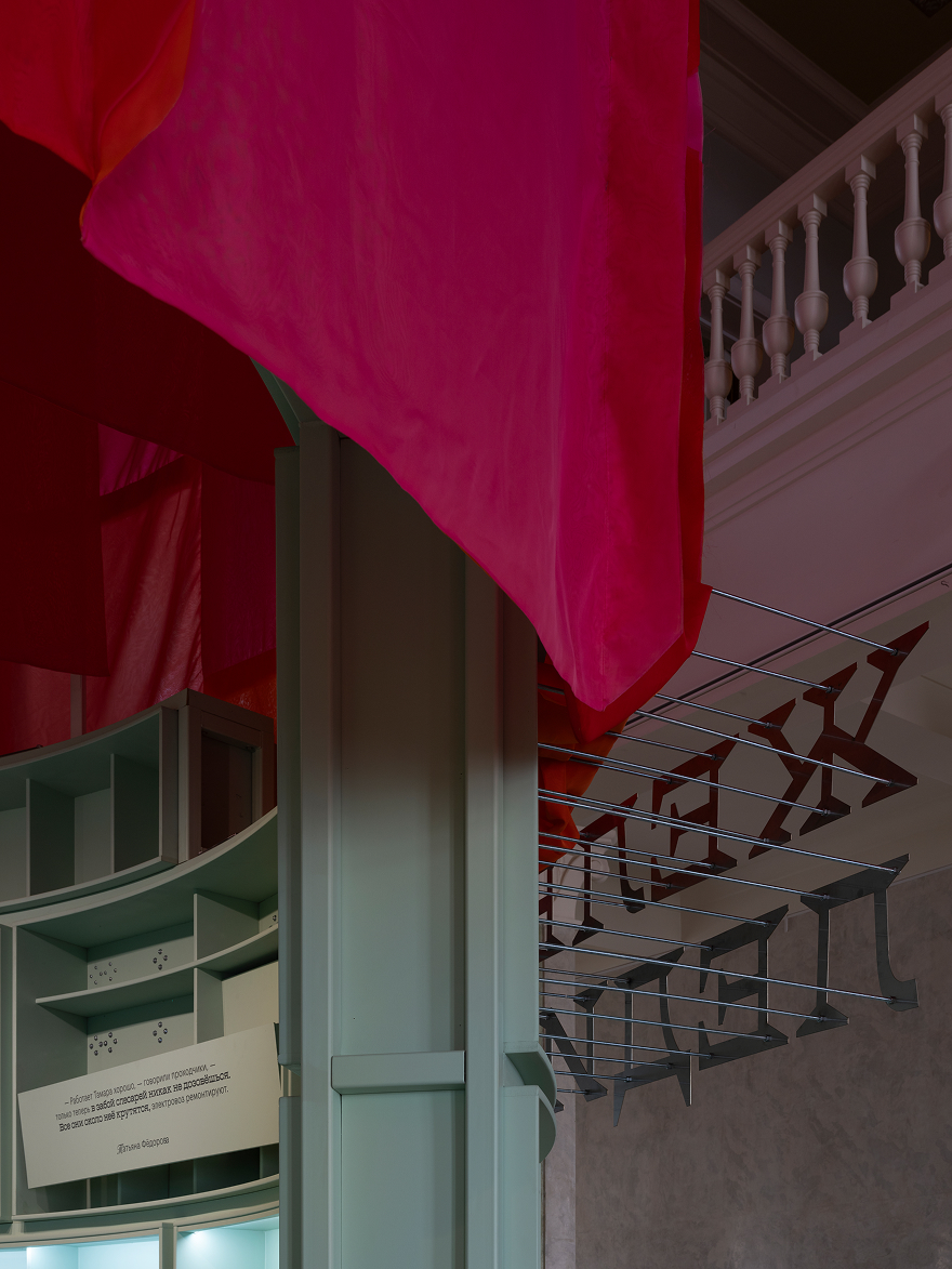 Цилиндрическое выставочное пространство венчает кольцо из полупрозрачной ткани. Авторы вдохновились классическими открытками к 8 марта. Колористическим решением проекта стали зеленые и красные оттенки, а сама инсталляция напоминает пиксельное изображение тюльпана. Эстетика ретро воплощена как в знаке по внешнему периметру инсталляции, так и в графическом оформлении текстов. Объект одновременно монументальный и изысканный, это гармоничный союз противоположностей, на котором строится концепция всего выставочного проекта.