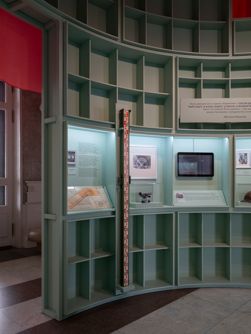 Основной концепцией стали конструктивные элементы тоннелей. Витрины и ниши выполнены в виде трубчатых опор и разделены на модульные секции. Их ритм рушится в верхней части цилиндра, ведь метро — живая конструкция, находящаяся в постоянной эволюции, и его история еще не завершена новыми поколениями строителей.