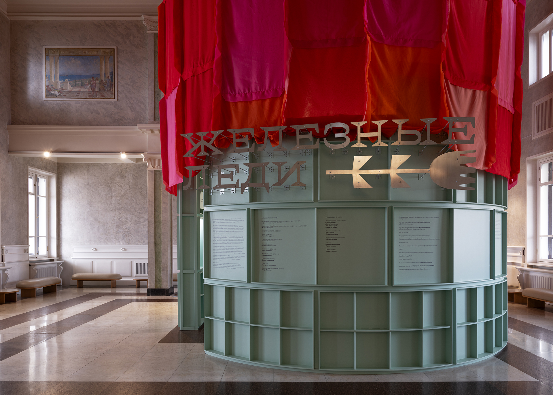 Цилиндрическое выставочное пространство венчает кольцо из полупрозрачной ткани. Авторы вдохновились классическими открытками к 8 марта. Колористическим решением проекта стали зеленые и красные оттенки, а сама инсталляция напоминает пиксельное изображение тюльпана. Эстетика ретро воплощена как в знаке по внешнему периметру инсталляции, так и в графическом оформлении текстов. Объект одновременно монументальный и изысканный, это гармоничный союз противоположностей, на котором строится концепция всего выставочного проекта.