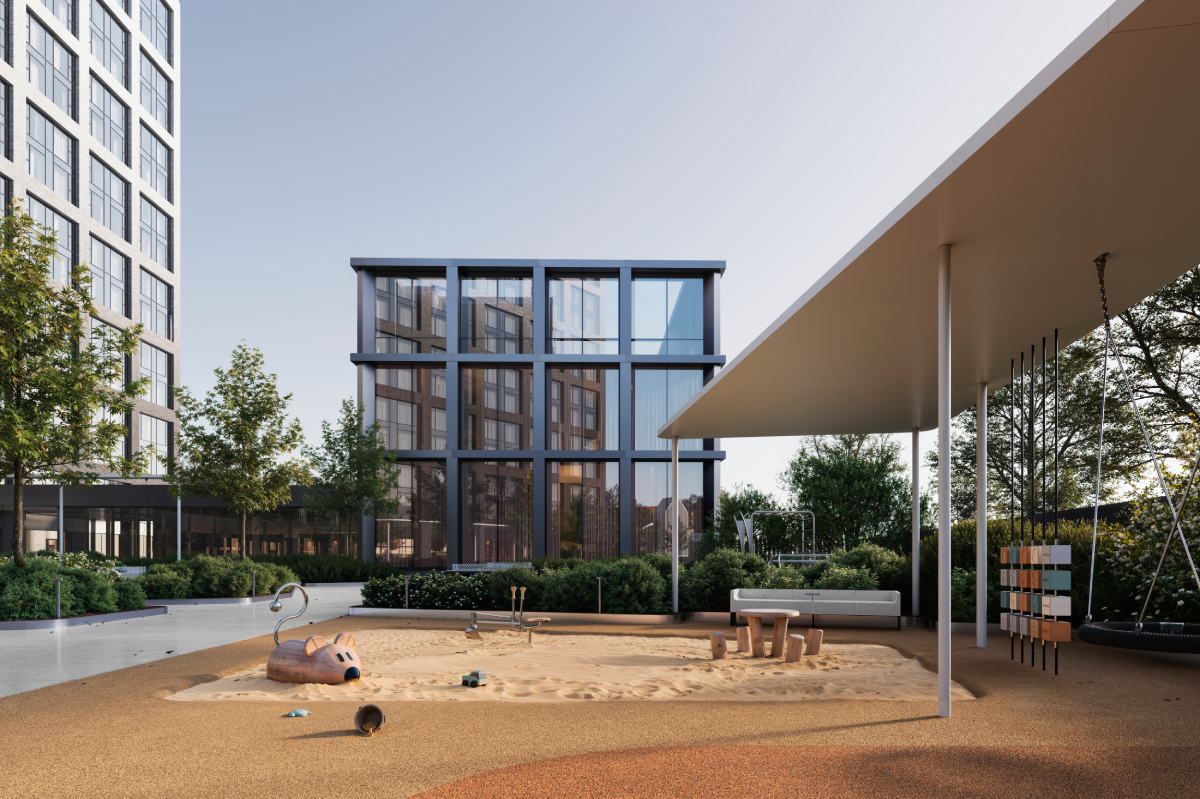 Внутри комплекса будет отдельная детская игровая площадка и большая игровая площадка для школьников с безопасным покрытием. Пространство двора дополнят тренировочная площадка, открытая площадка для семейных торжеств и стеклянная крыша с рабочими местами, а также зеленая зона с качелями для взрослых. Вдоль уличных пешеходных маршрутов разместятся амфитеатр, террасы кафе, скамейки, кресла и столики.