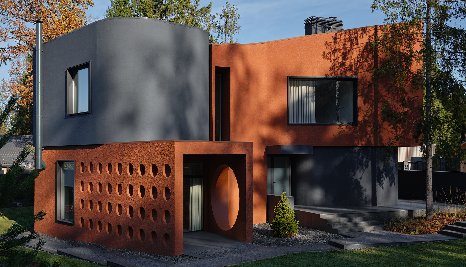 «Дом площадью 222 кв. метра расположен в коттеджном поселке «Лисичкин лес». Помимо своих функциональных задач, этот проект исследует актуальную тему во времена кризиса смыслов. Он ставит под сомнение принцип, что все в архитектуре должно быть подчинено определенному смыслу, а красота, композиция и гармония форм не могут возникнуть сами по себе и непременно требуют какого-то дополнительного обоснования», — поясняет Сергей Колчин. — Подход оправдал себя: активная форма в сочетании с пластикой, геометрией и цветом не содержит повествовательных противоречий. Несмотря на всю свою сложность, она кажется понятной и в то же время не требует никаких пояснений.