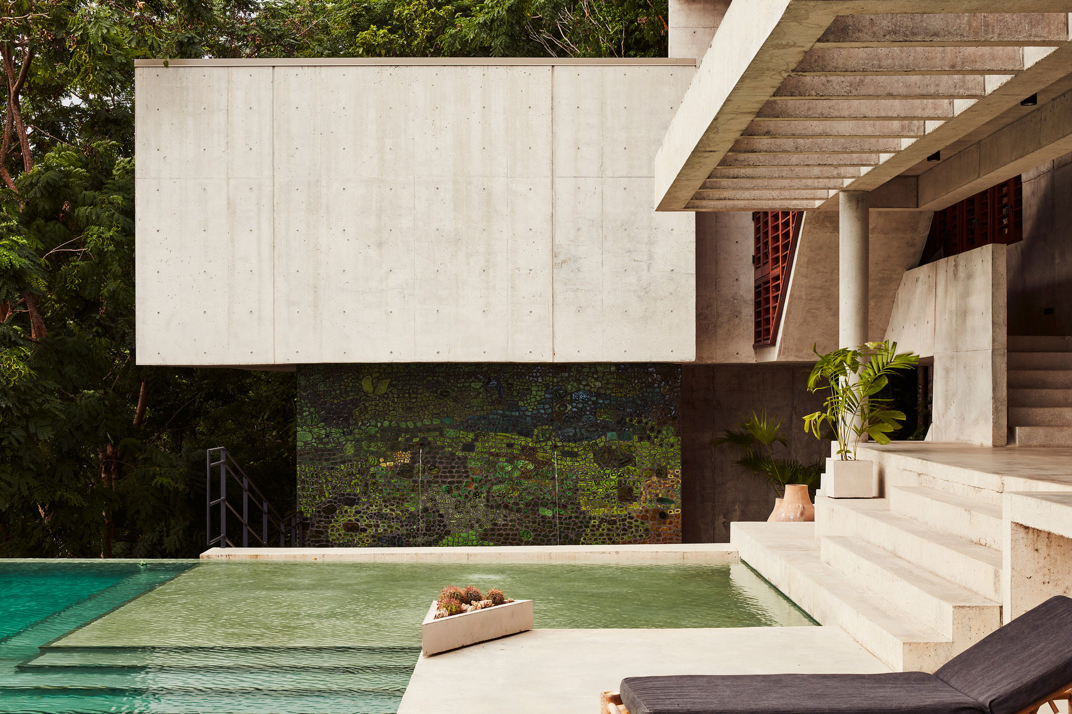Проект, расположенный в месте с идиллическими тропическими пейзажами и редкой эндемичной флорой, требовал подходящего окружения. Это было бетонное здание, спроектированное Freecell Architecture и Gia Wolff Studio по образцу лучших образцов тропического модернизма – светлое и открытое, несмотря на солидность и массивность материала. Визуальное наслоение текстур, ритмов и материалов в Pompey напоминает трек, сформированный из смеси ярких этнических и современных узоров.