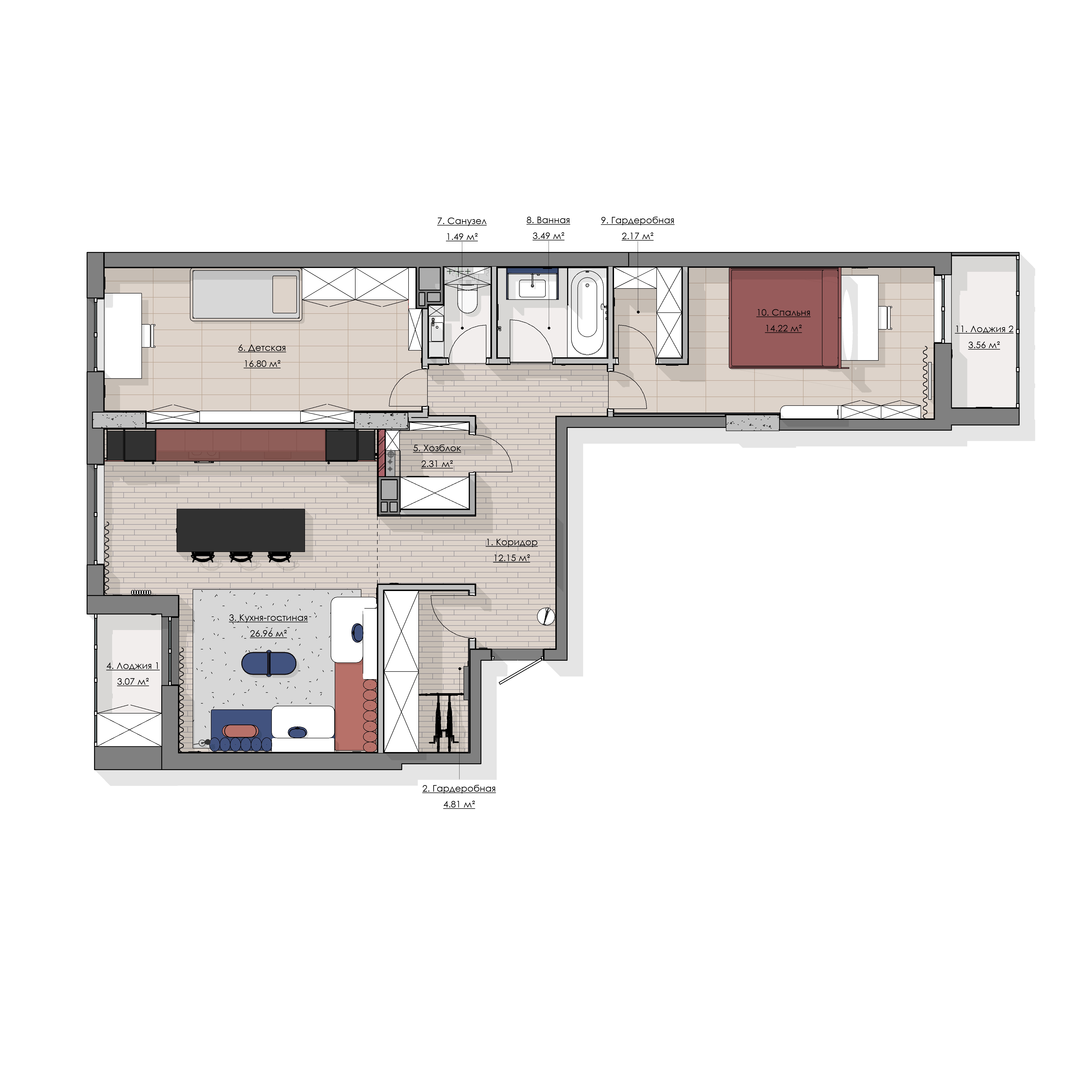 «Мы провели перепланировку с полной реорганизацией функциональных пространств. Исходное пространство имело существенные недостатки – темный коридор, занимавший полезное пространство, и слишком маленькая кухня. Моей задачей было сделать так, чтобы пространство постепенно открывалось по мере перемещения по квартире. Концепция основана на четком зонировании: я выделила три основные зоны – компактную прихожую, общую зону кухни-гостиной и приватную часть со спальней и кабинетом. Здесь, у входа в спальню, расположена закрытая гардеробная. Мы обустроили раздельный санузел, выделили отдельное подсобное помещение для стиральной машины и сушилки, а также установили просторную гардеробную в коридоре. Одна из комнат не была меблирована – проводились только отделочные работы, чтобы в дальнейшем оборудовать там детскую комнату.