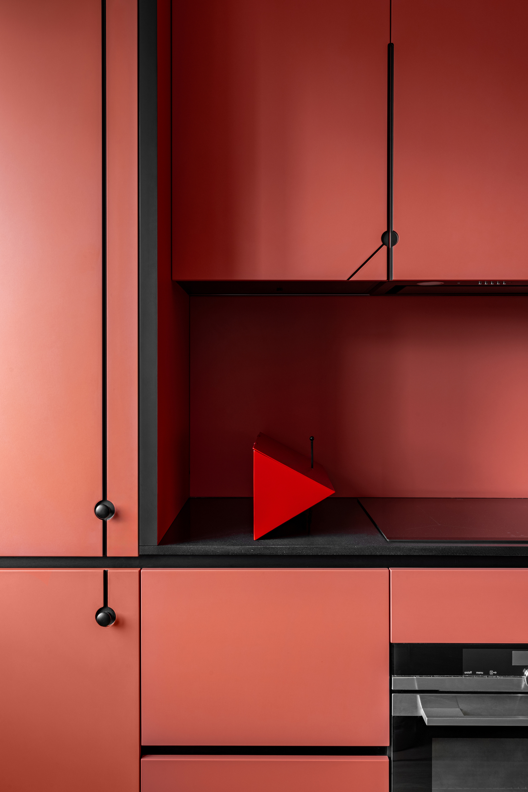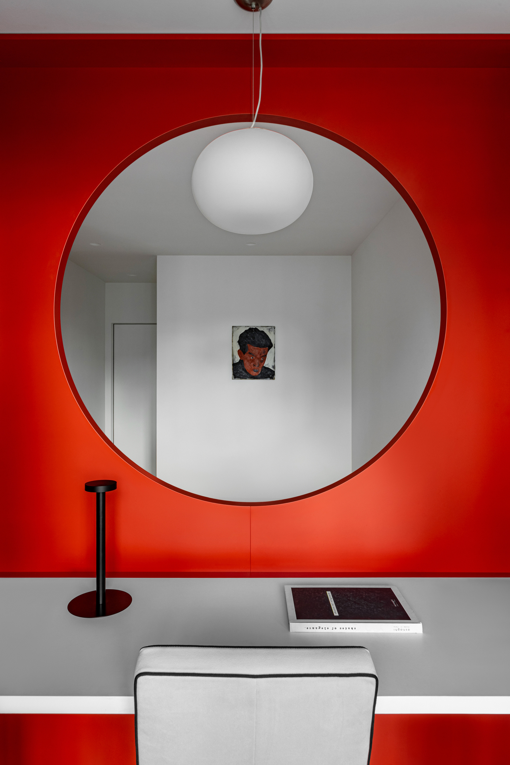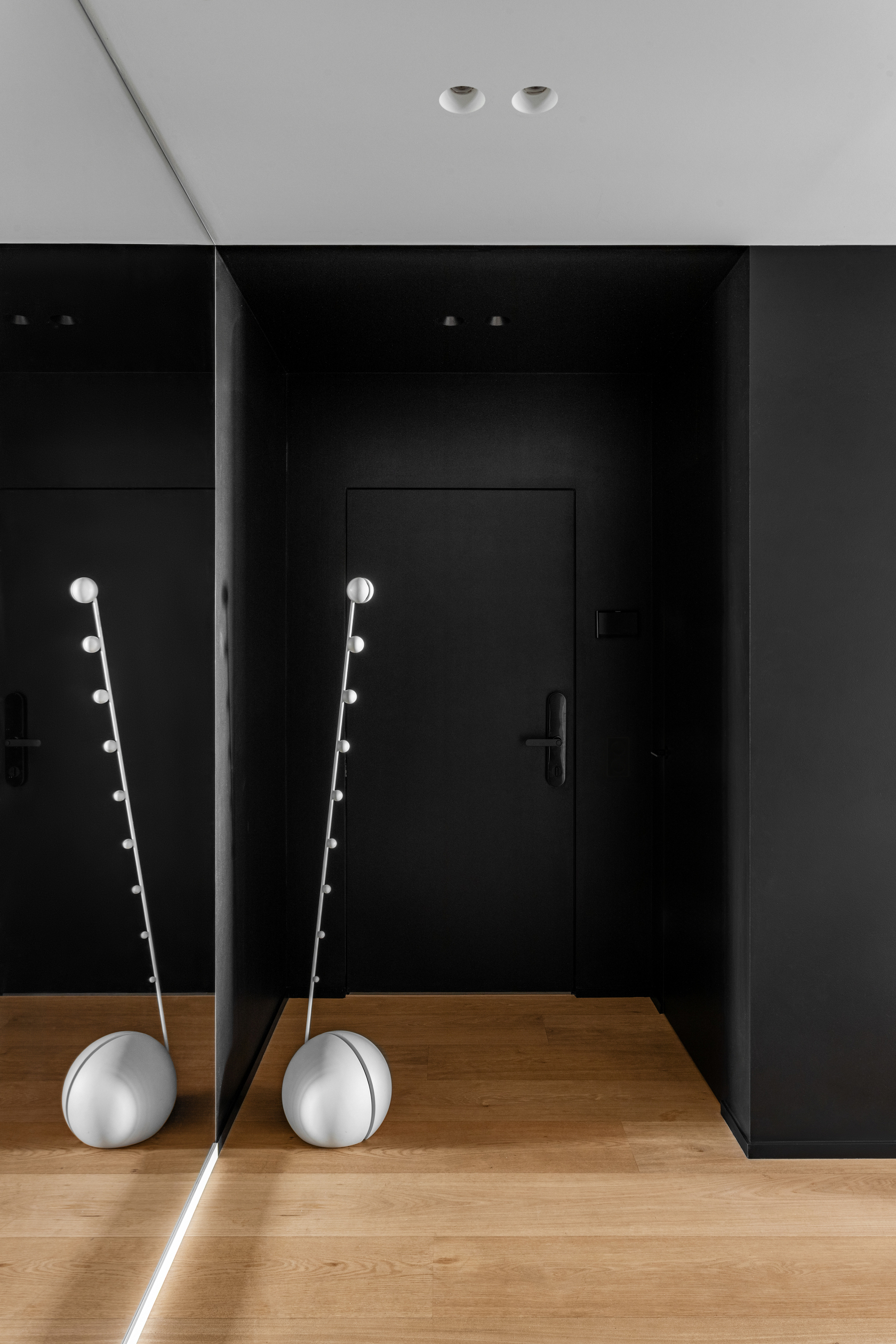 «Когда человек входит в квартиру, он не видит все комнаты сразу — я называю этот сценарий «антипочтой». Коридор я оформил в виде черной рамы, на фоне которой контрастно выделяется белая вешалка. Зеркало по всей длине стены в коридоре отражает свет из гостиной, визуально расширяя пространство. А путь в личное пространство подчеркнут сложным цветом «Falun Red», который создает мощный акцент. При проектировании я использовал свет максимально естественный, в том числе достигнутый за счет Уменьшив площадь освещения коридора, я оформил каждую зону как цельный объем, тщательно выверяя их пропорции и масштаб по отношению друг к другу, чтобы добиться гармоничного восприятия всего пространства.