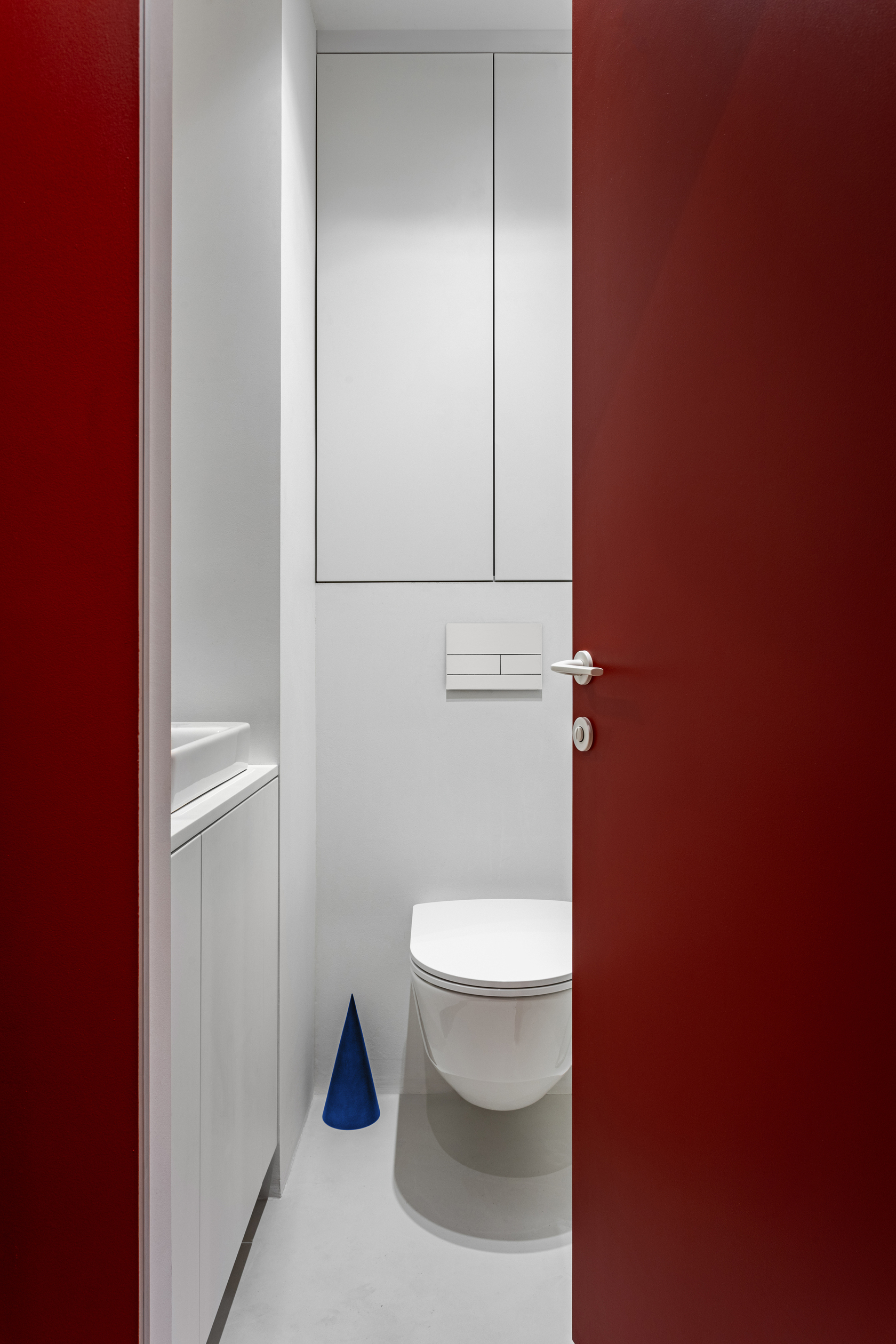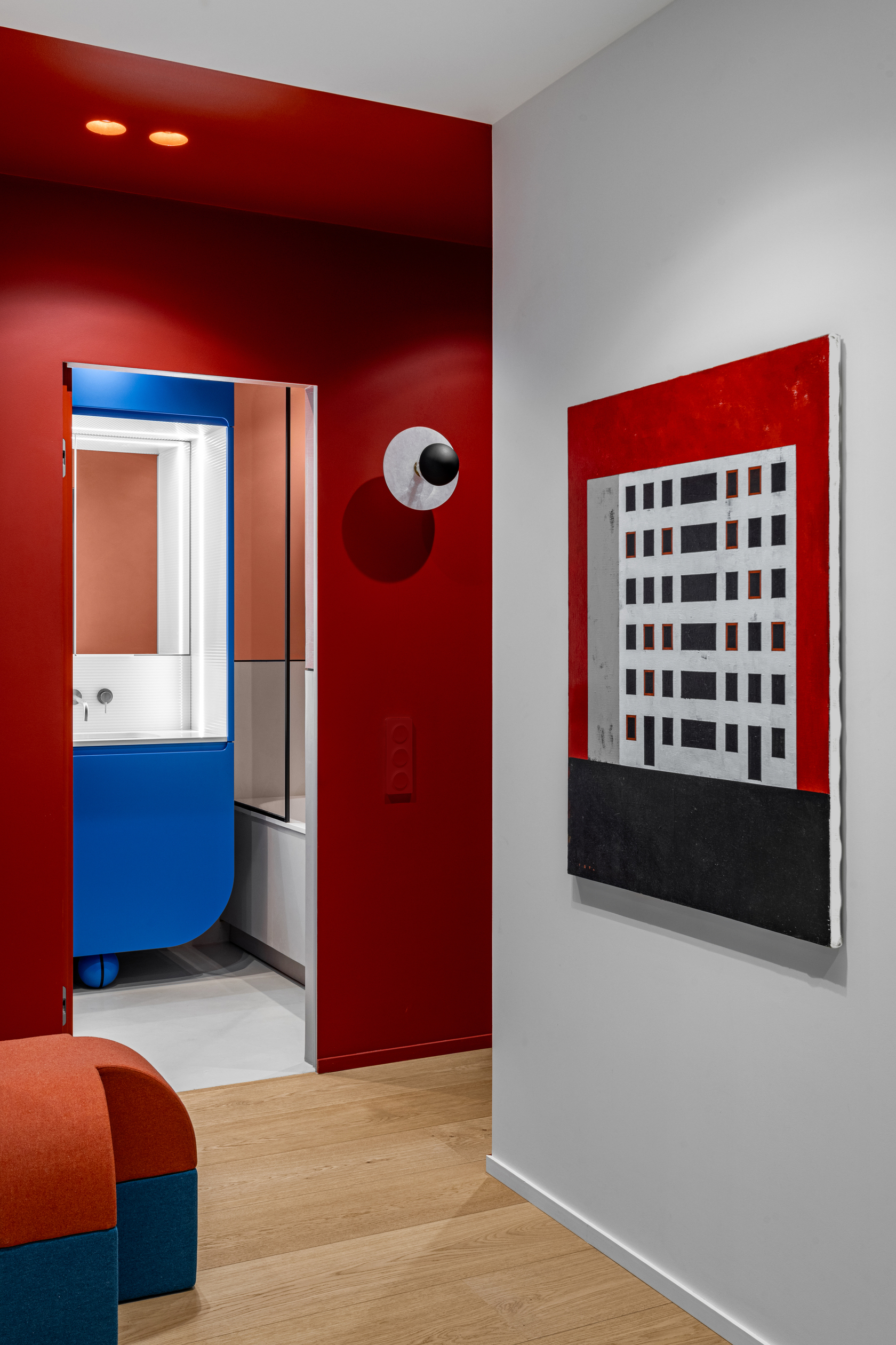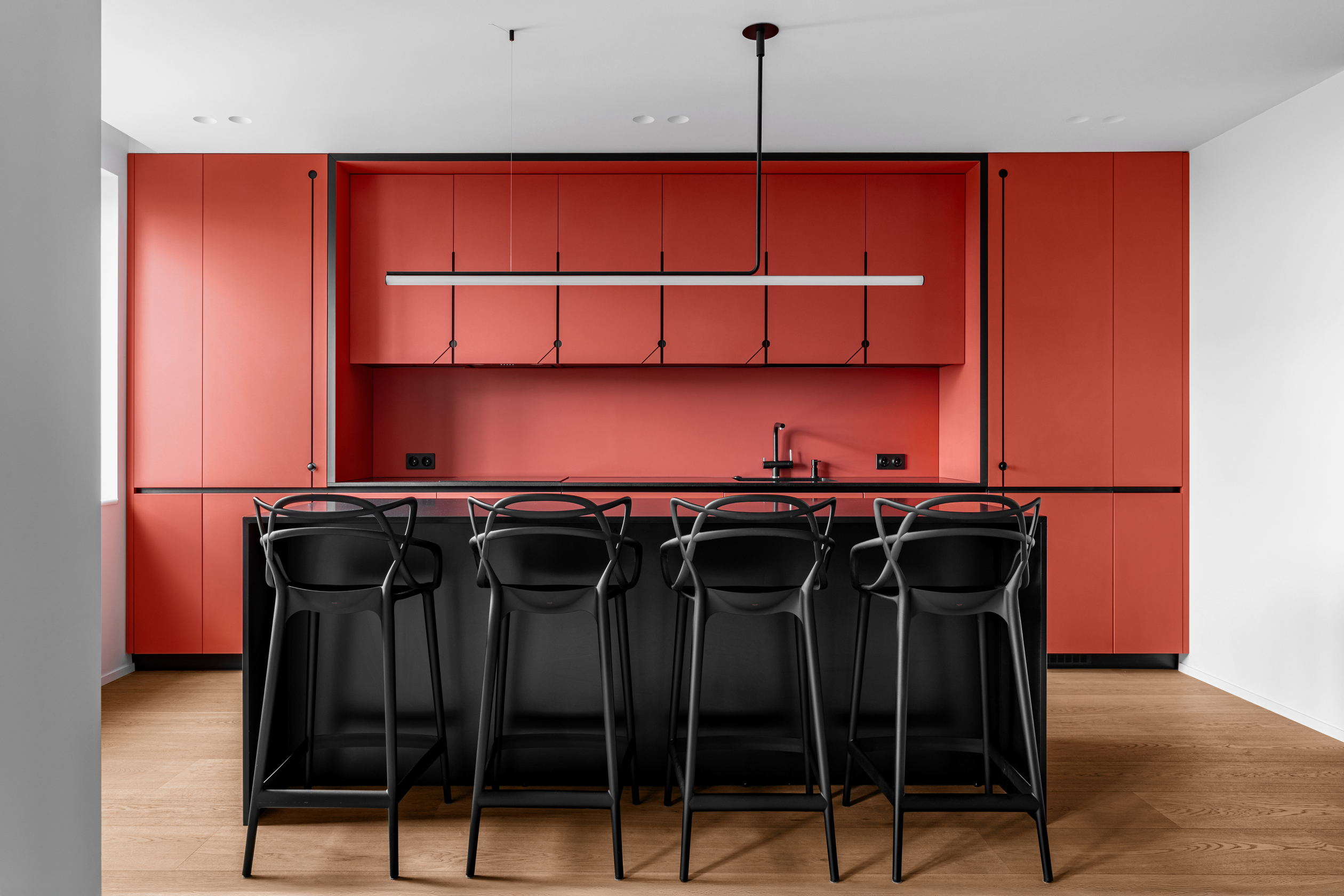 «Когда человек входит в квартиру, он не видит все комнаты сразу — я называю этот сценарий «антипочтой». Коридор я оформил в виде черной рамы, на фоне которой контрастно выделяется белая вешалка. Зеркало по всей длине стены в коридоре отражает свет из гостиной, визуально расширяя пространство. А путь в личное пространство подчеркнут сложным цветом «Falun Red», который создает мощный акцент. При проектировании я использовал свет максимально естественный, в том числе достигнутый за счет Уменьшив площадь освещения коридора, я оформил каждую зону как цельный объем, тщательно выверяя их пропорции и масштаб по отношению друг к другу, чтобы добиться гармоничного восприятия всего пространства.