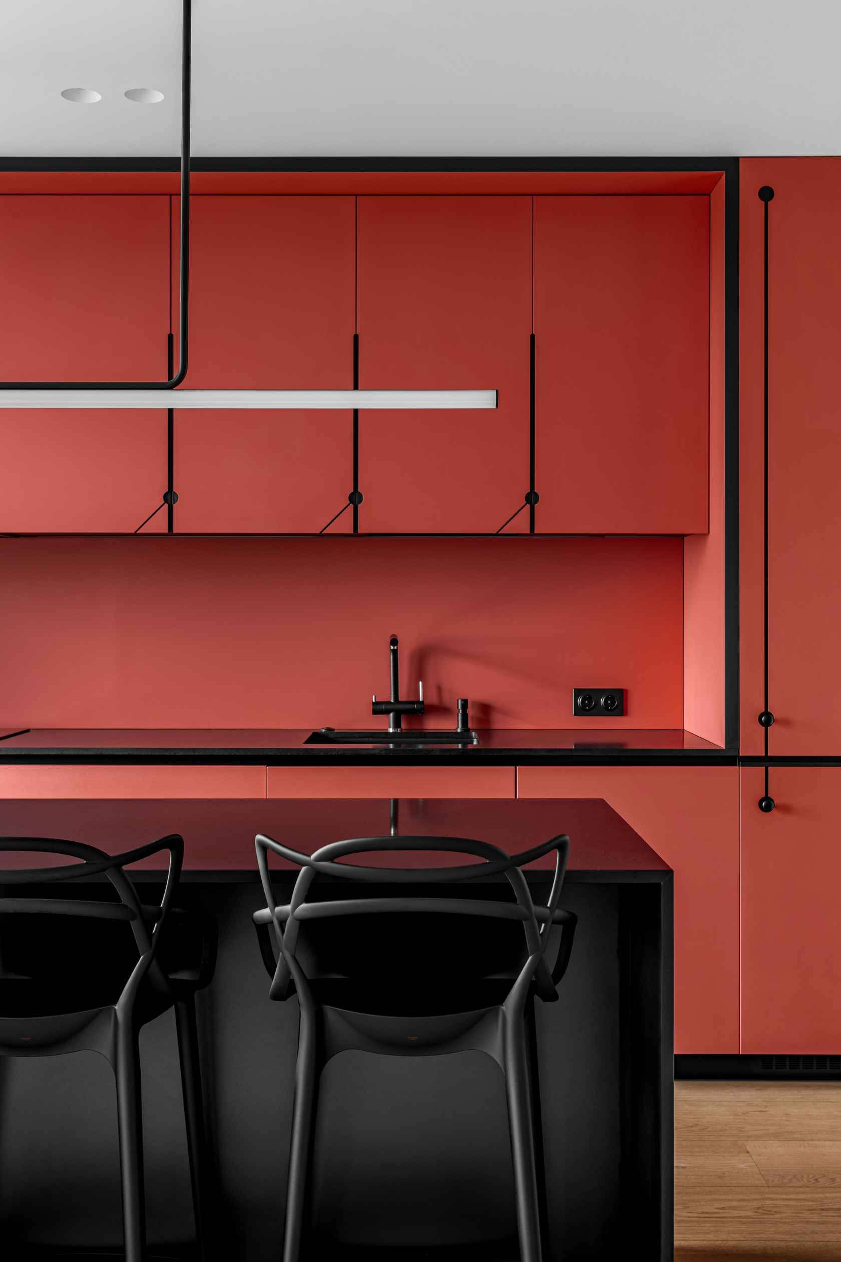 «Дизайн кухни навеян джазовыми гитарными импровизациями. Черная графическая фрезеровка на замысловатом лососевом фоне — метафора натянутых струн, а диагональные скаты символизируют переход в другую тональность. Напротив — зона отдыха с модульным диваном, где тема «струн» продолжается в графических полосах на стене, соединяющих все в единую композицию».