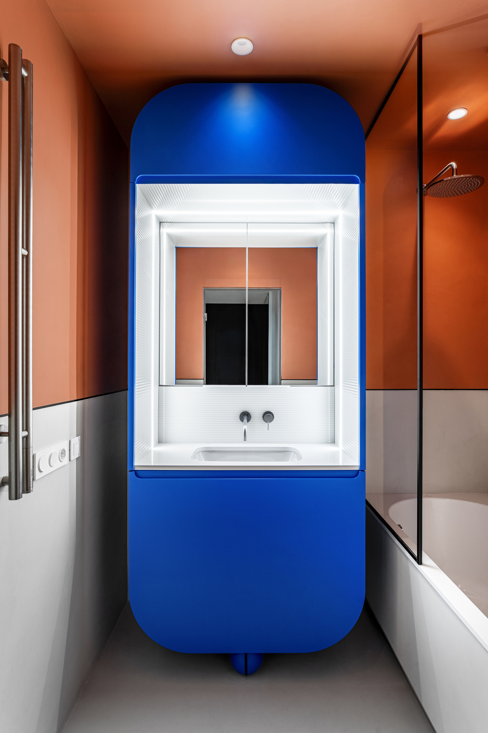 «Особой гордостью меня стала «капсула чистоты» в ванной комнате – реализация давней идеи собственного футуристического «Мойдодыра». Это максимально функциональный объект со встроенными системами хранения, освещением, зеркалами с подогревом и даже часами с таймером. Корпус изделия выполнен из крашеного МДФ с рельефными вставками из японского стекла AGC. В качестве столешницы использован акриловый камень».