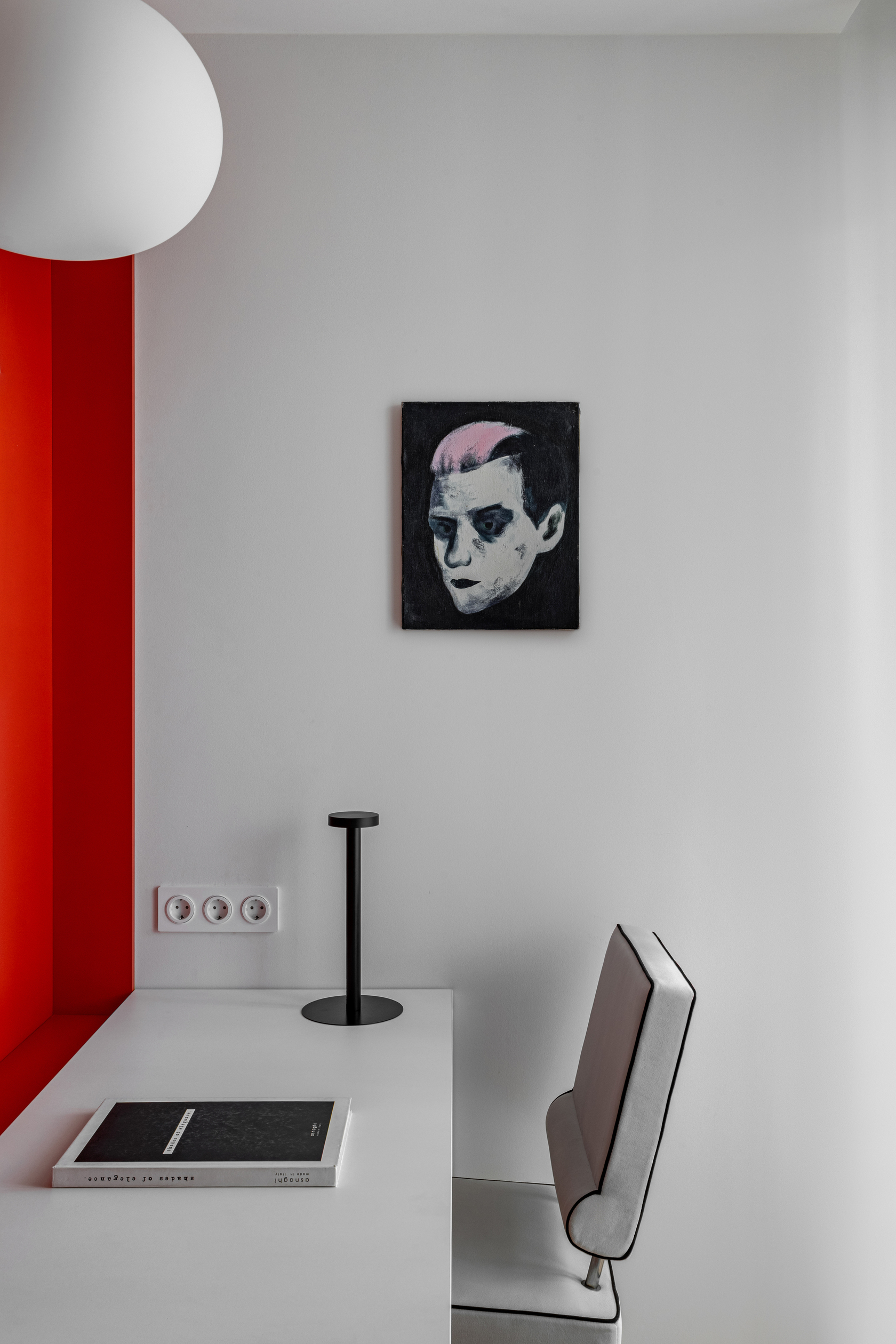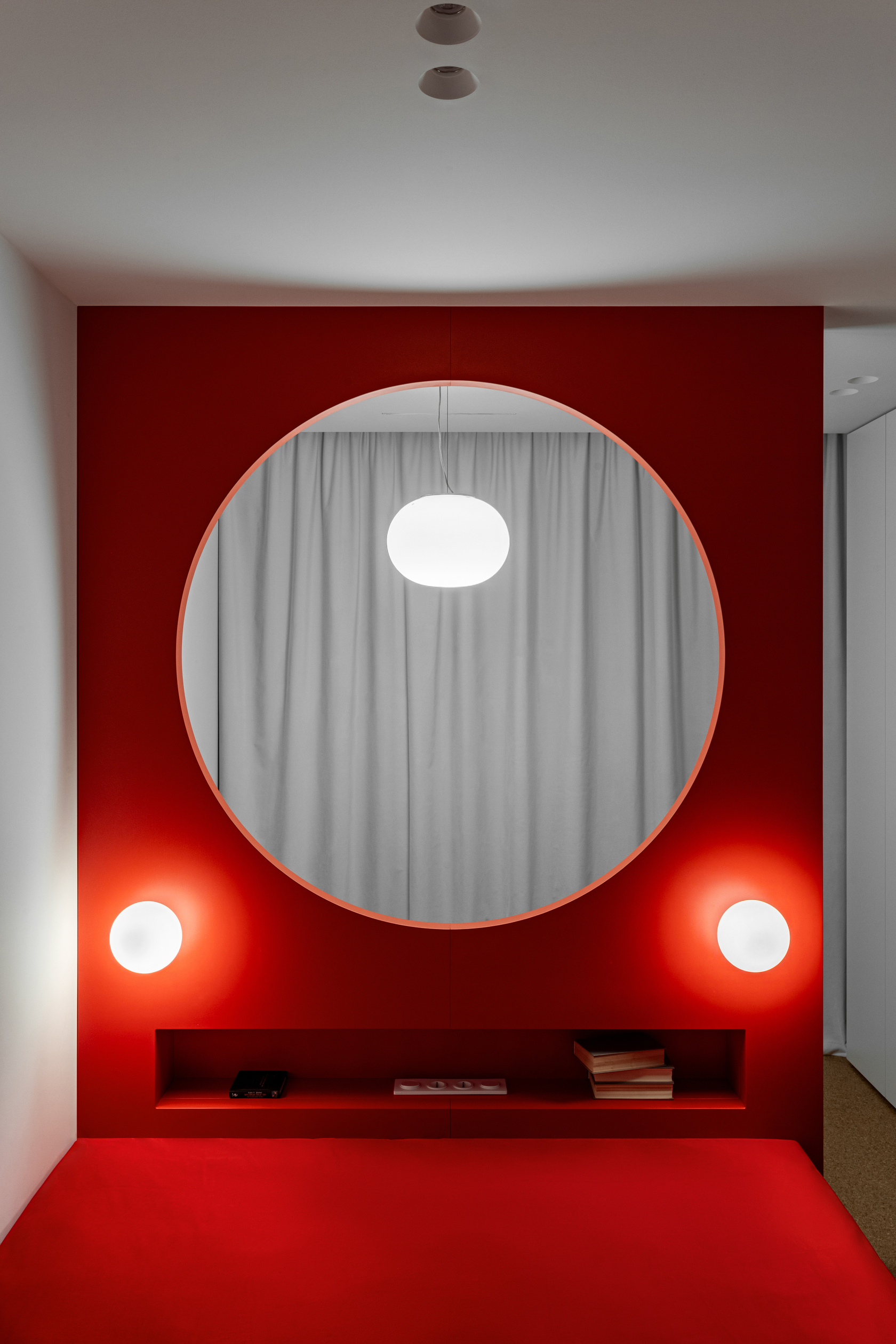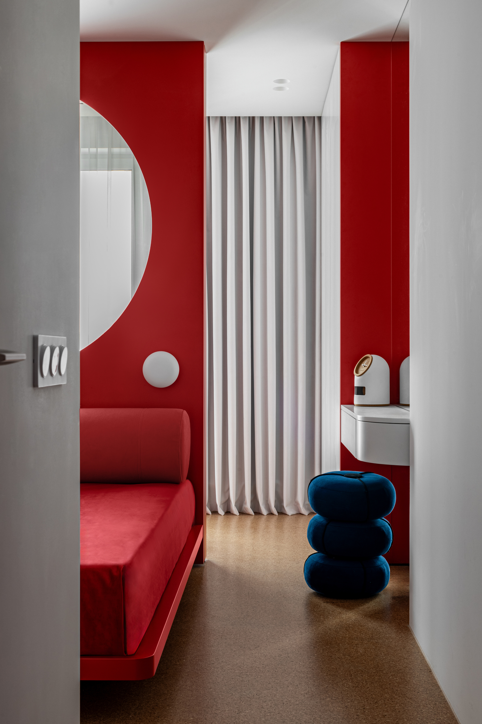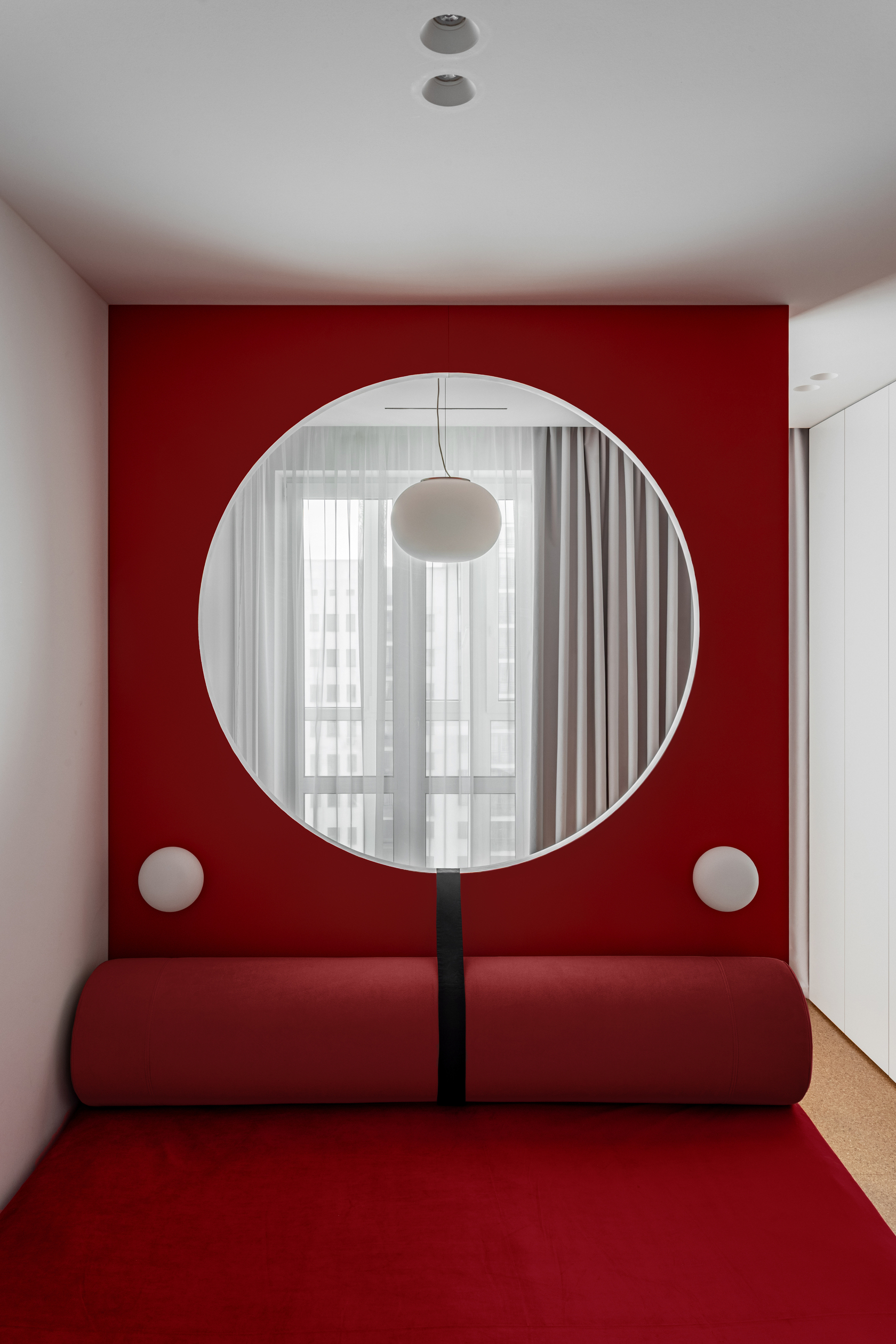 «В спальне главным акцентом стала кровать с большим круглым отверстием у изголовья. Этот элемент выполняет несколько функций: зонирует пространство, пропускает свет и скрывает за собой письменный стол с системой хранения. Плавающее основание кровати балансирует на небольшой сферической опоре, что создает ощущение невесомости, несмотря на массивность предмета».